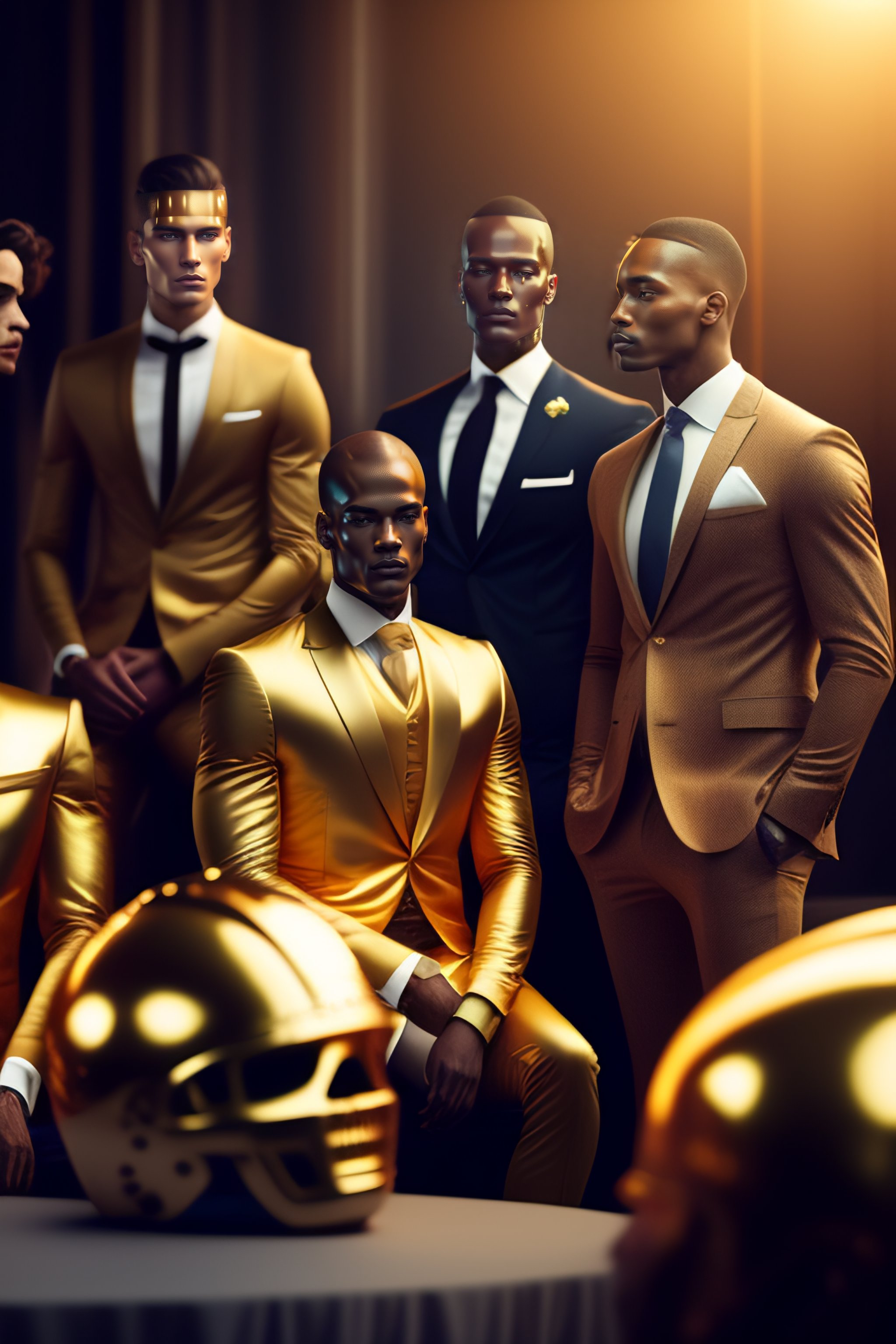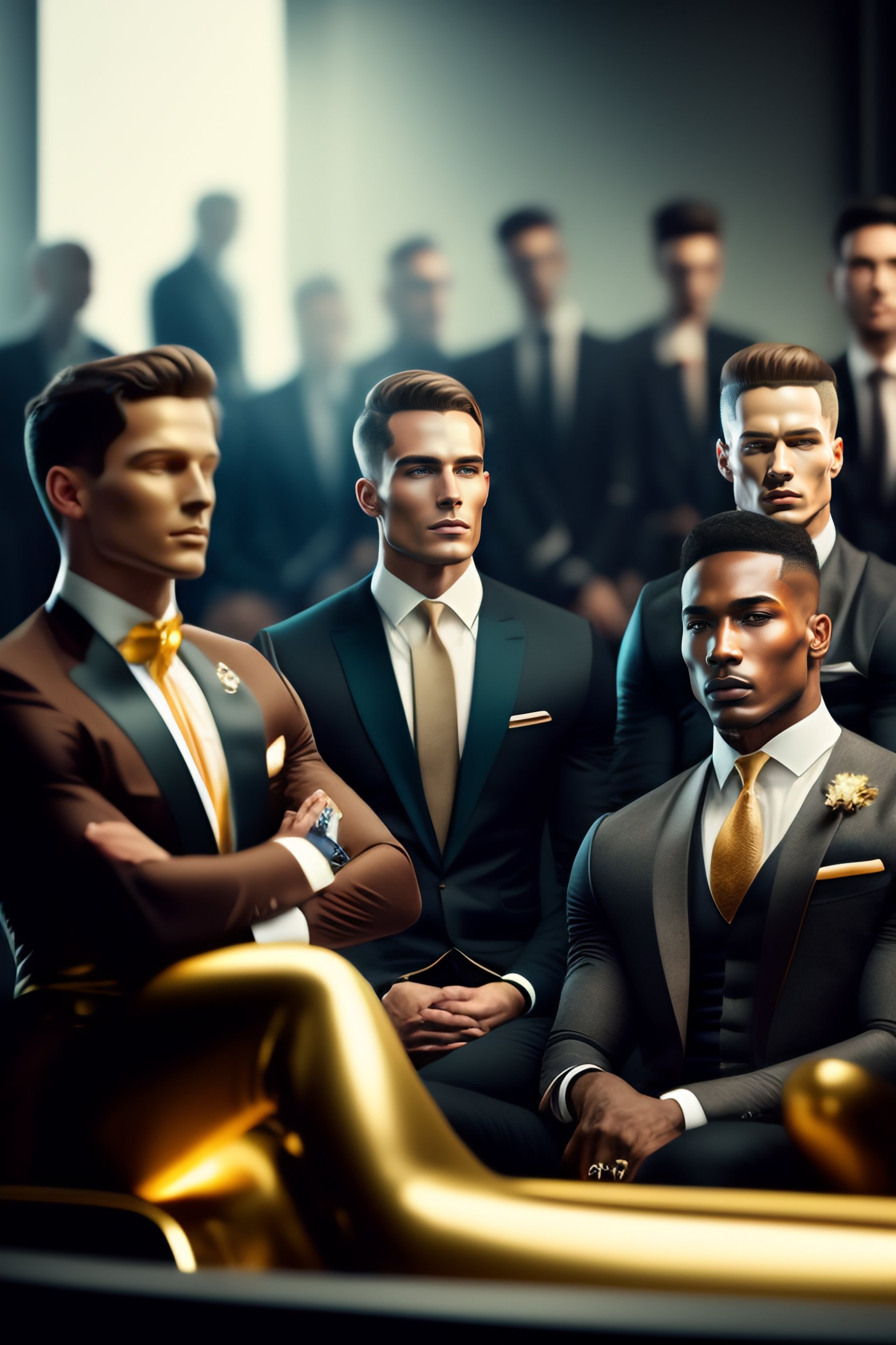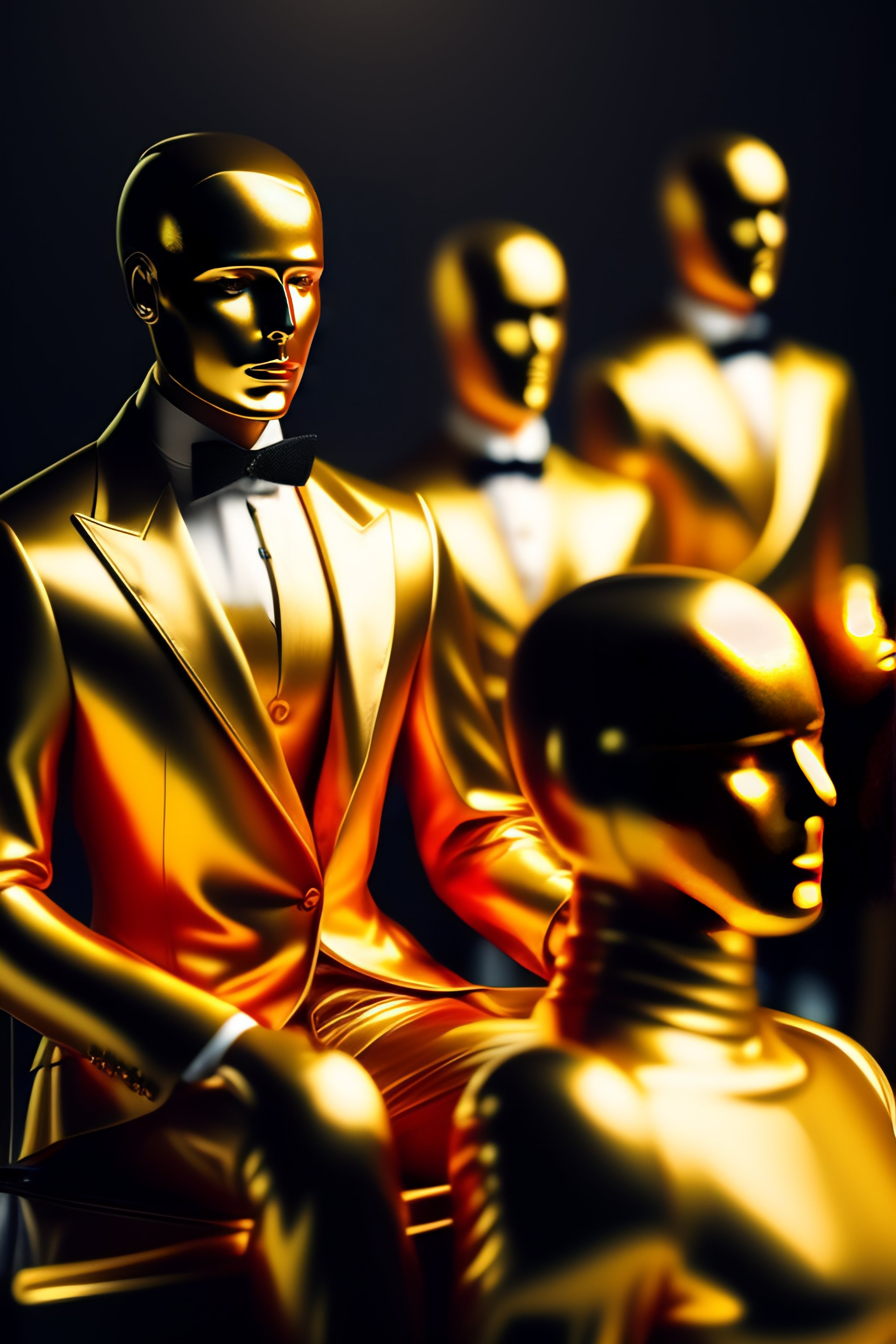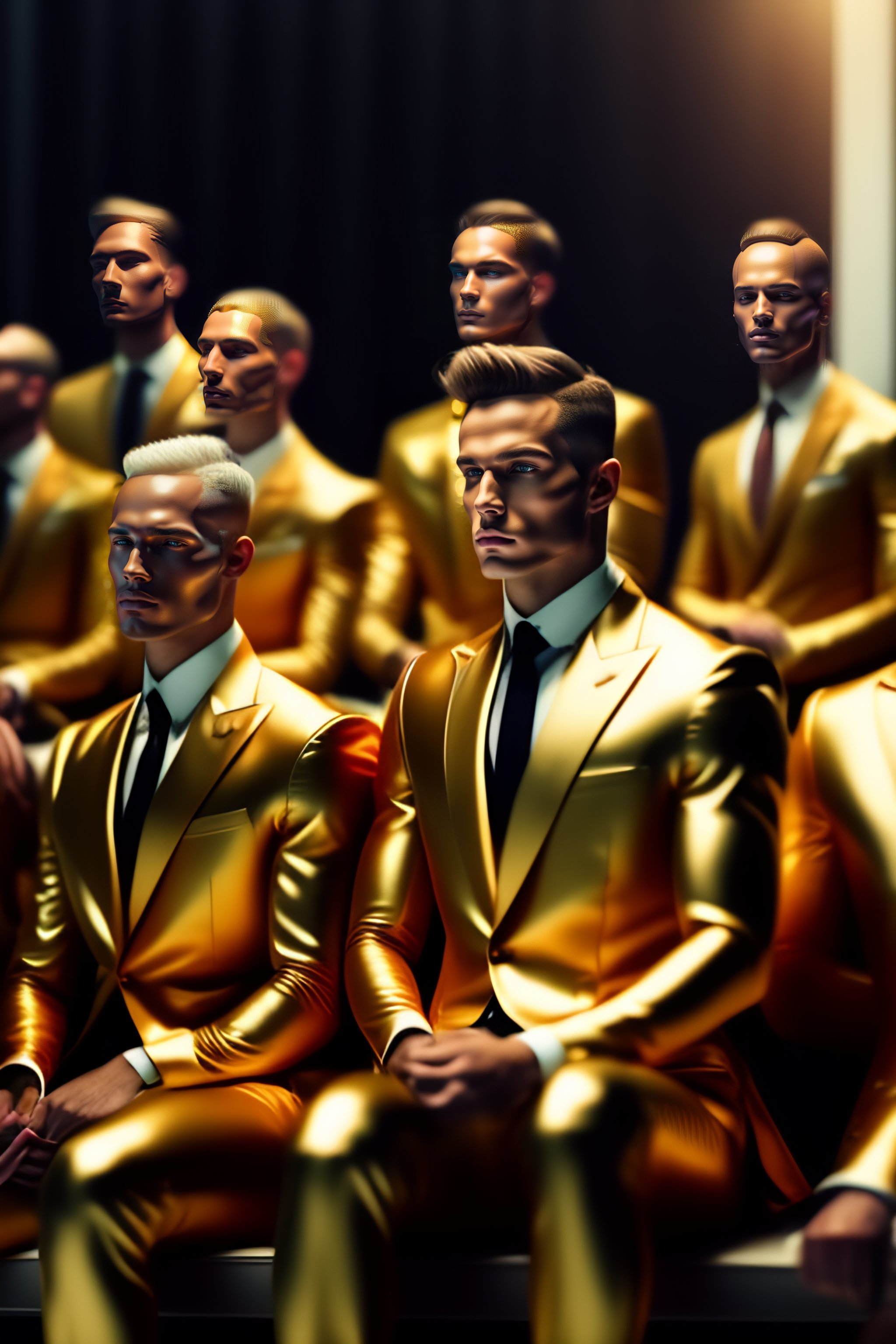 A group of dummy man in 3 piece suit, sitting in a futurist fashion show. hyper realistic, ultra realistic, 8k, concept art, no face but gold color