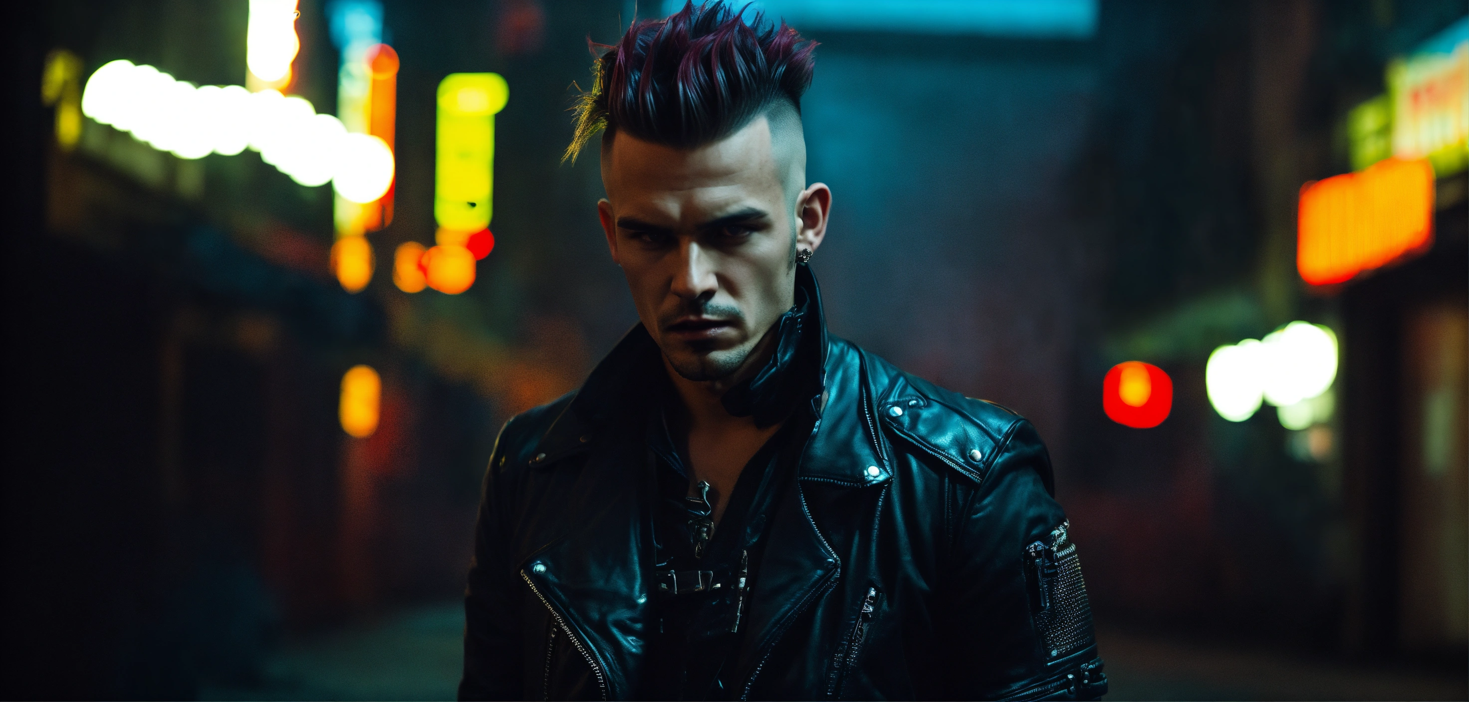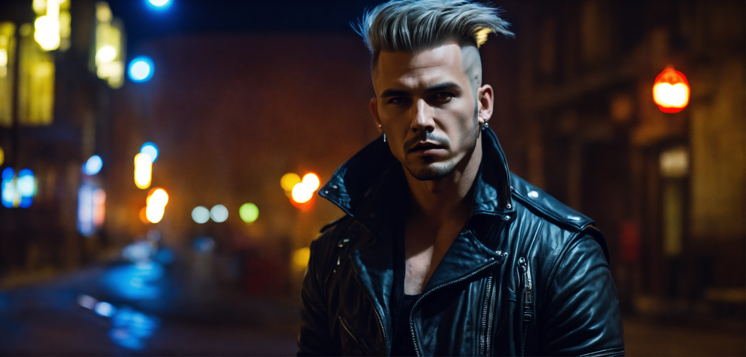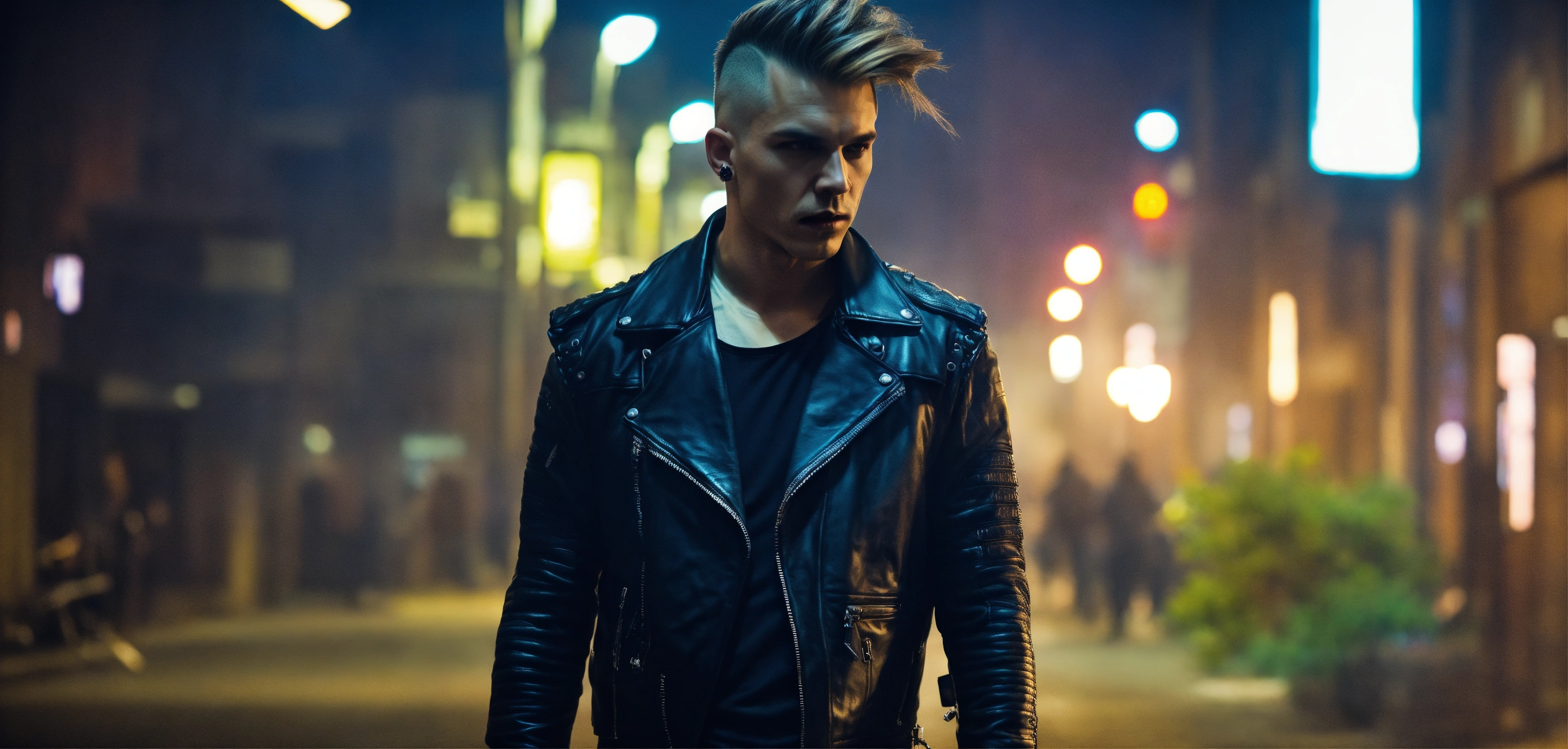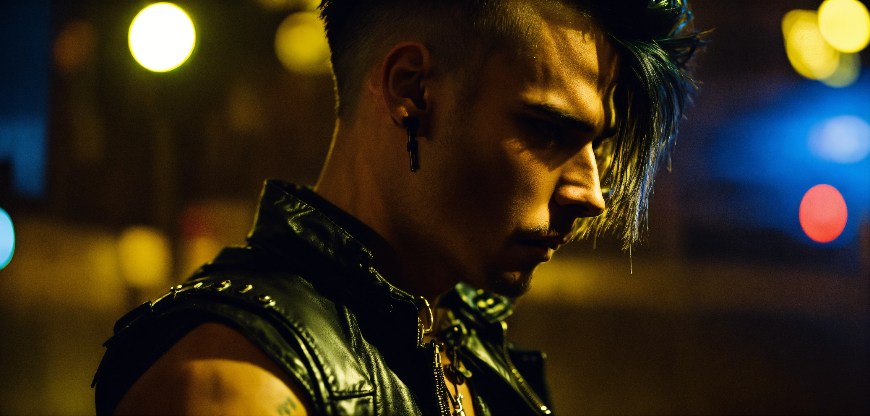 Cinematic look, male punk, leathr biker vest, undercut hairstyle, urban city street by night, haze, underworld vampire movie style