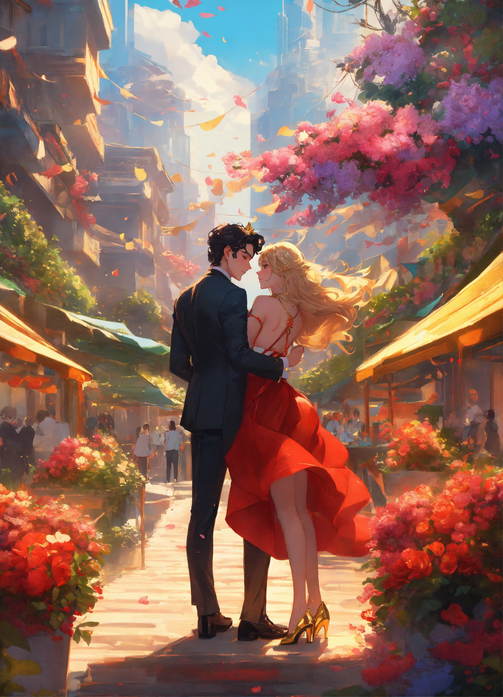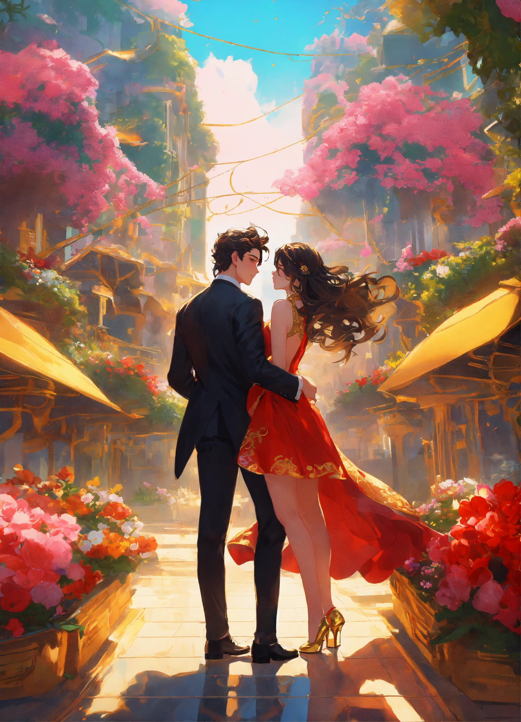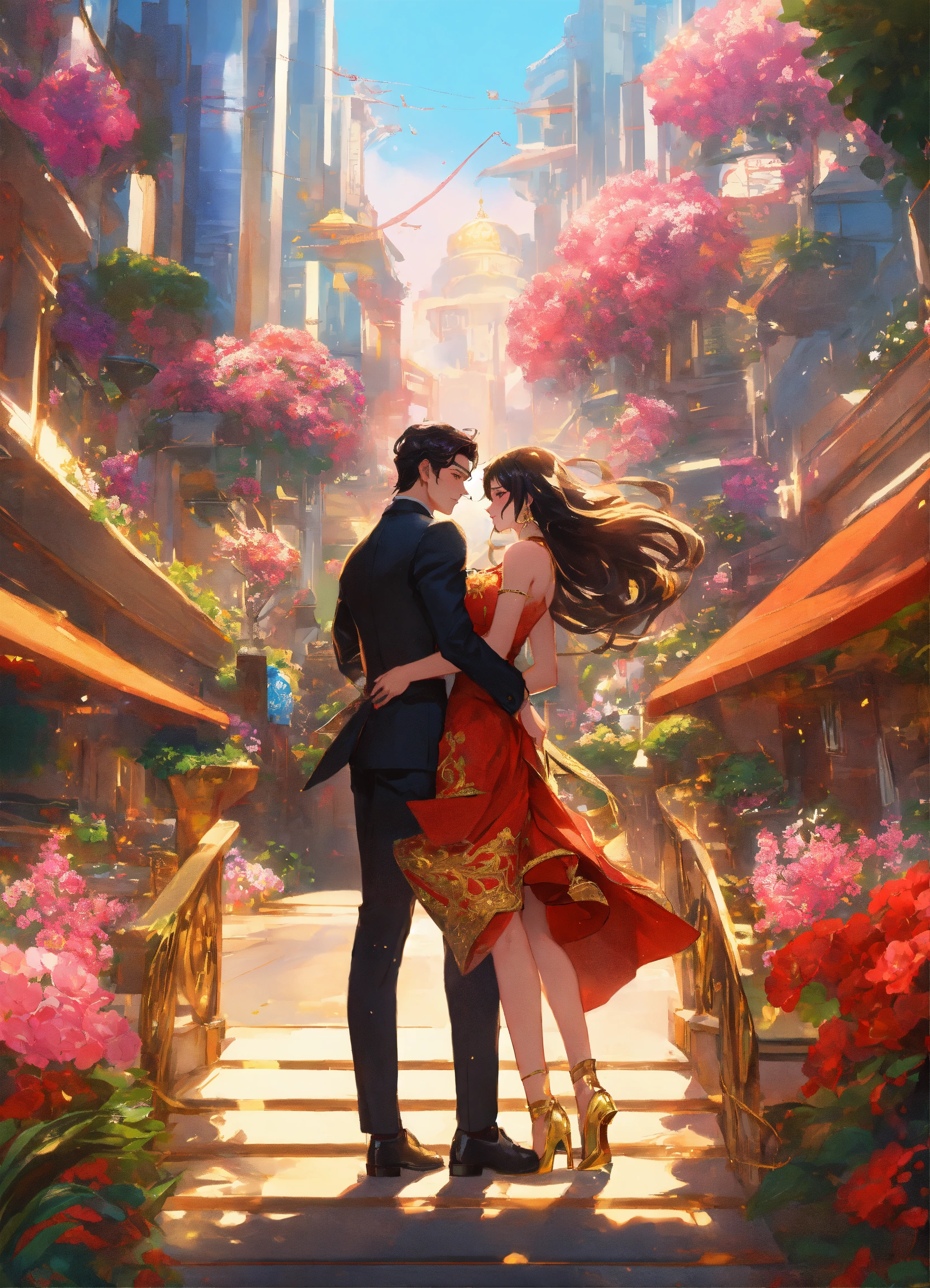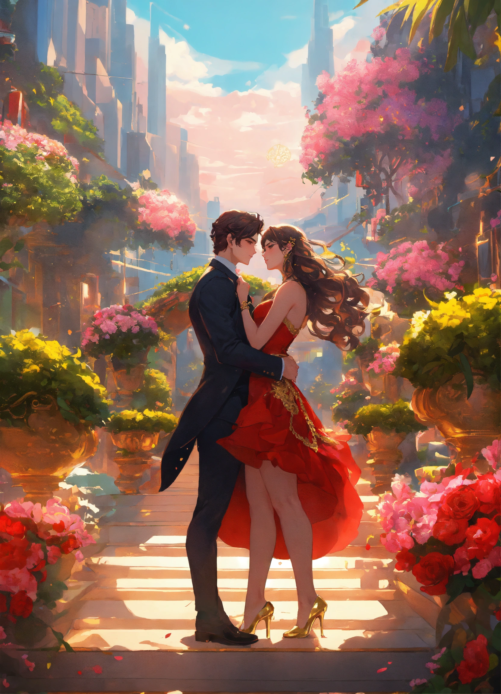 Illustration of beautiful city of towering skyscrapers, islands, vibrant colors, fair skin, the young man wears a intricate black suit with gold ornaments, has wavy black tousled hair, the golden haired woman wears a red intricate dress with gold adornments that shows legs, maximalist, 8k photo, animestyle, by artgerm, by rossdraws, trending on artstation, garden, windy, flowers, circular perspective, romantic, facing each other