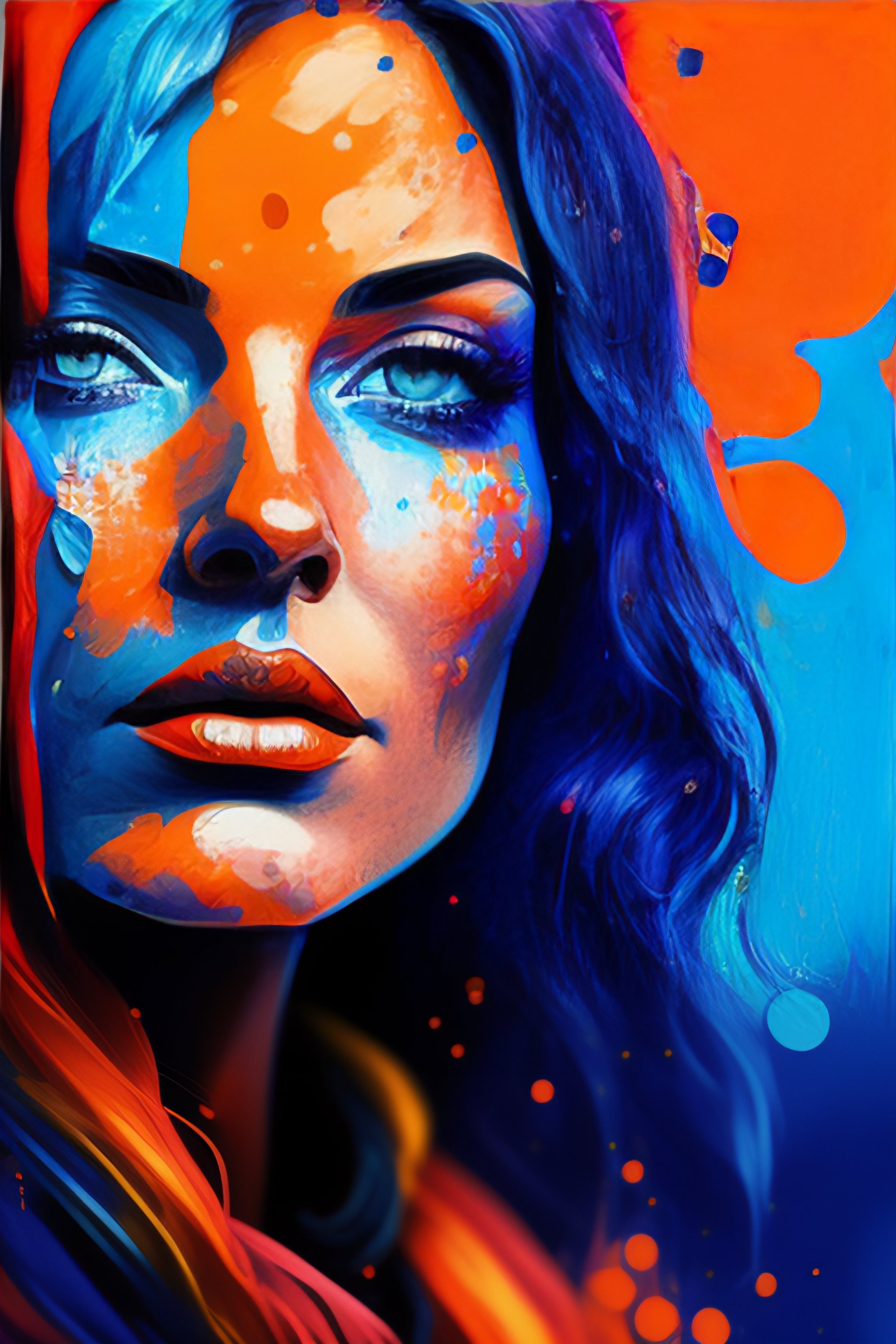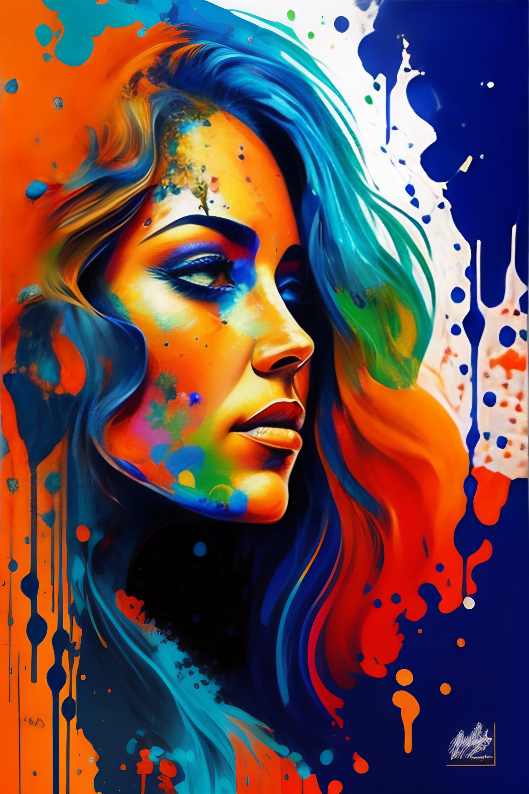 Painted lady, colorful paint splatter style painting, various blues and orange colors, portrait of a rugged tired old painter, thick globs of paint, victorian, splash art style, unfinished concept art, detailed face, fantasy, close up face