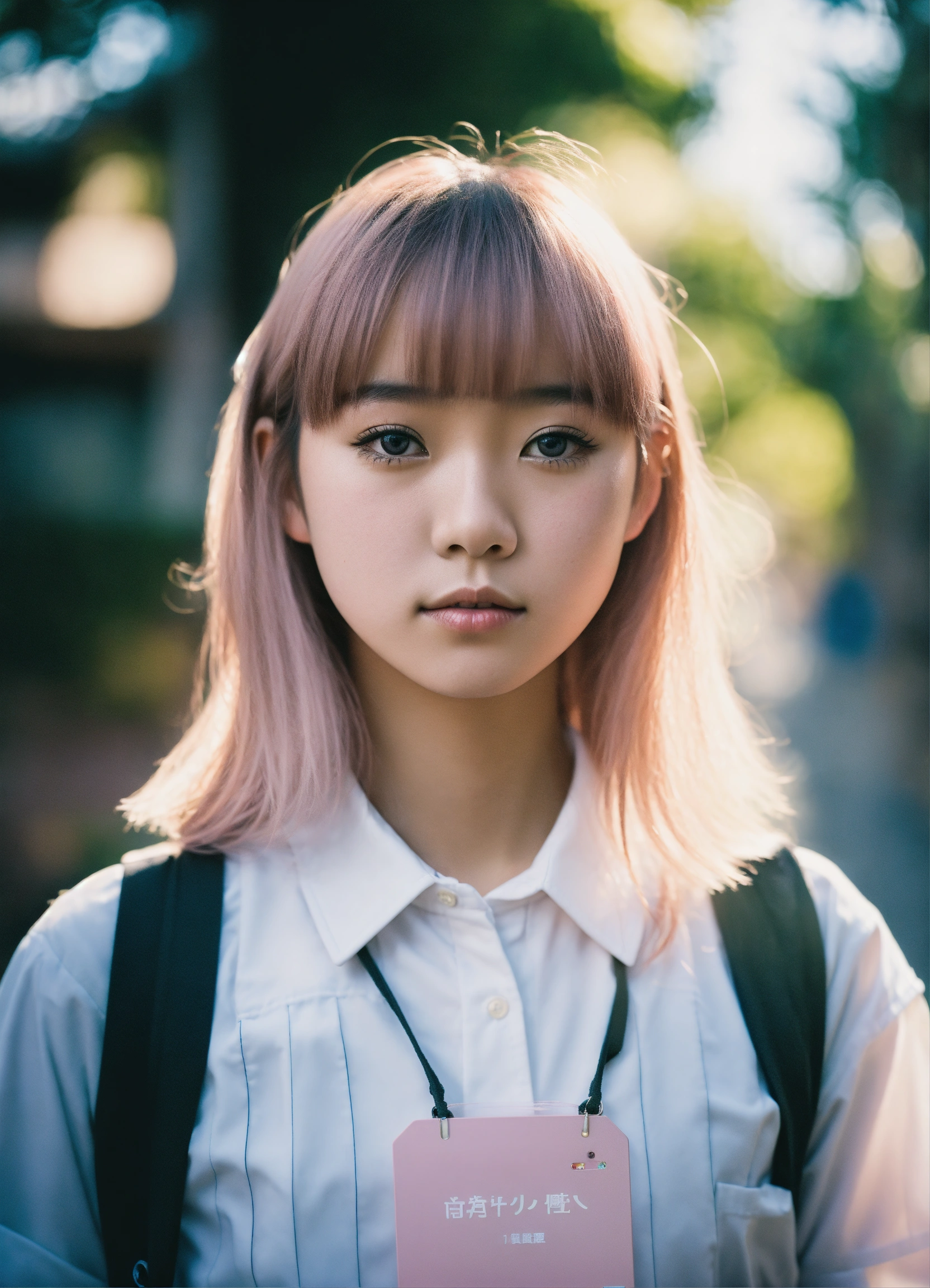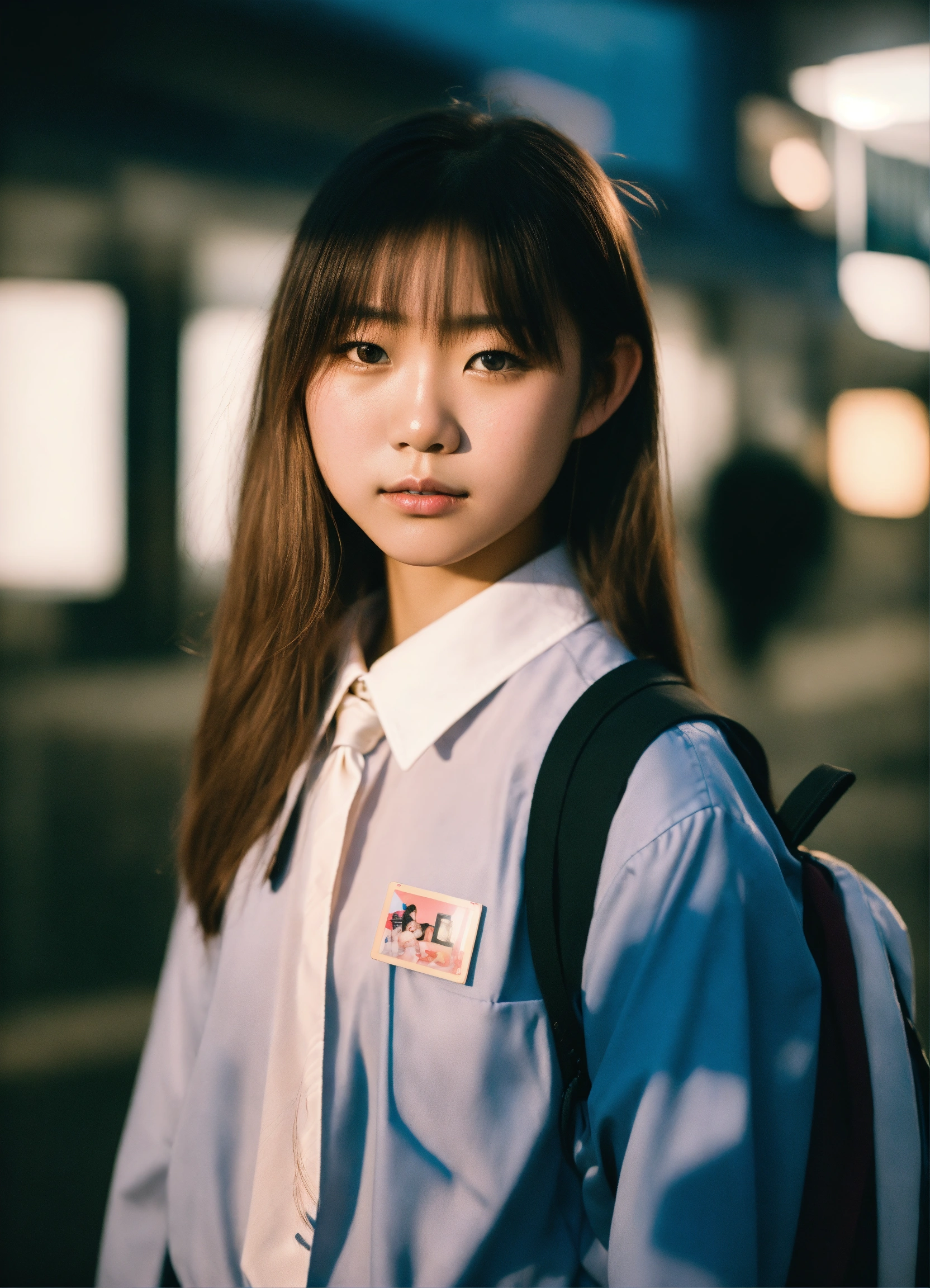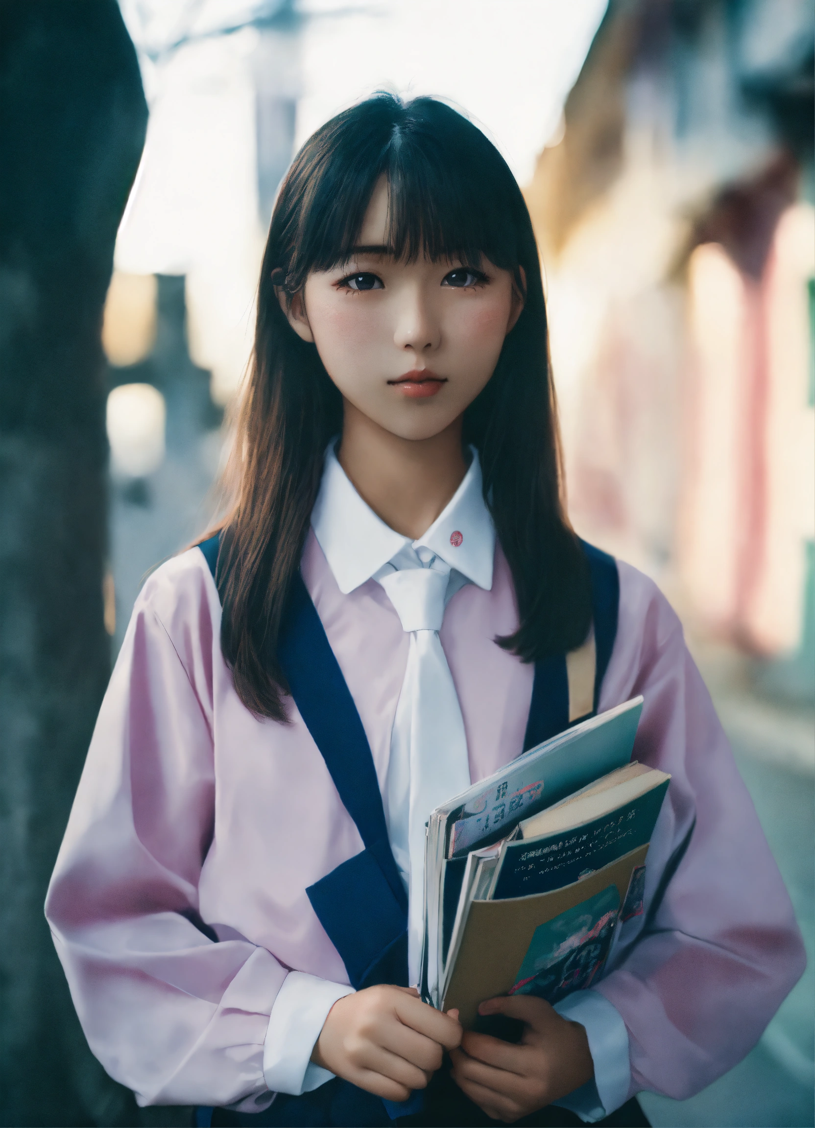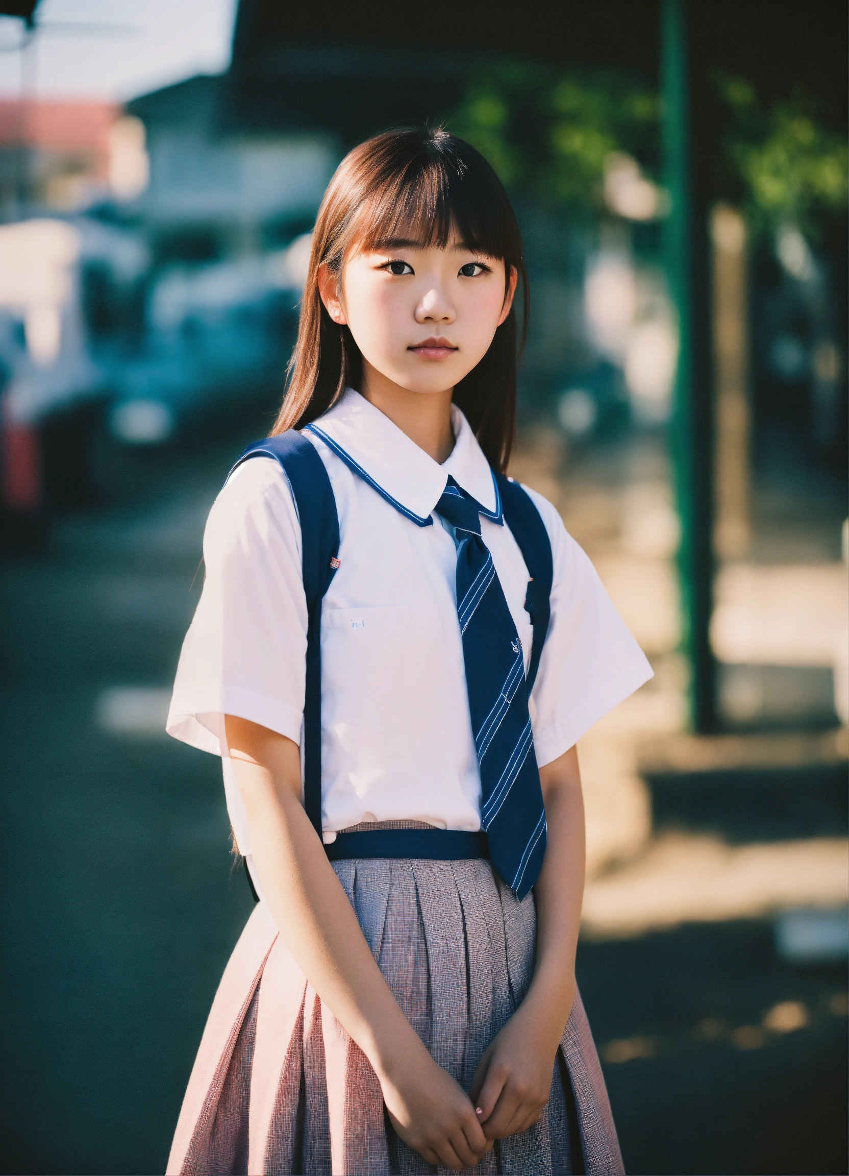Portrait, japanese young girl, student, shiny eyes, school uniform, street backgound, full body, shot on polaroid, shadowplay, gorgeous lighting, subtle pastel hues, 8k