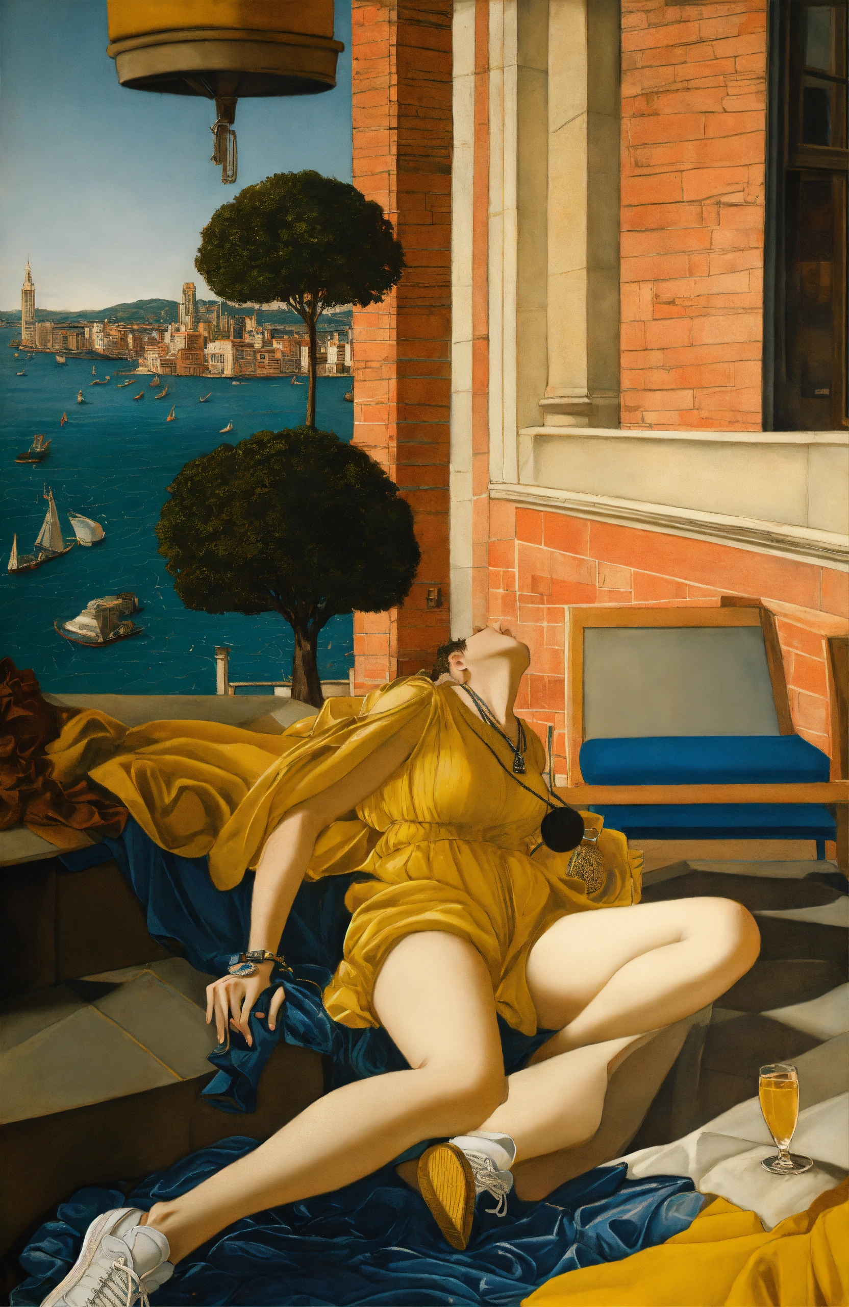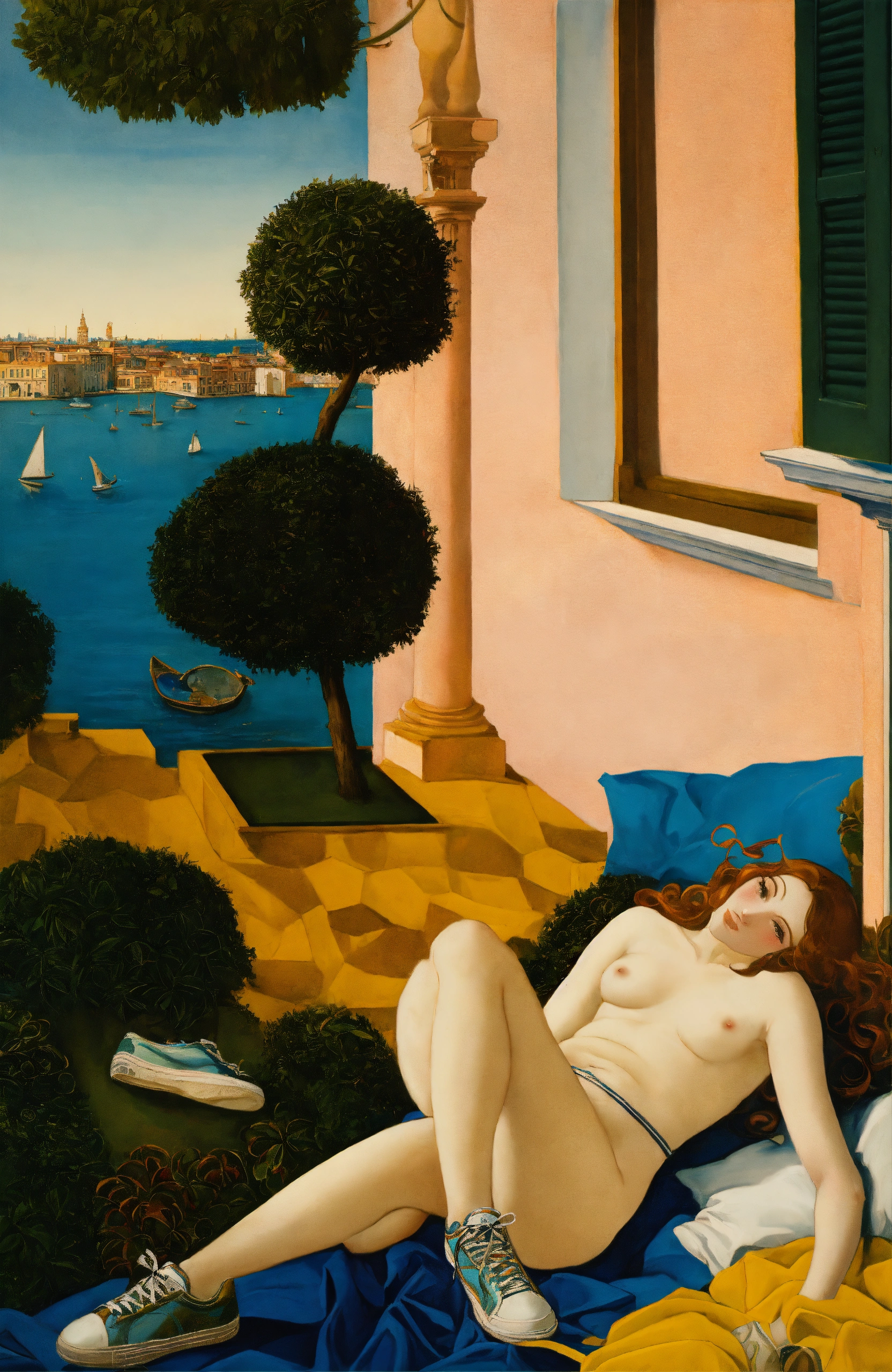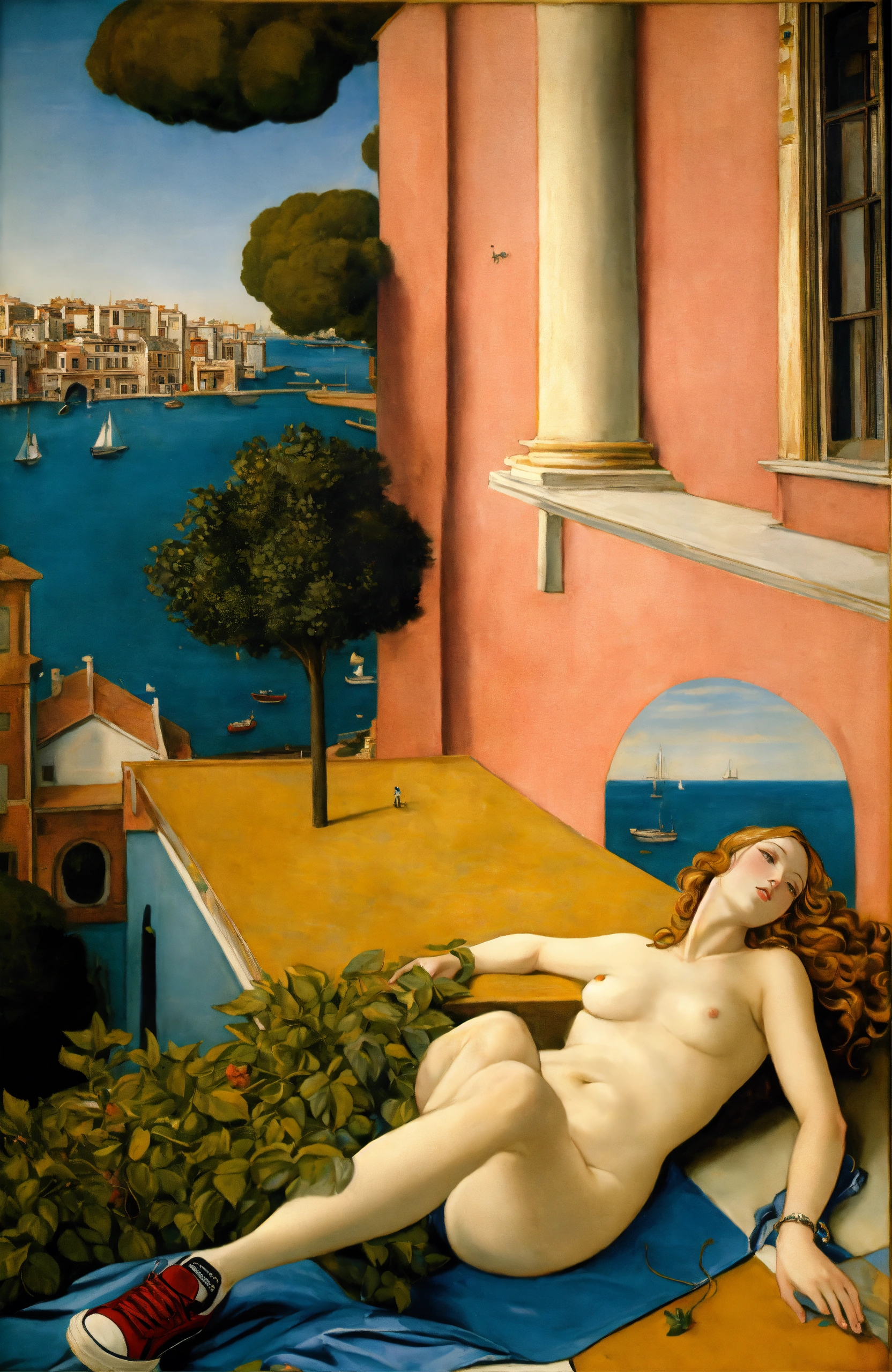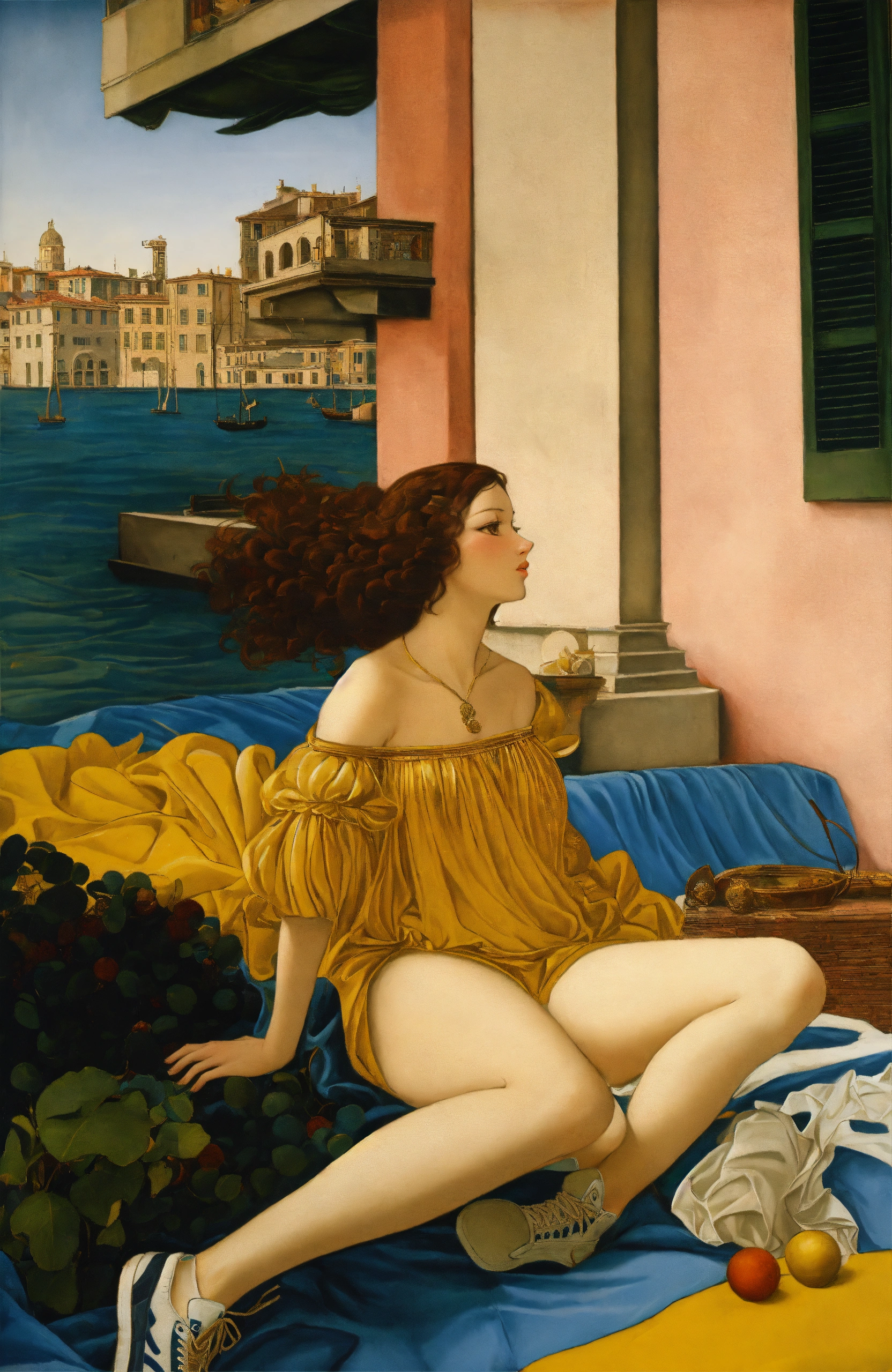 Venus in a top, a short, and sneakers in the modern time, by sandro botticelli, an urban cityscape, 256k.