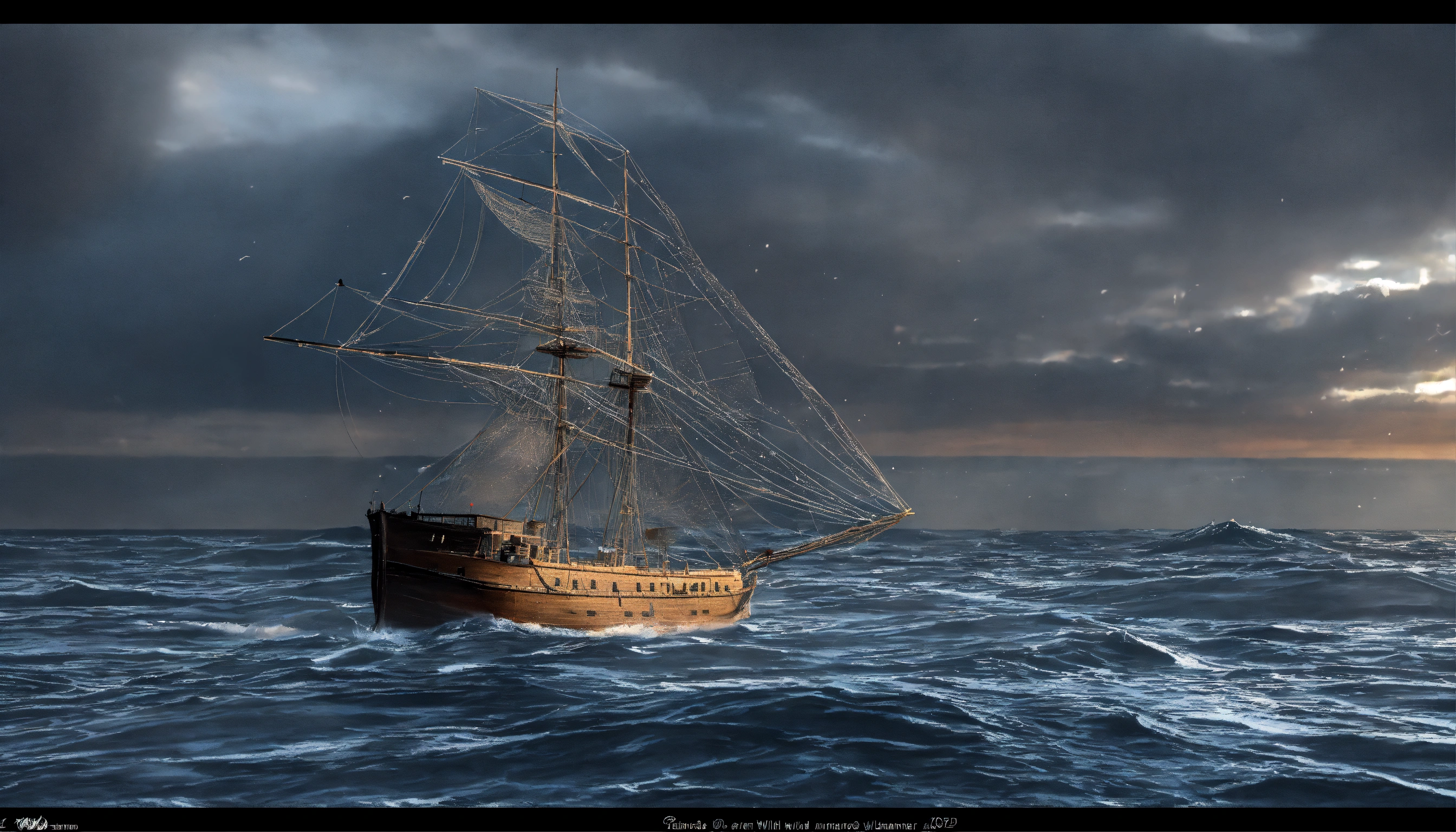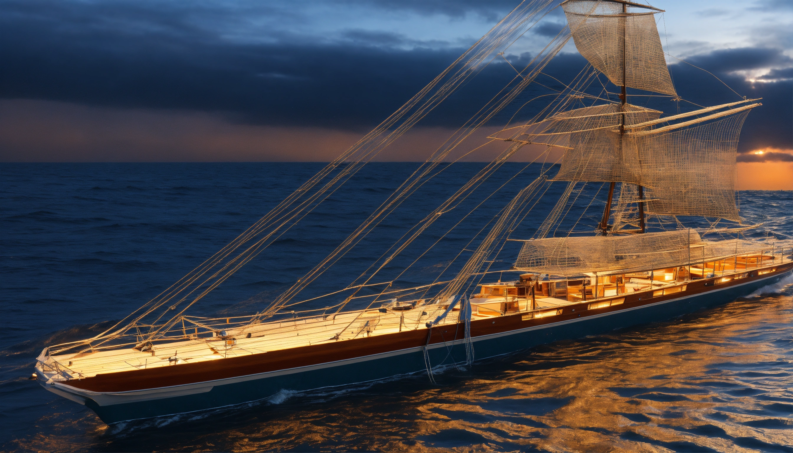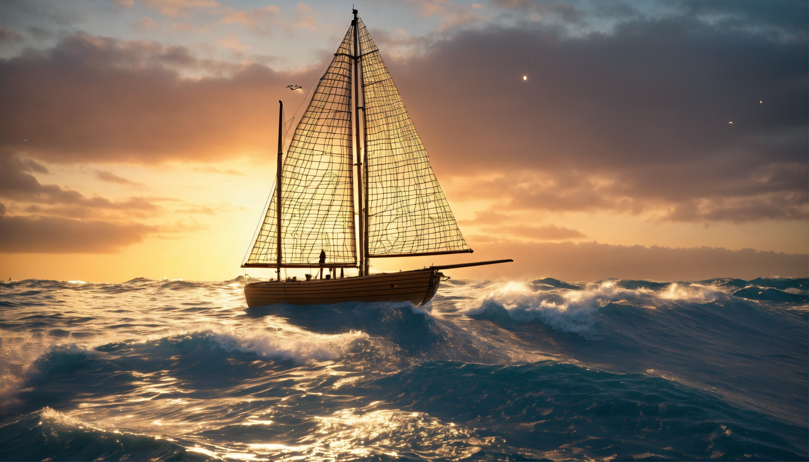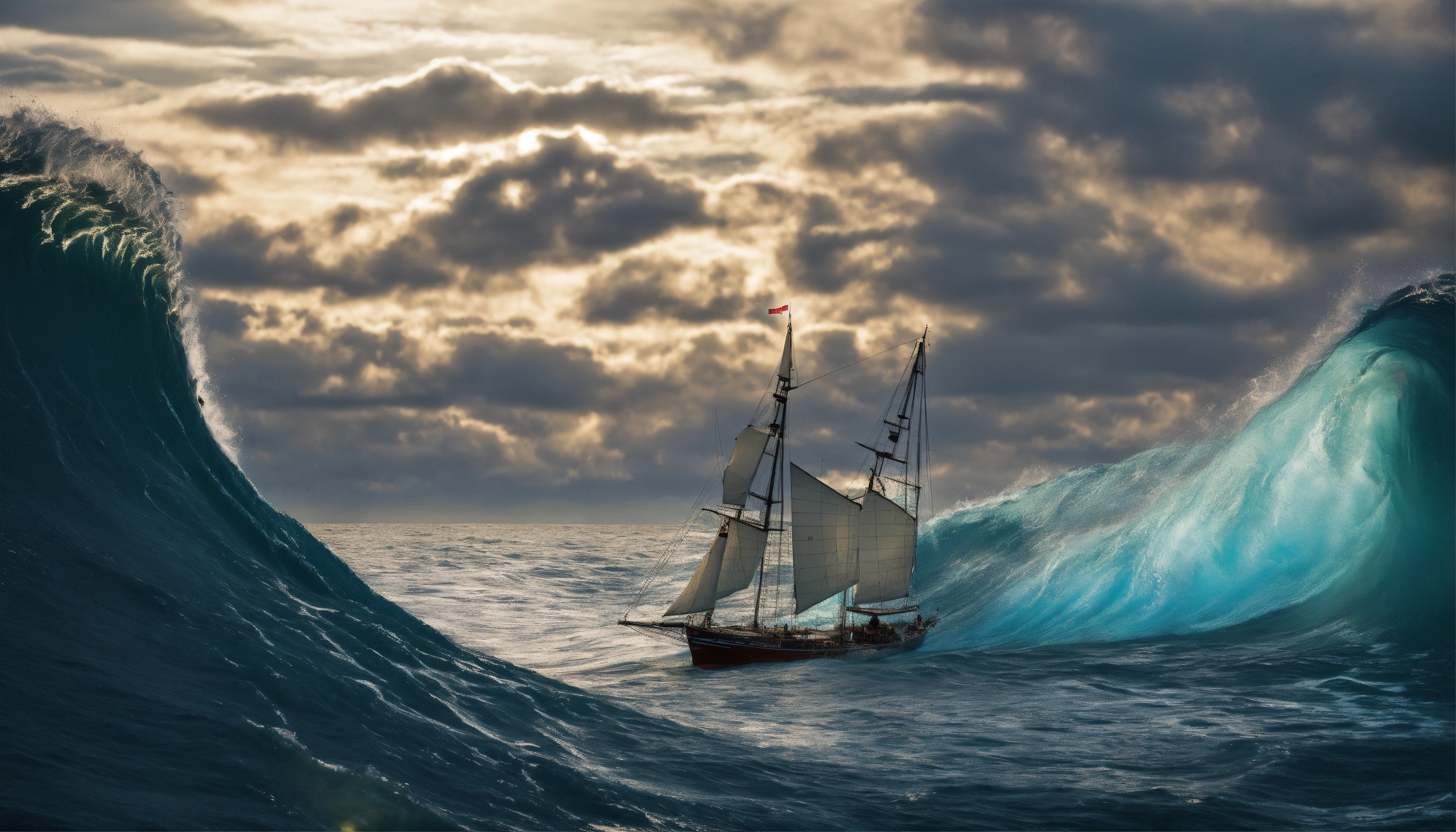 Segelschiff reitet auf einer wireframe tsunami welle in wildem meer