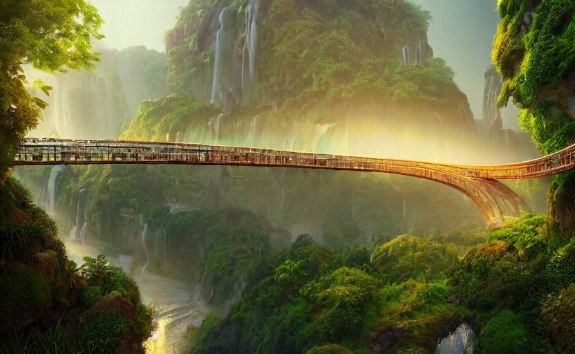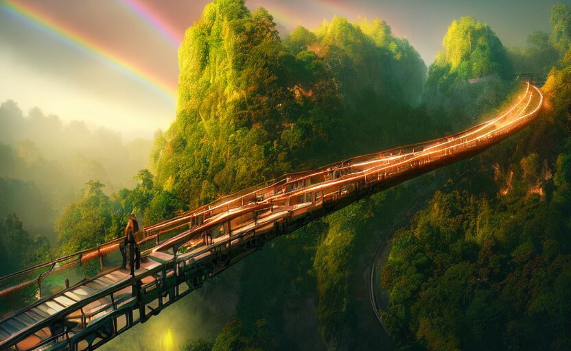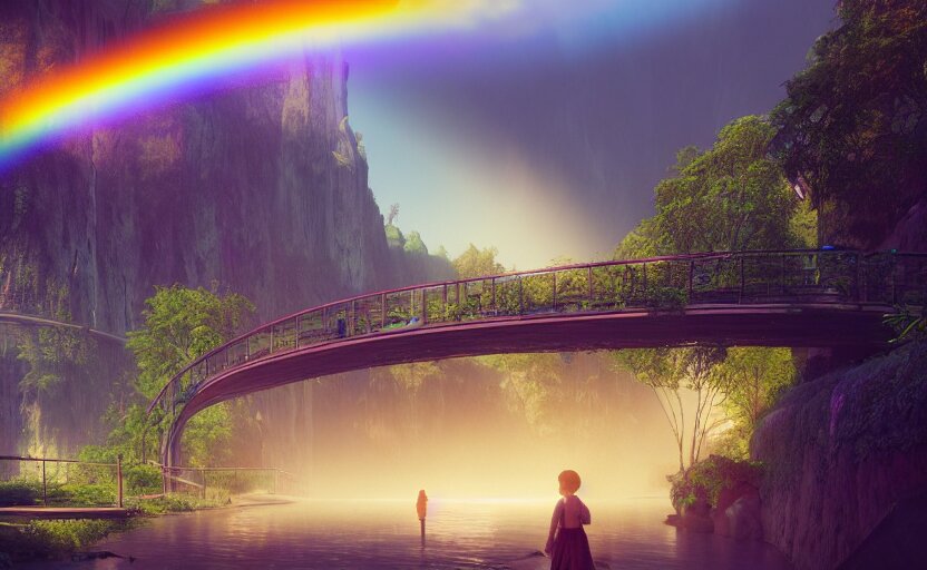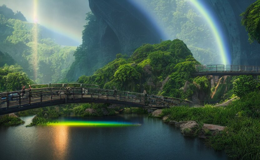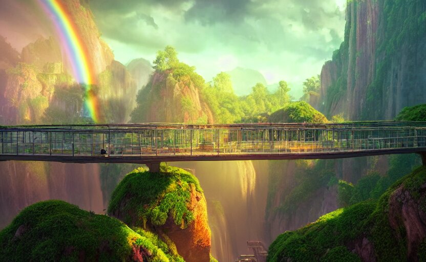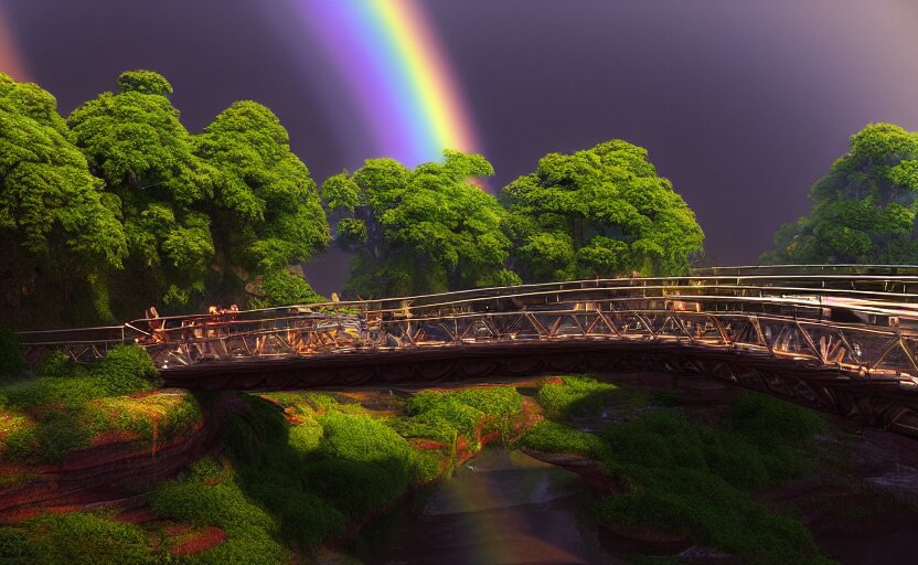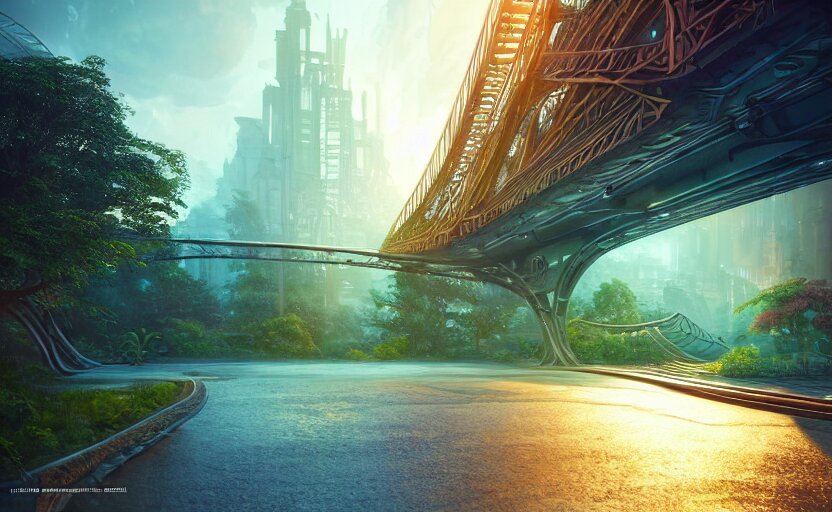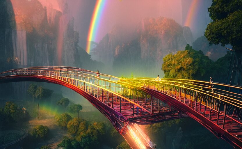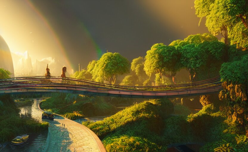 Incredible, mindblowing beautiful grand rainbow hardlight bridge, matte painting, artstation, solarpunk metropolis, cgsociety, dramatic lighting, vibrant greenery, concept art, octane render, arnold 3 d render