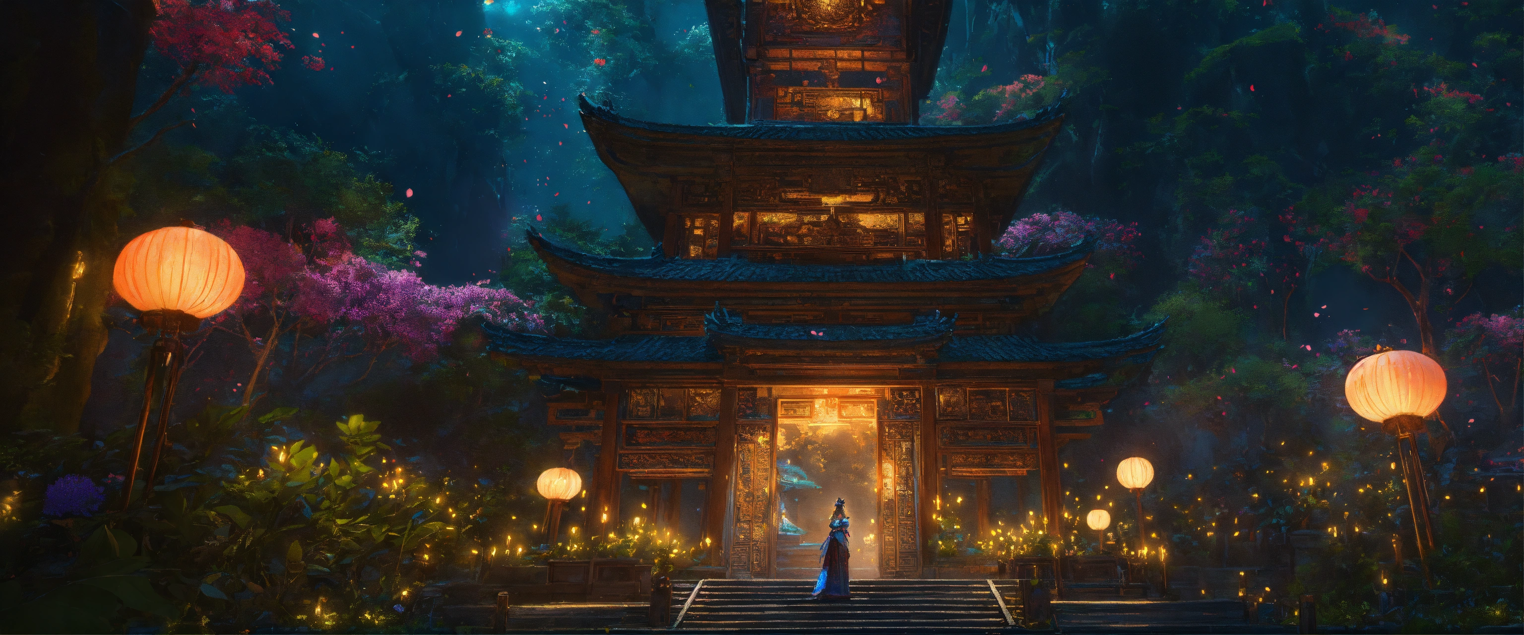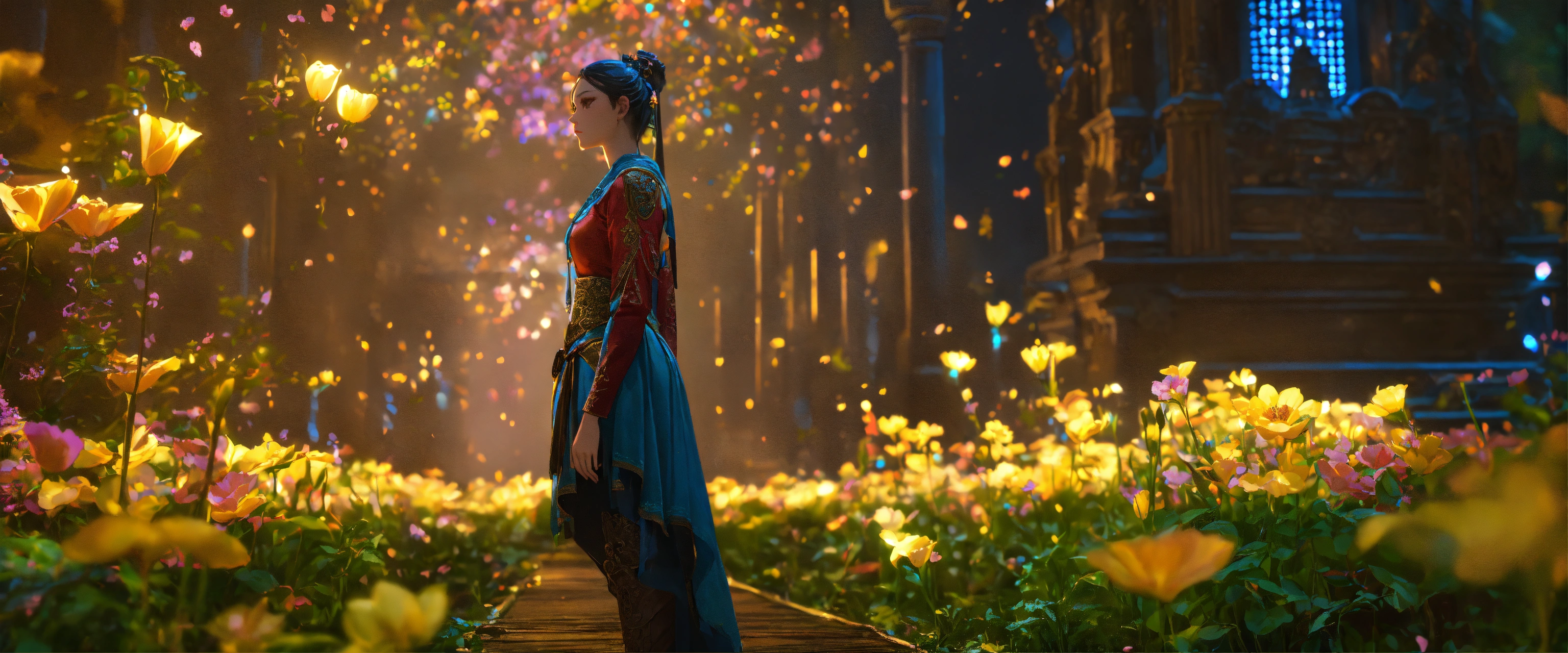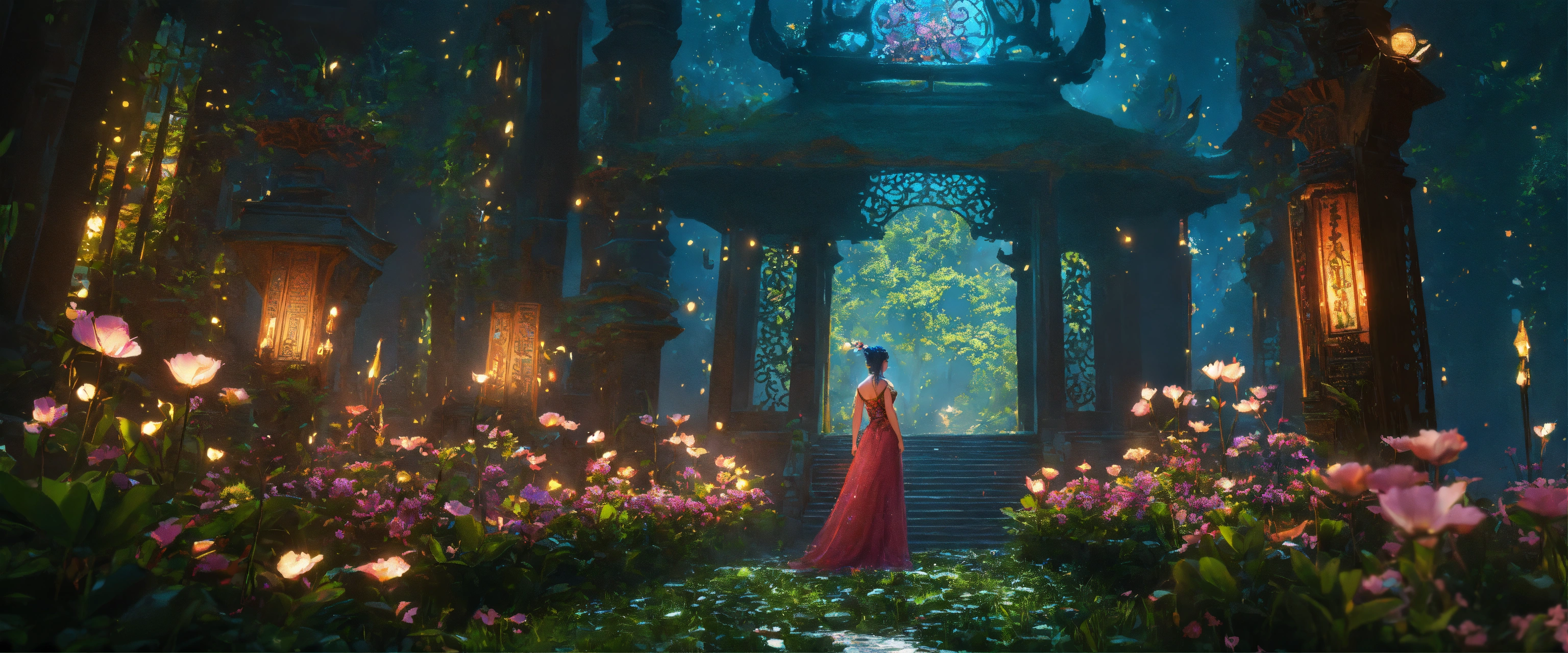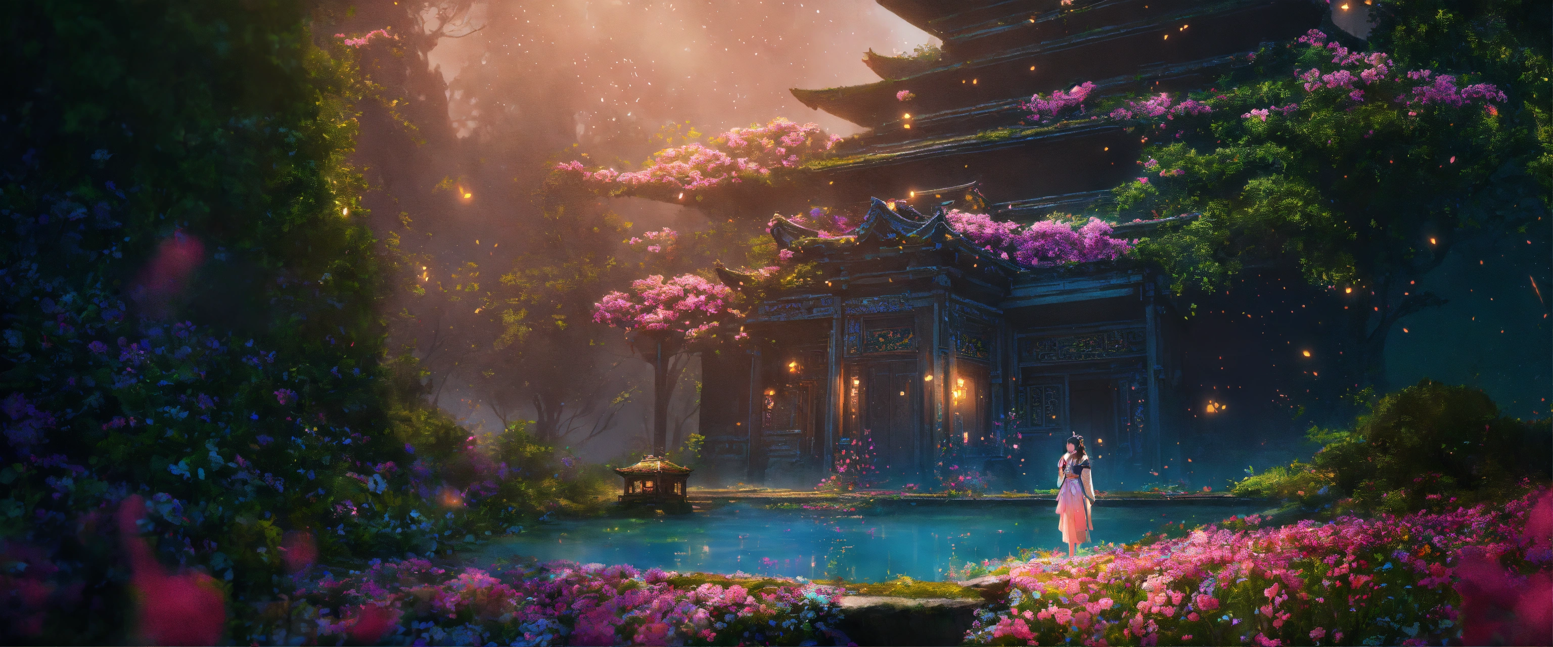 A professional movie photograph of, intricately detailed, gothic, digital graphics, close-up, intricately detailed, ktai forest temple, bioluminescence flowers, floating petals, night, magic forest, 4k concept art, dynamic lighting, beautiful girl standing on front, hyperdetalization, high-detail art, random artwork by guangjian huang, exquisite detail, sharp-focus, intricately-detailed, award-winning photograph, small-catchlight, low-contrast, high-sharpness, facial-symmetry, depth-of-field, cinematic background, unreal engine render, center image, dream-like, softly lit, intimate