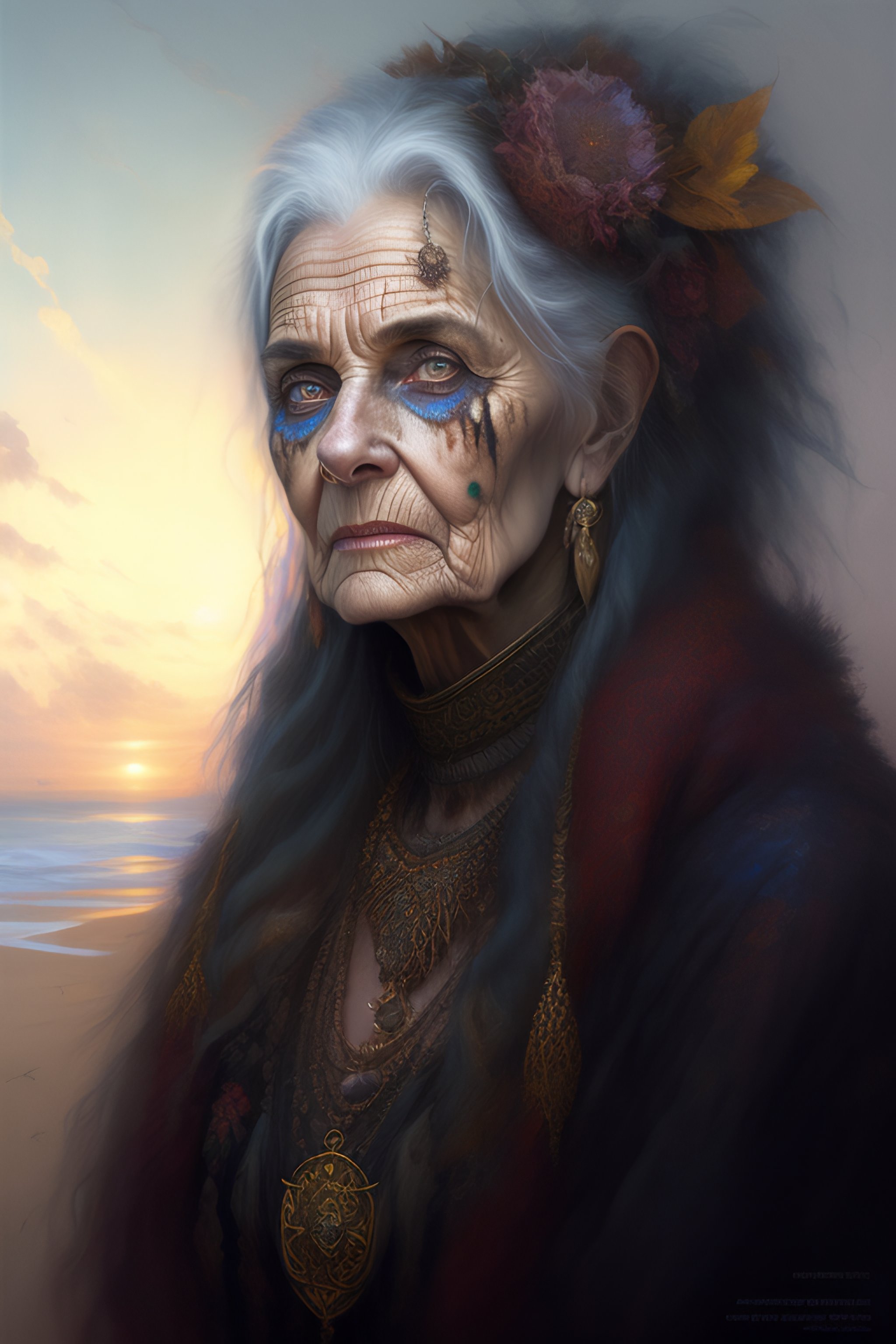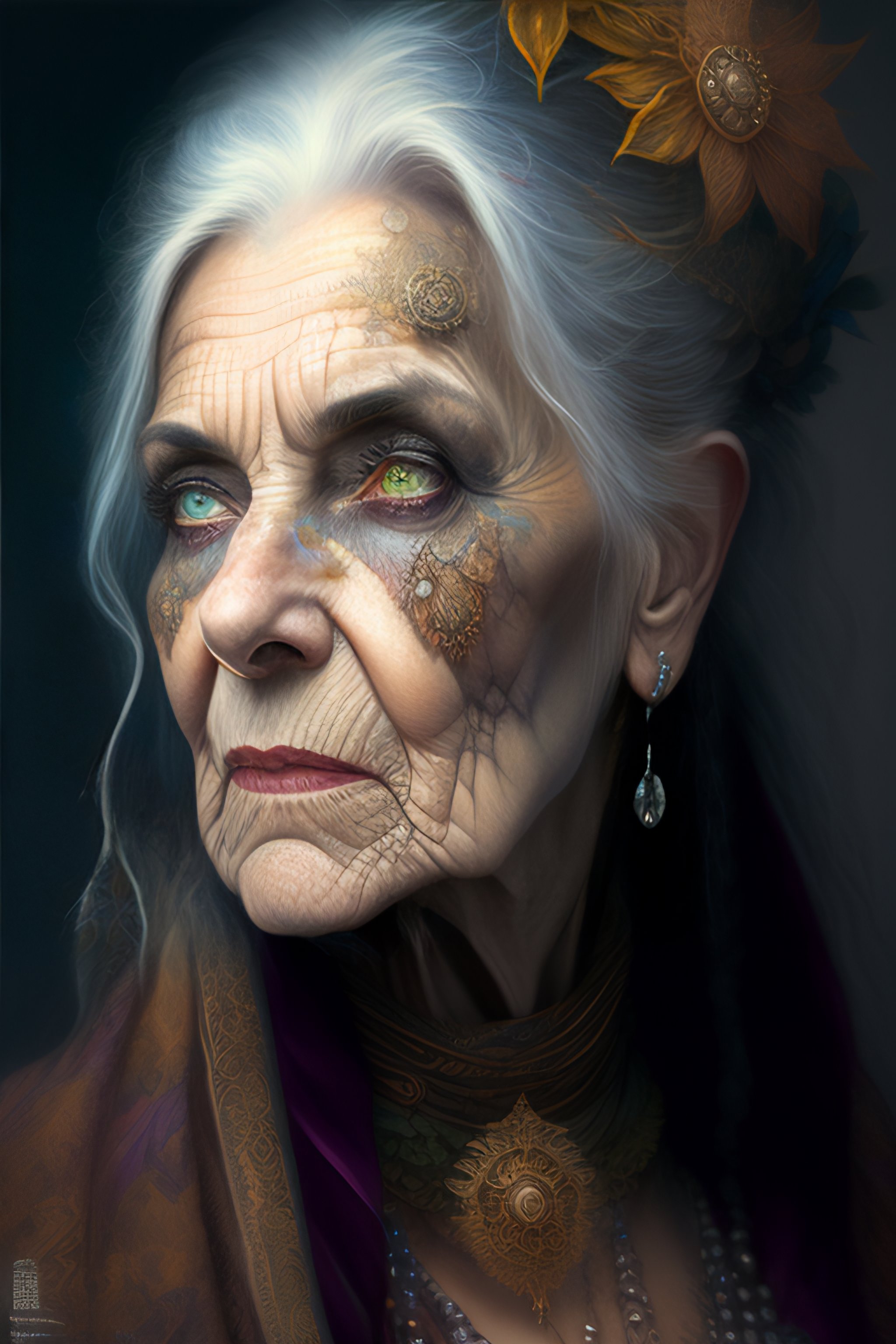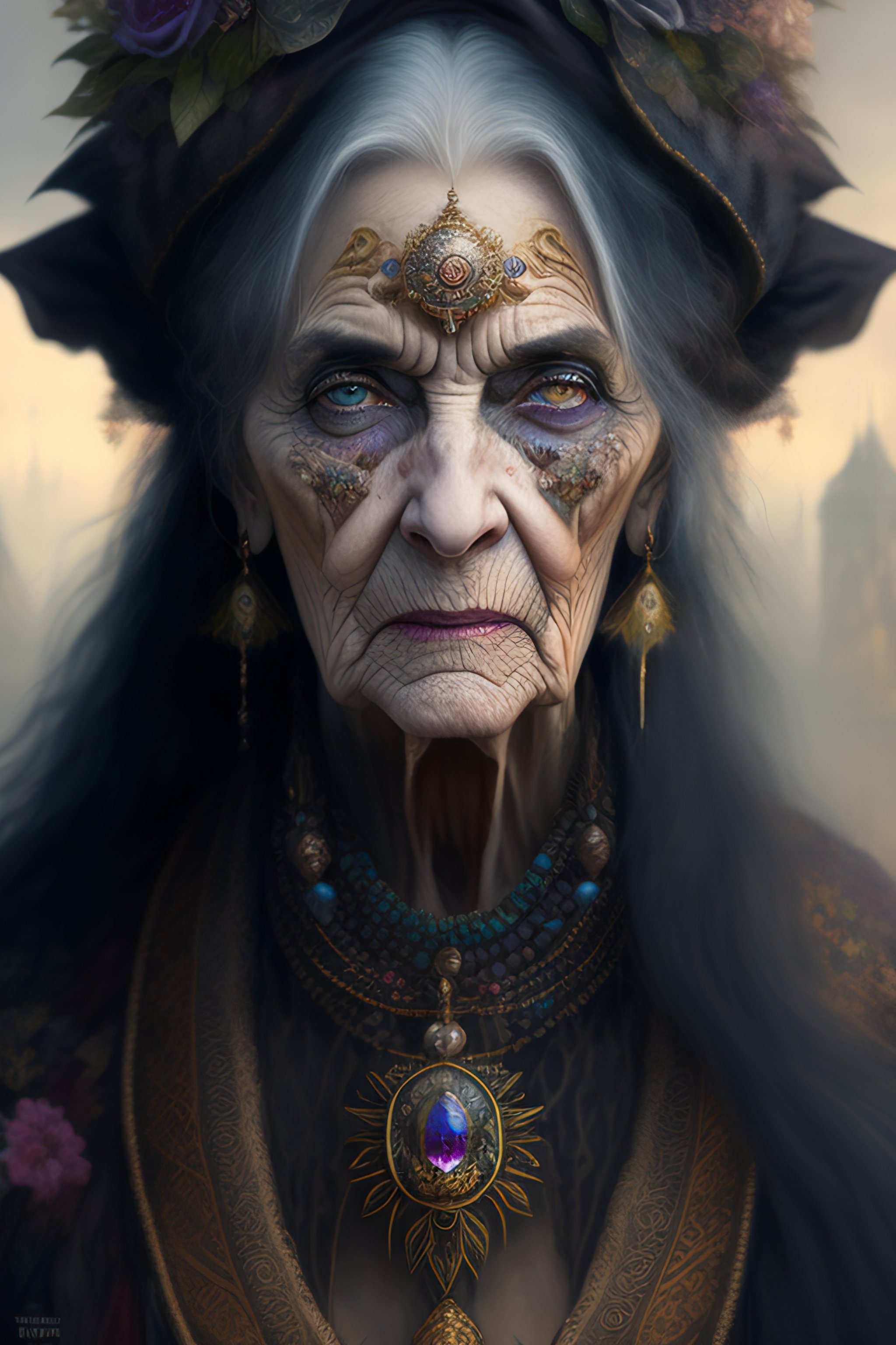 "full color portrait of a ornate and intricately detailed withered evil old grandmother hag of death, decay and age :: serge marshennikov, luis royo, anna dittmann, peter mohrbacher :: hyperrealistic, hyper detailed, photorealistic :: a masterpiece, incredible composition, amazing depth, imposing, meticulously composed, 16k resolution concept art :: fantasy magazine cover art"