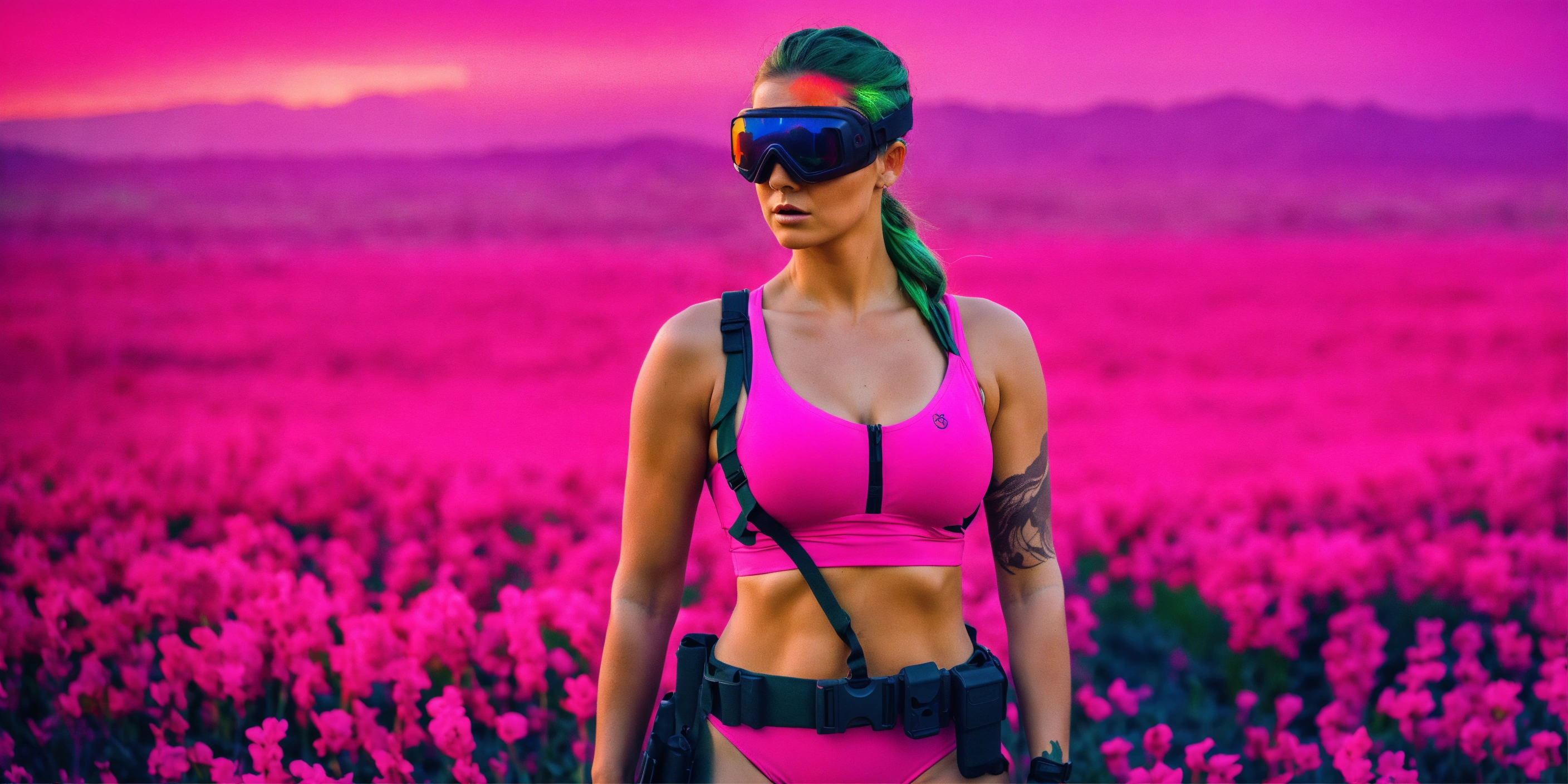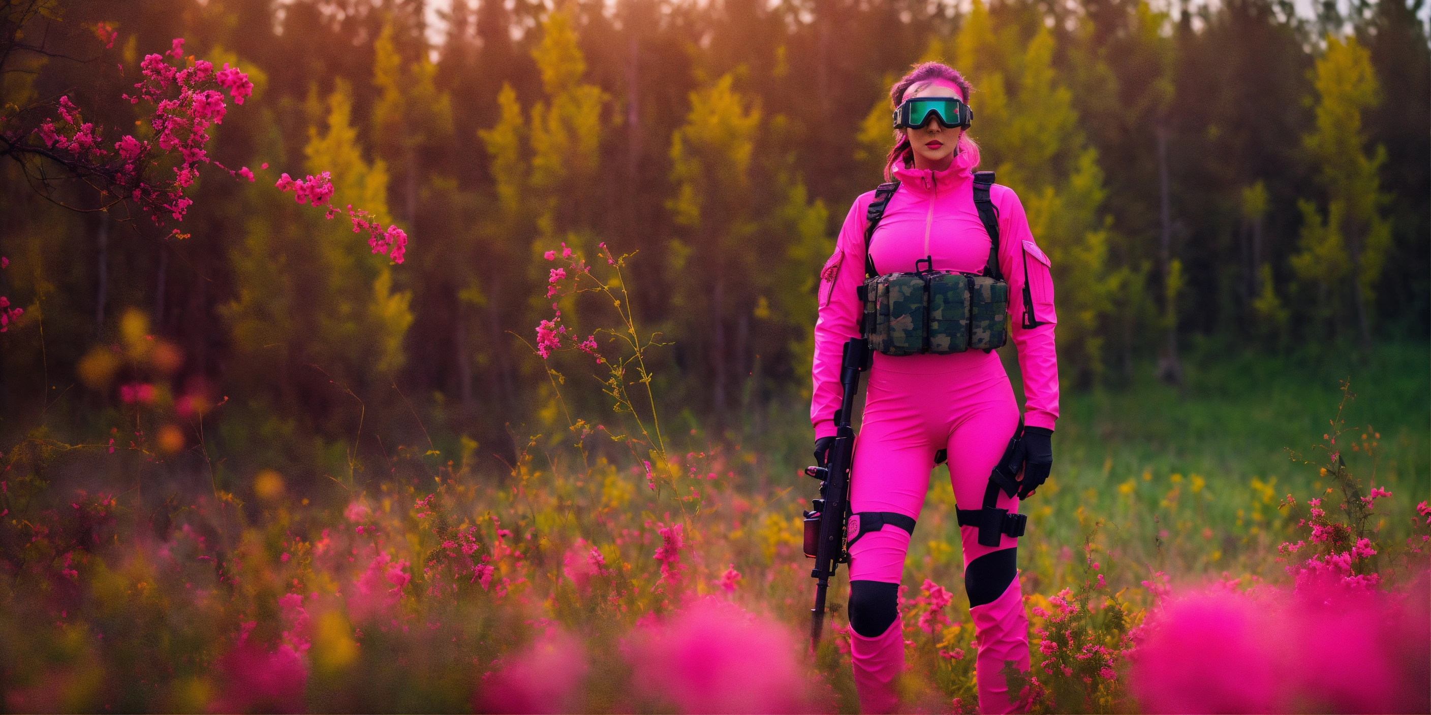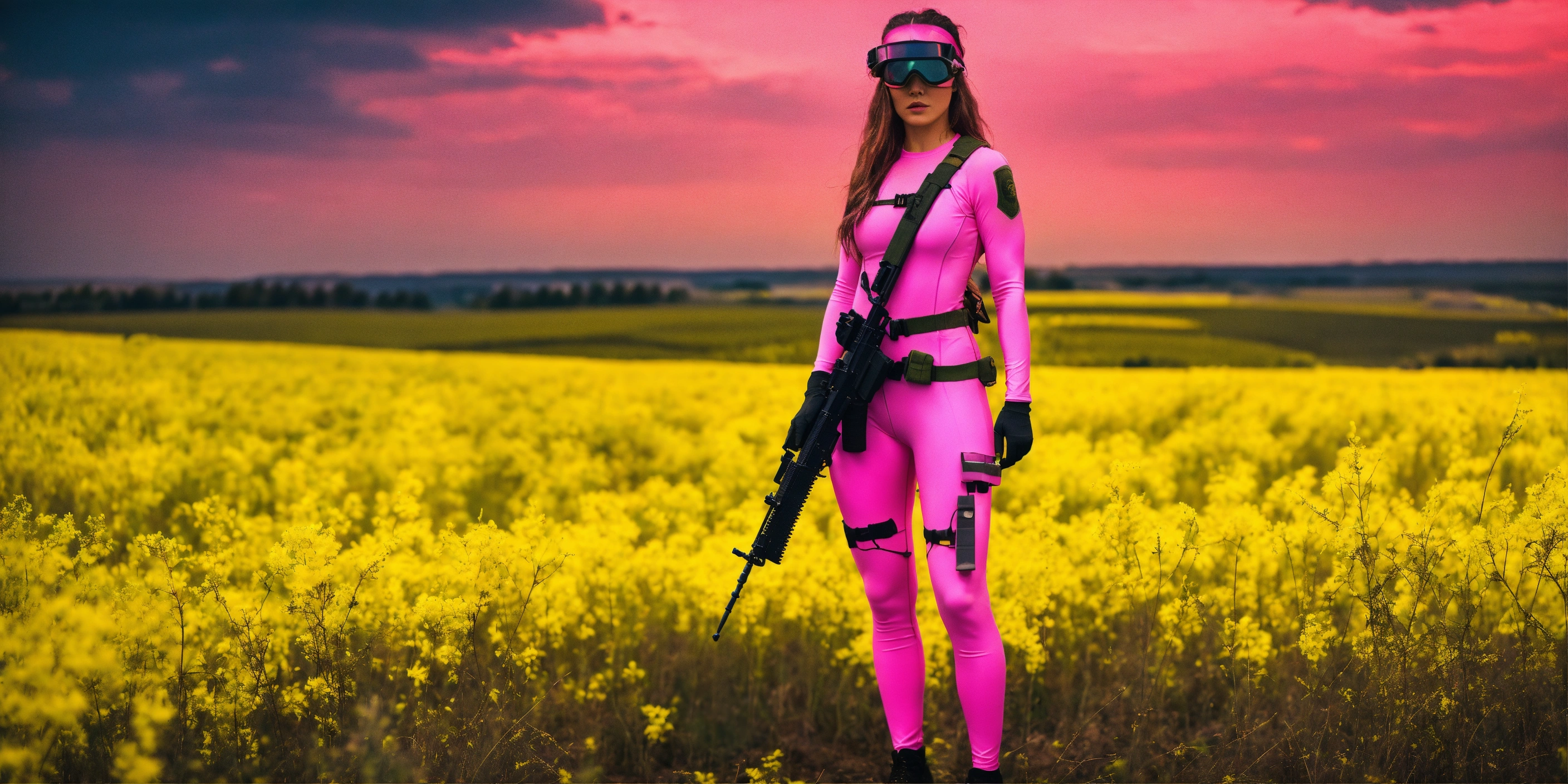 Amidst a backdrop of wilderness, a woman stands out in an unusual ensemble. her top half sports a vibrant pink swimsuit, while from the knees down, she’s decked out in tactical military gear, complete with night vision goggles, a combat knife, and camouflage leggings. all this happens in ukrainian fields