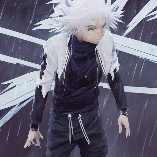 Killua zoldyck white hair, rain, white hair, techwear, streetwear, cyberpunk style outfit, greg rutkowski, artgerm, ross tran, takato yomamoto, wlop, ilya kuvshinov, intricate complexity, detailed portrait, 4 k, cinematic lighting, artstation, sharp focus, smooth, makoto shinkai