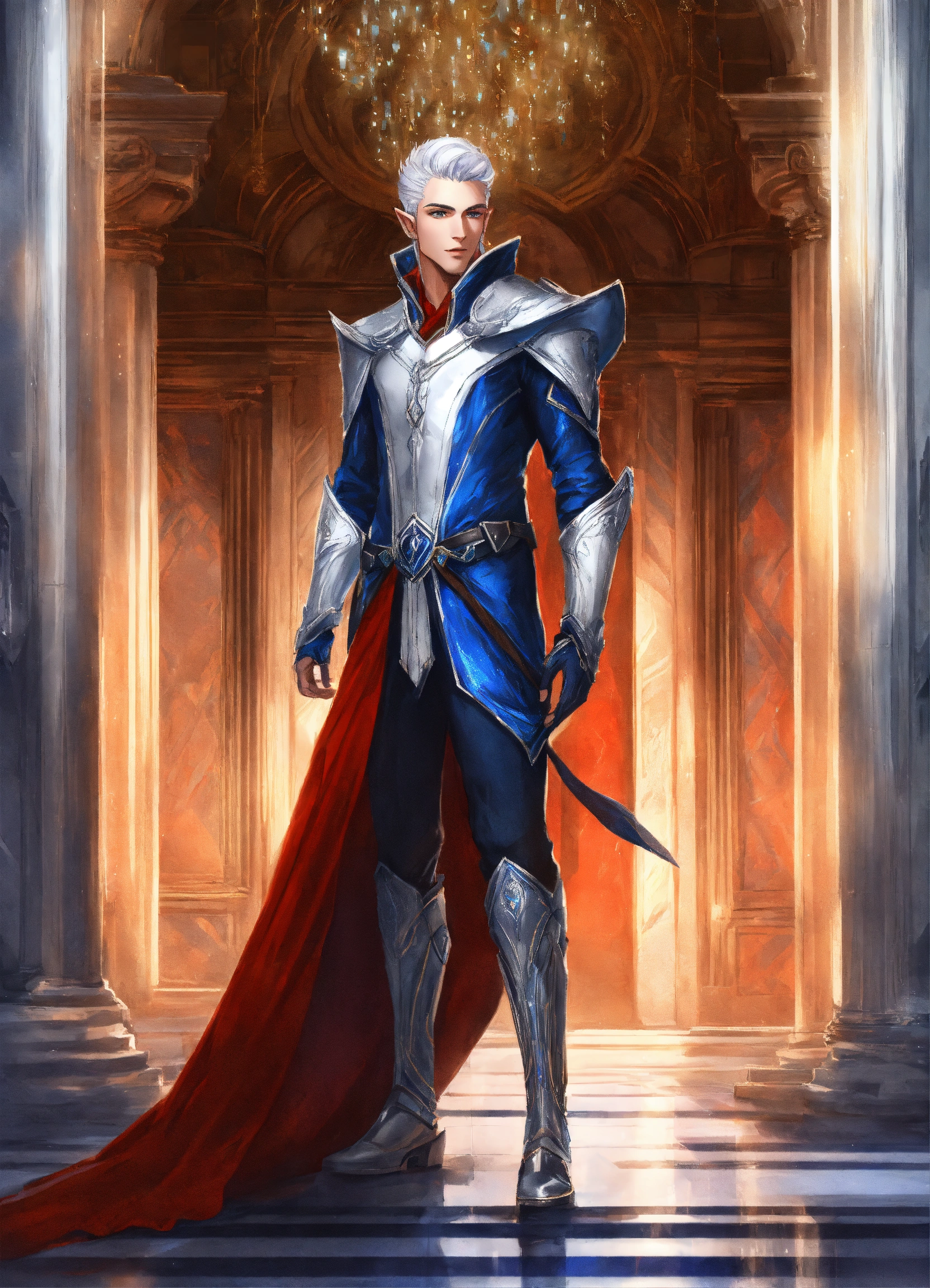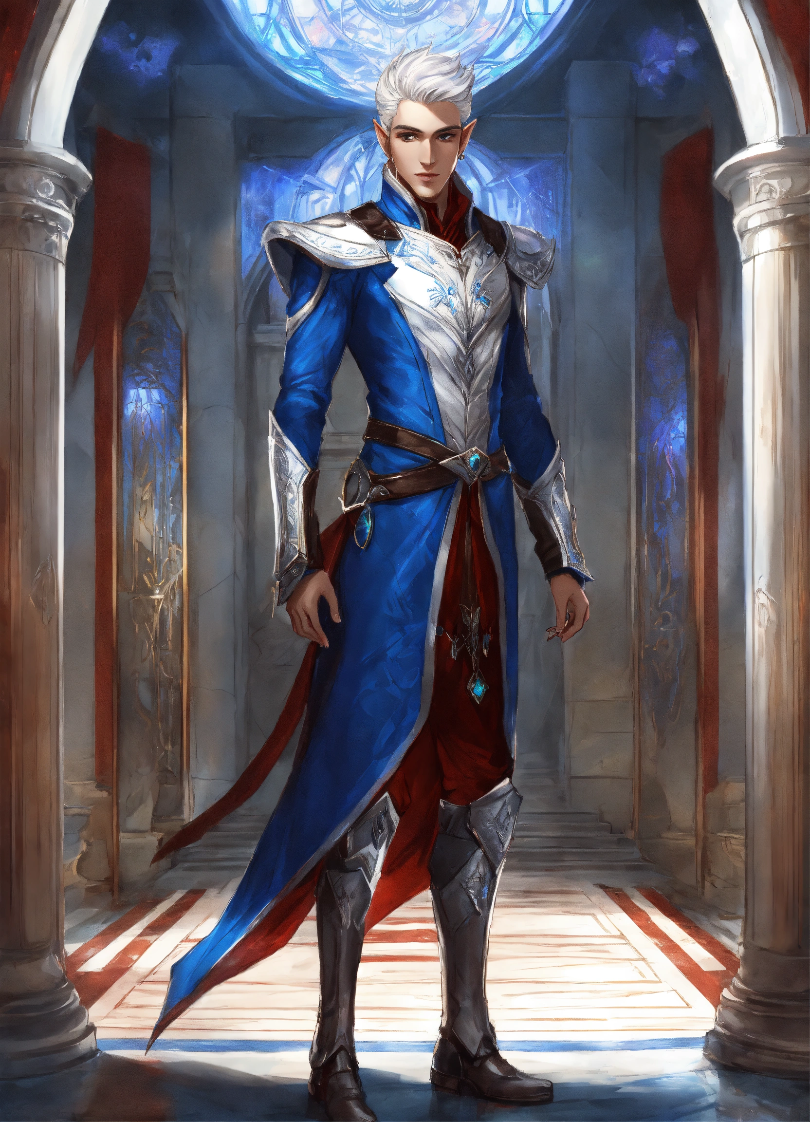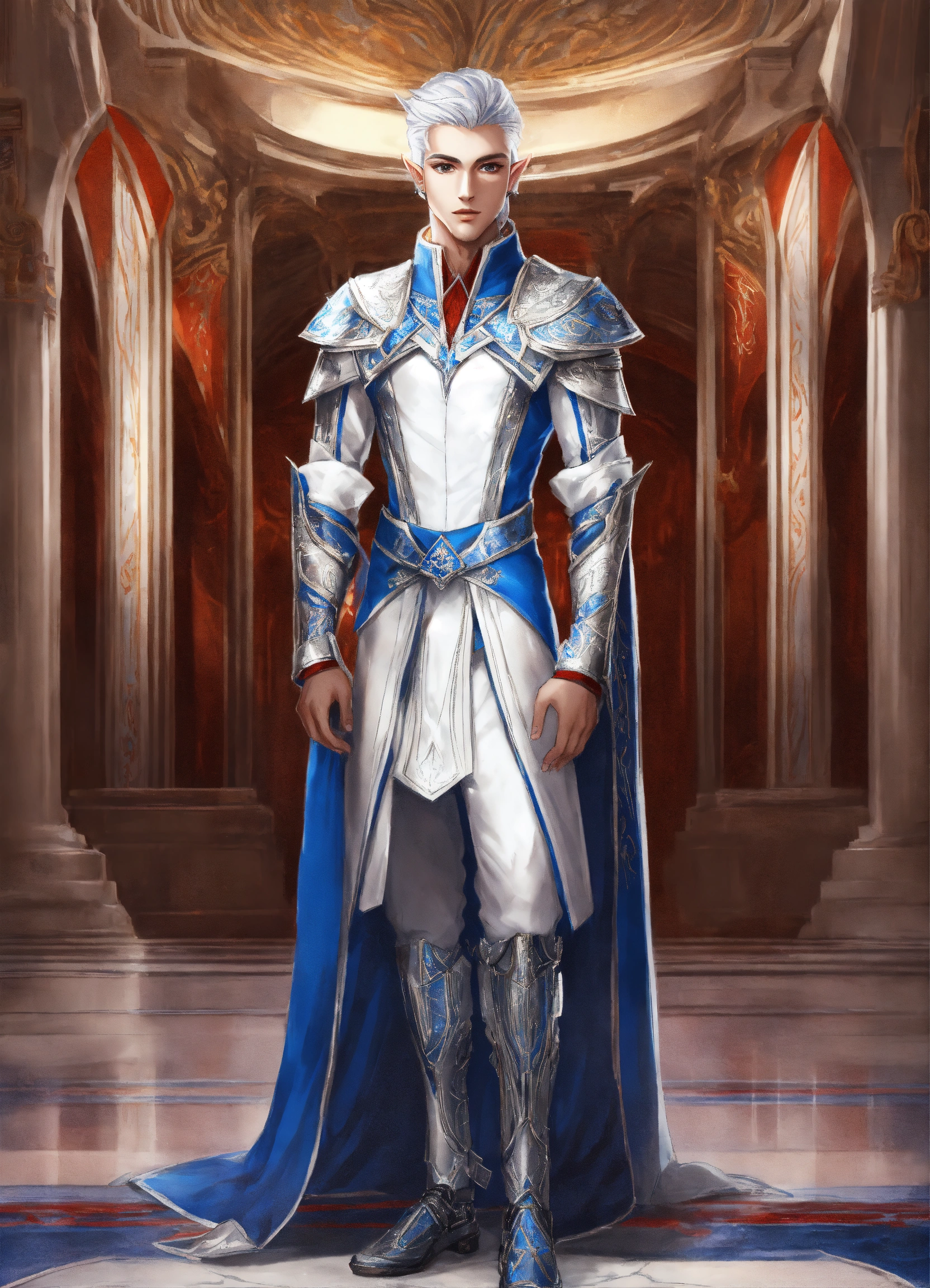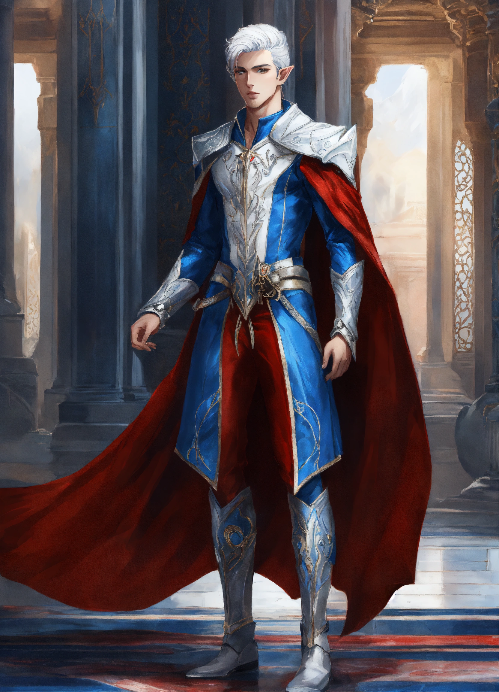 Drawing of an elf, royalty, sci fi, cybernetic, white and red and blue royal sci fi outfit, silver hair, standing in an elegant marble elven palace, handsome, male high elf, 24 years old, elf ear