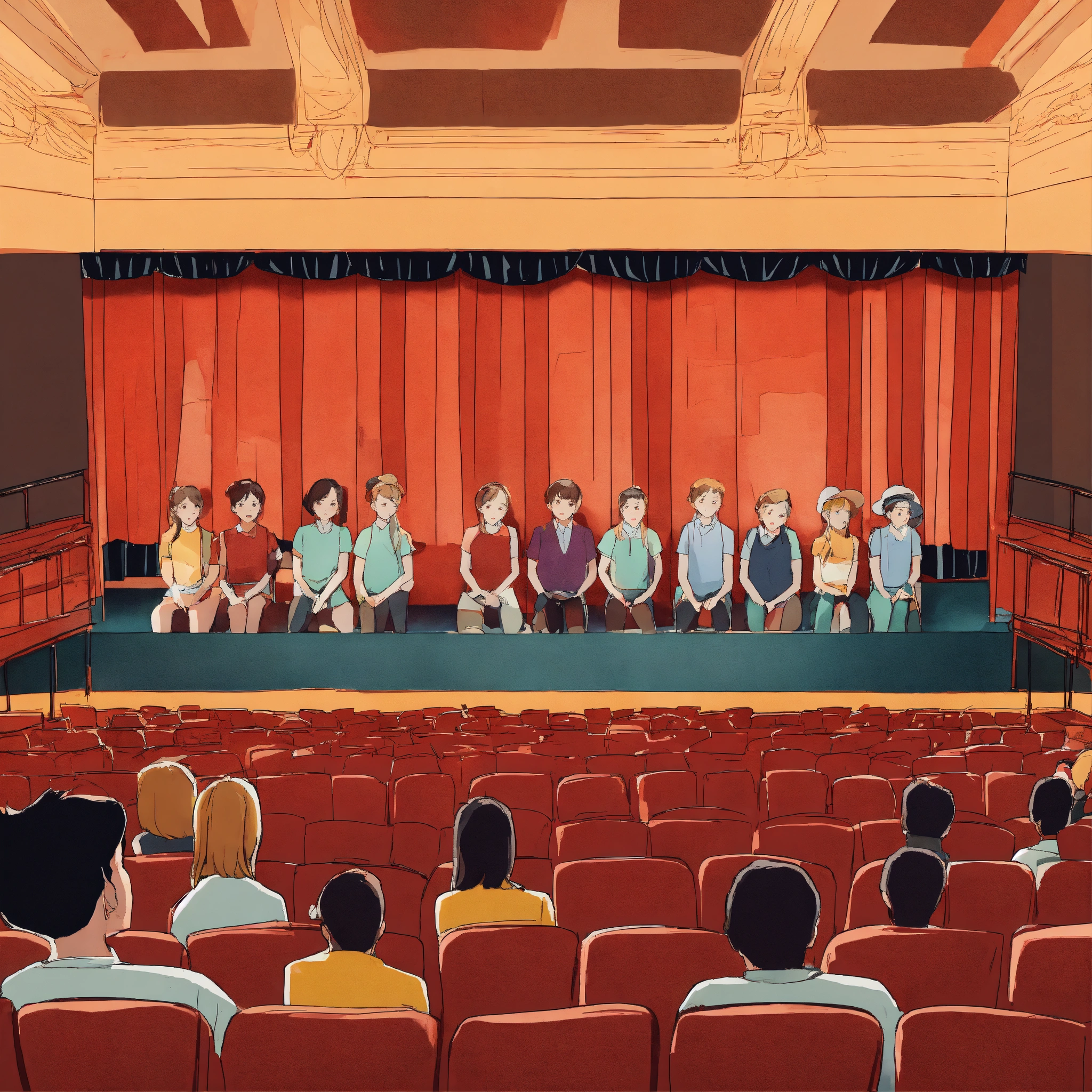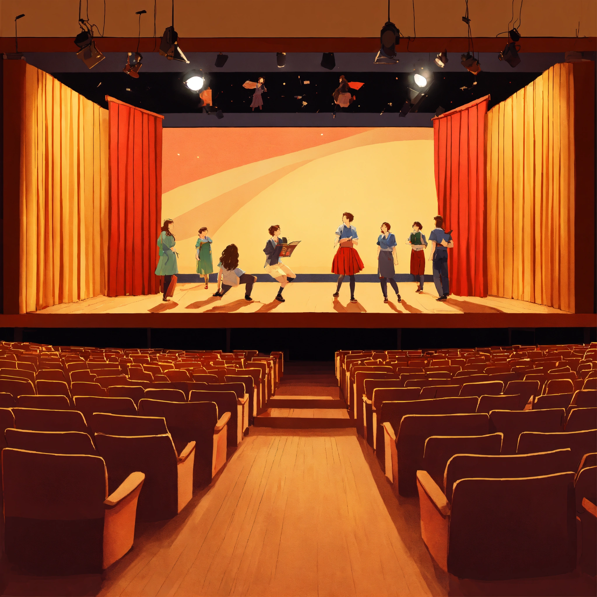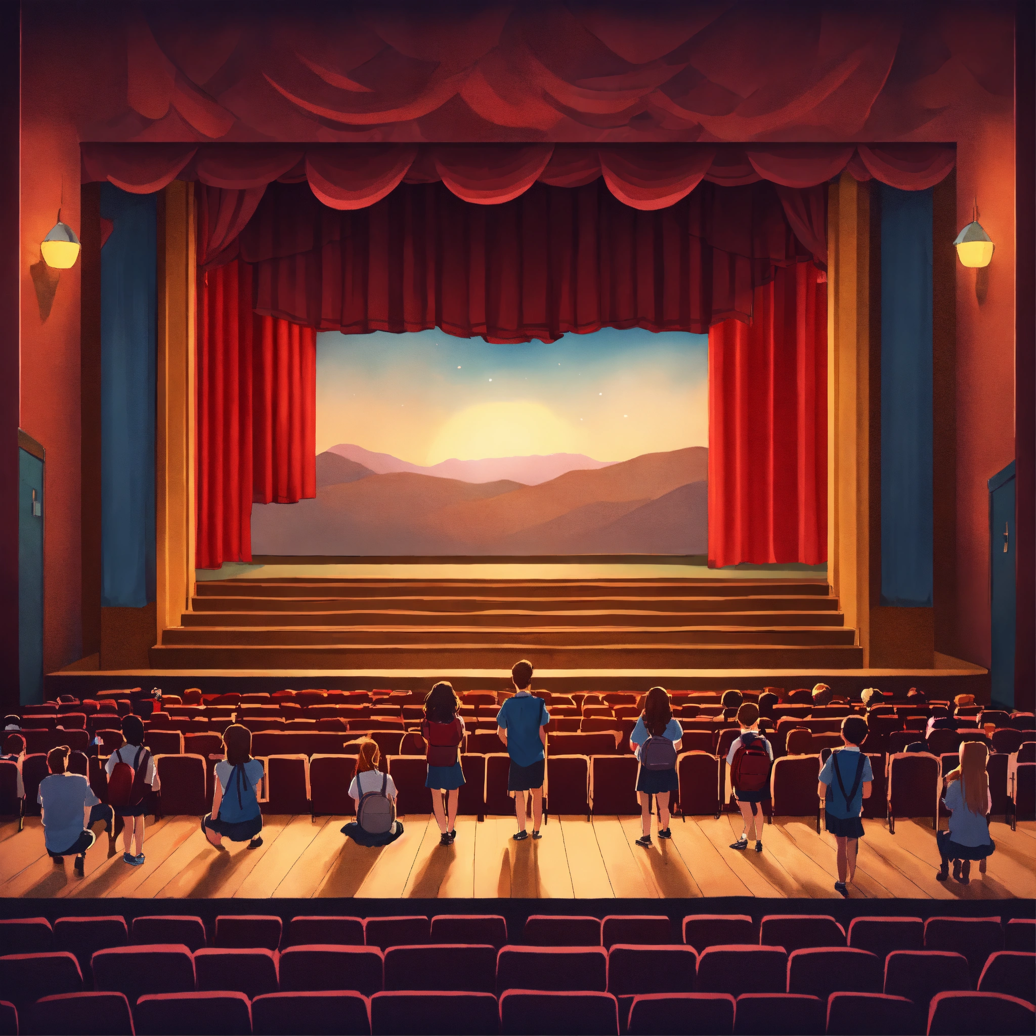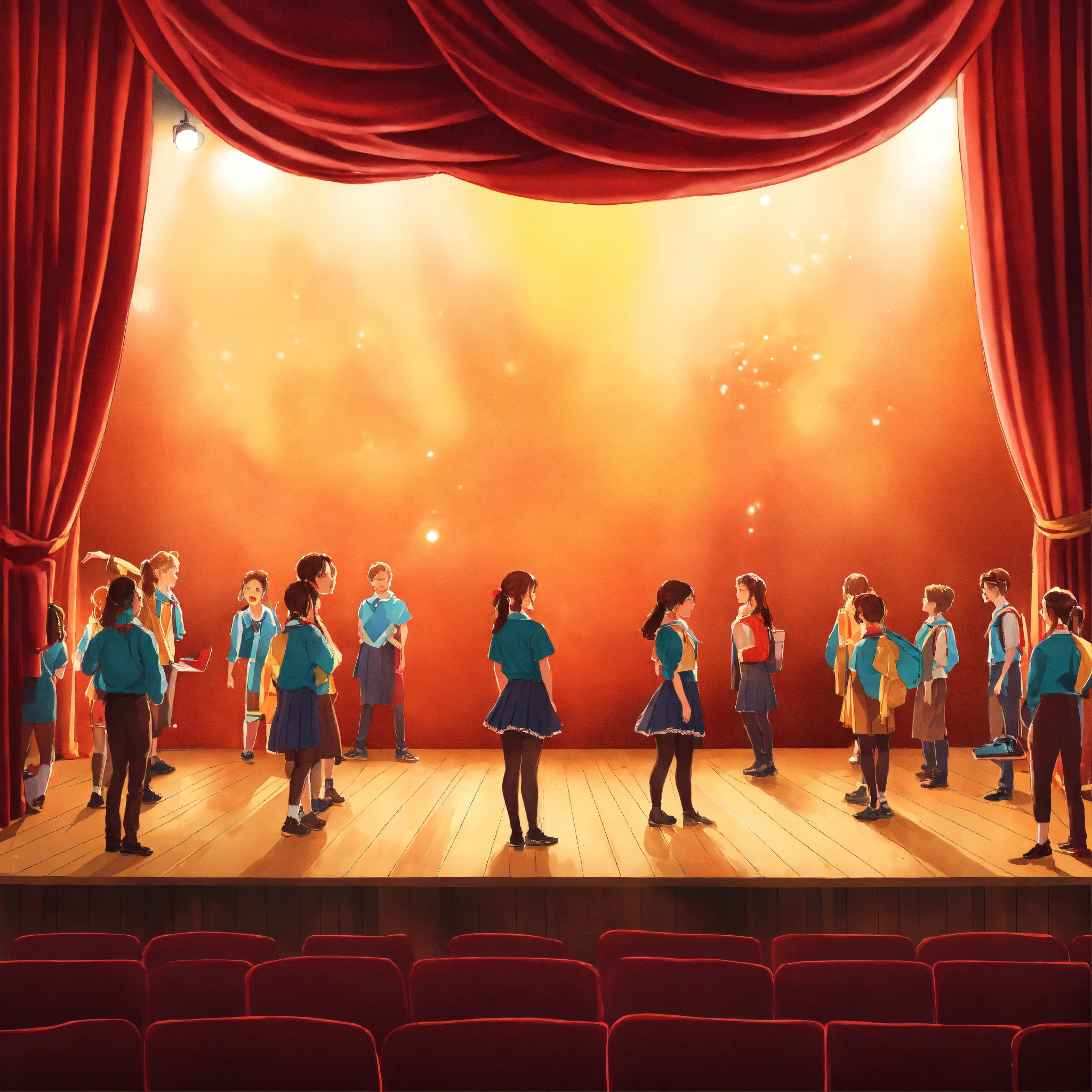 Illustration of school theater performance with medium long shots and creative perspective. motif students on stage, background scene theater backdrop. realistic photo