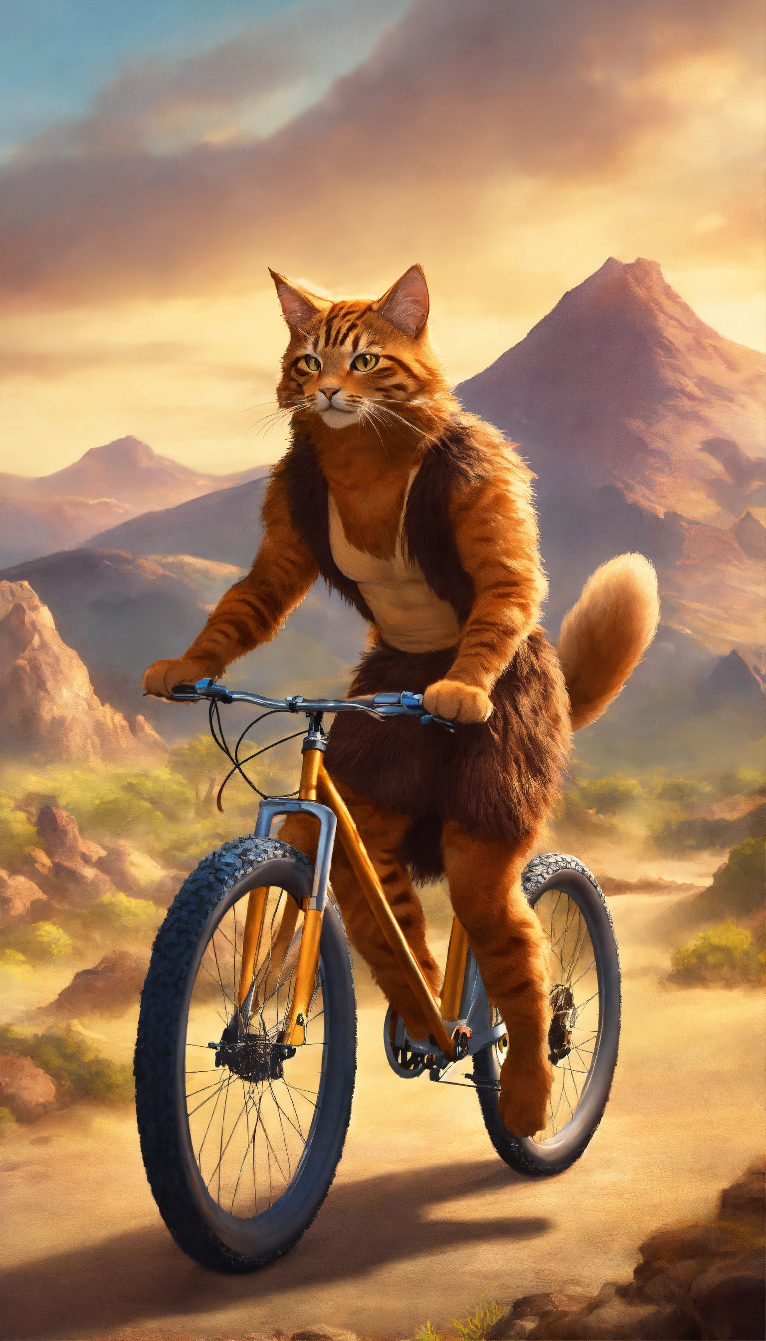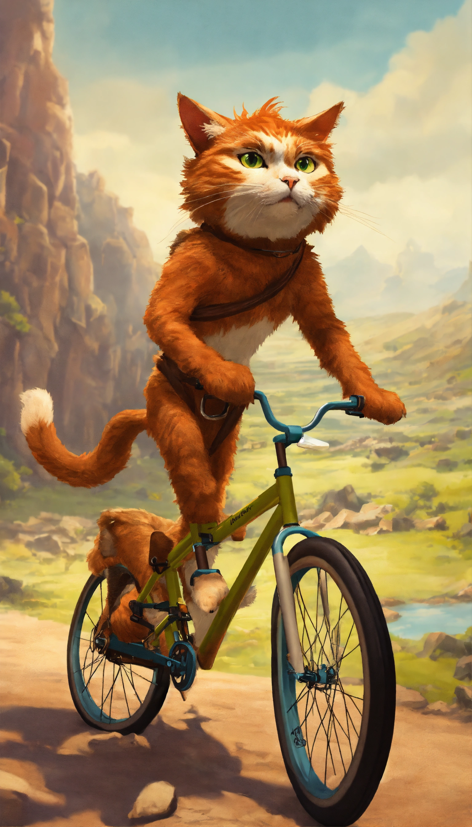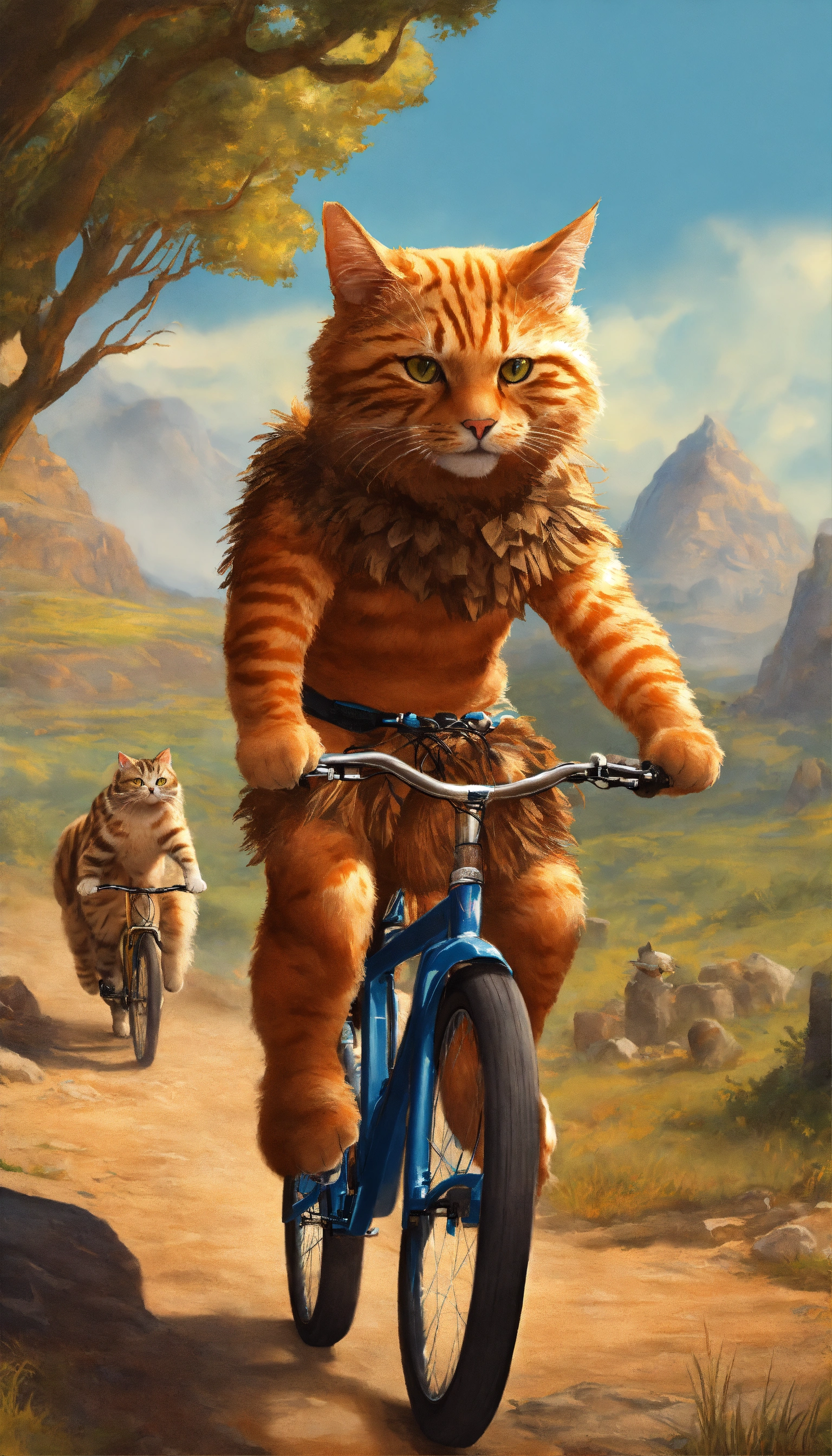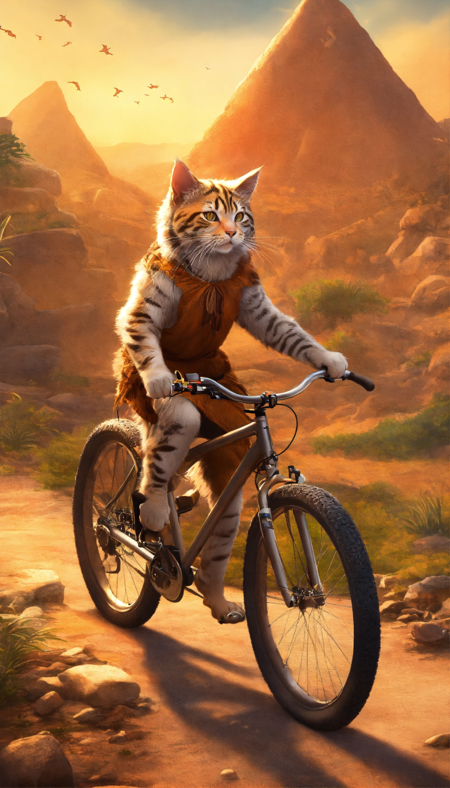 Design an image of a cat biking through a prehistoric landscape wearing a caveman costume, complete with a bone in its fur and a loincloth.