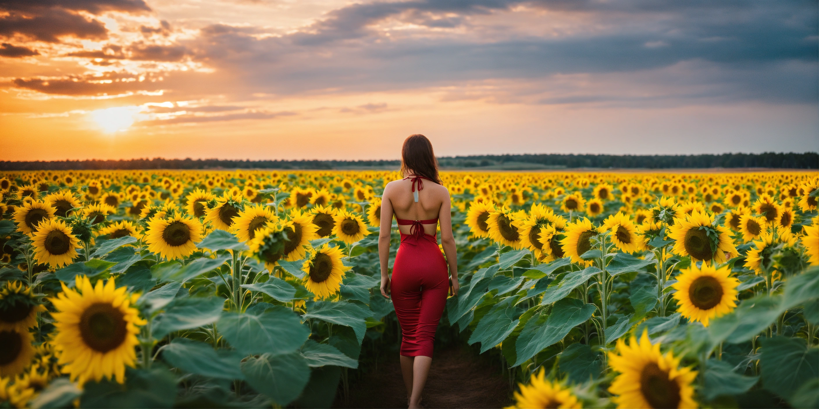 Lady wearing ukrainian traditional styled green swimming suit near see side holding giant memorycard in a field of sunflower