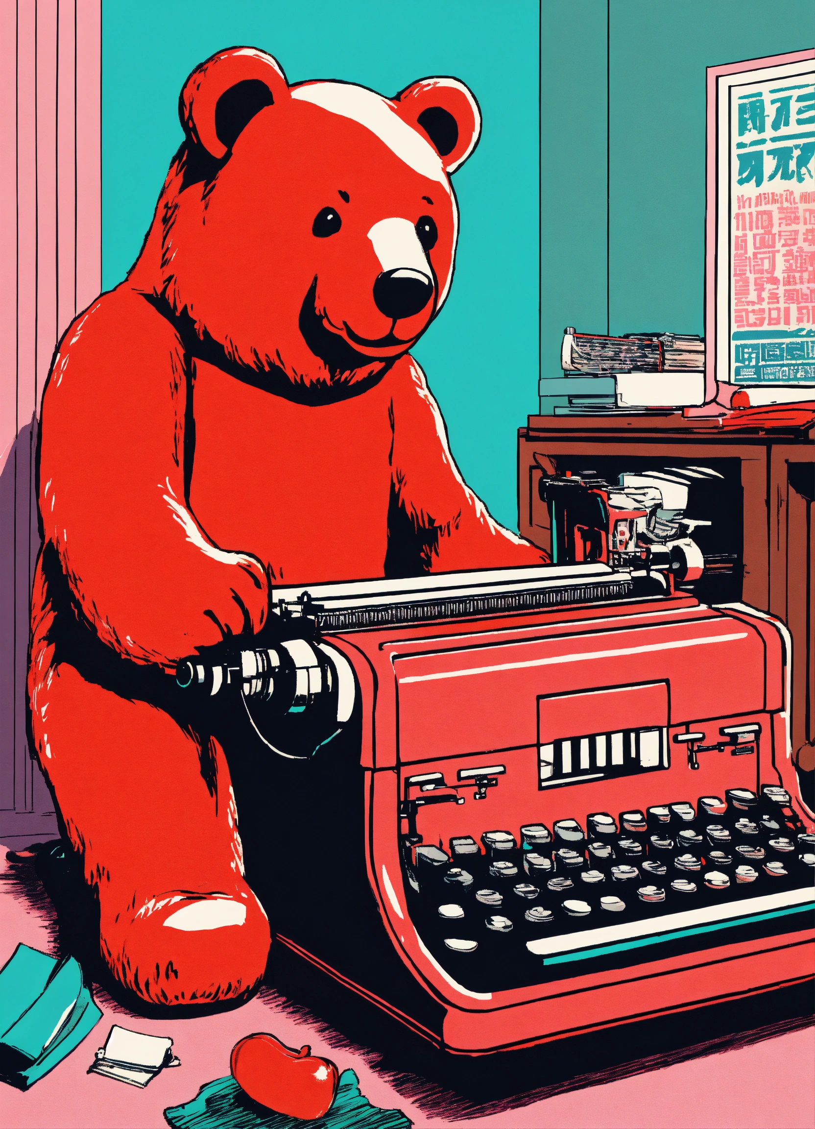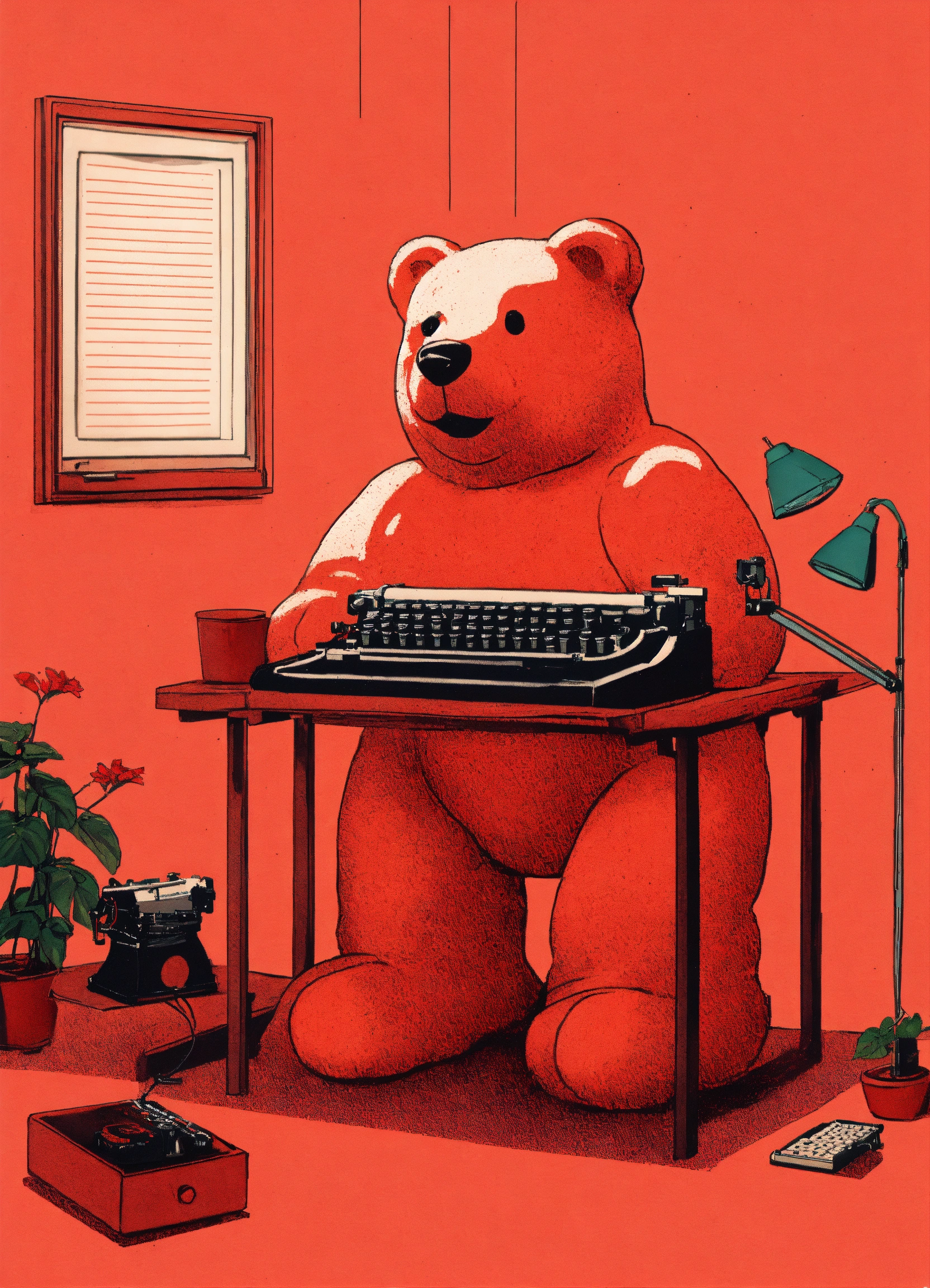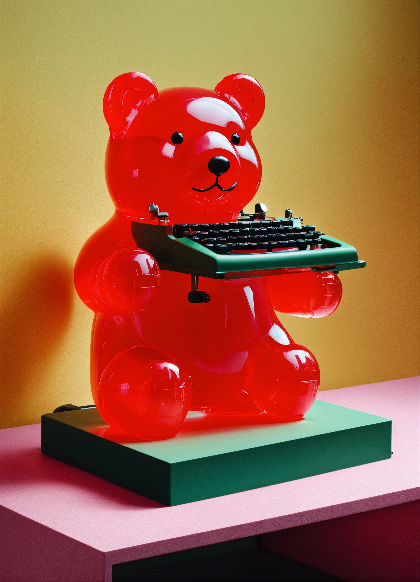 A giant light red gummy bear facing a typewriter risograph