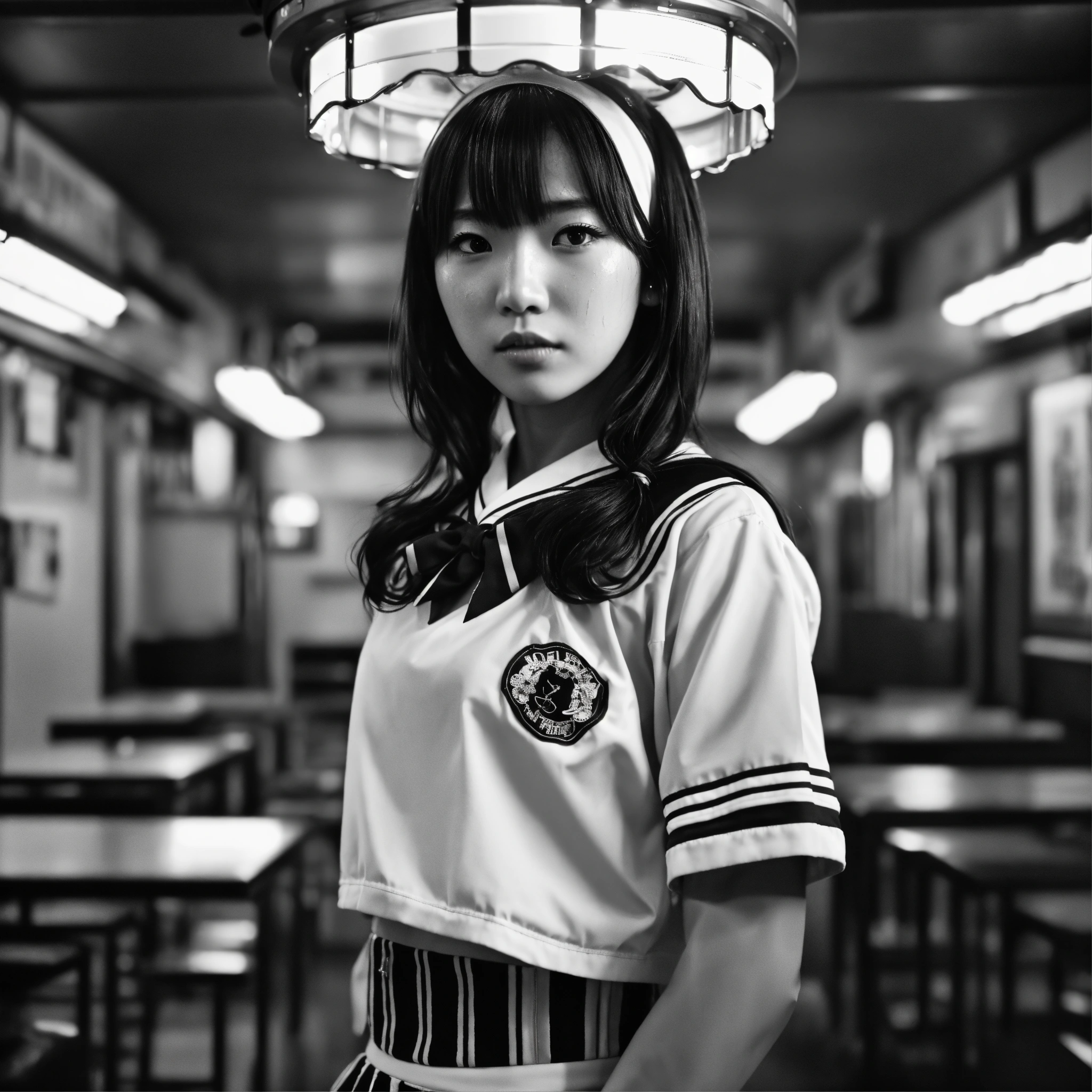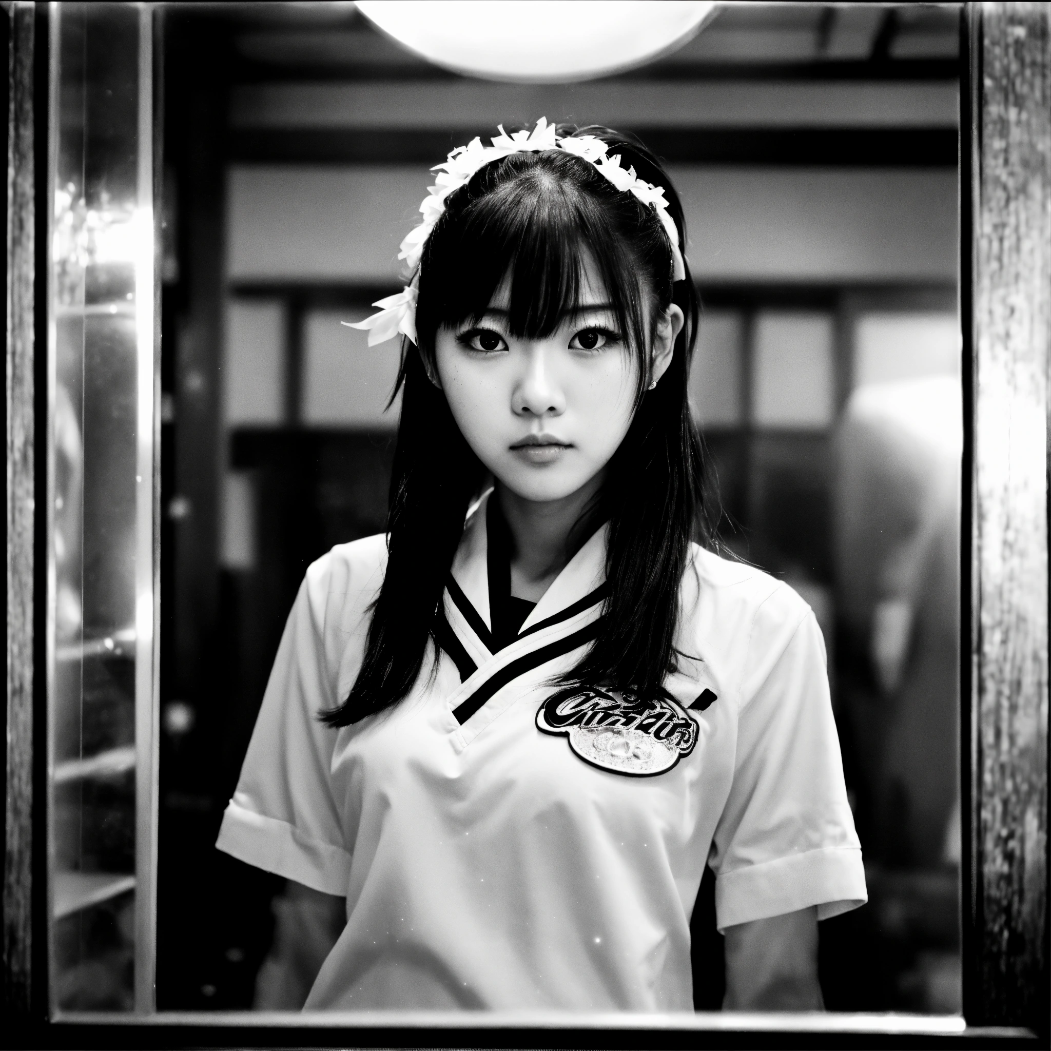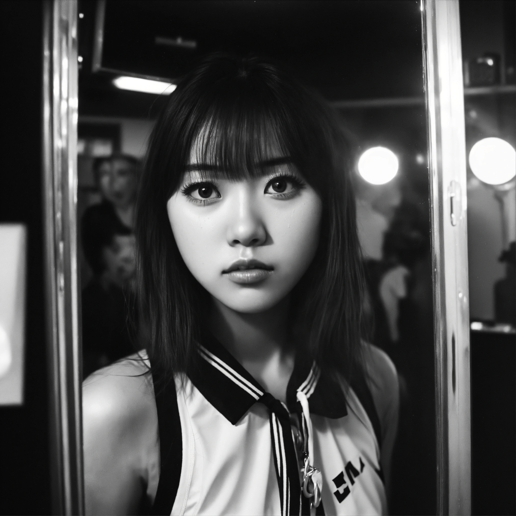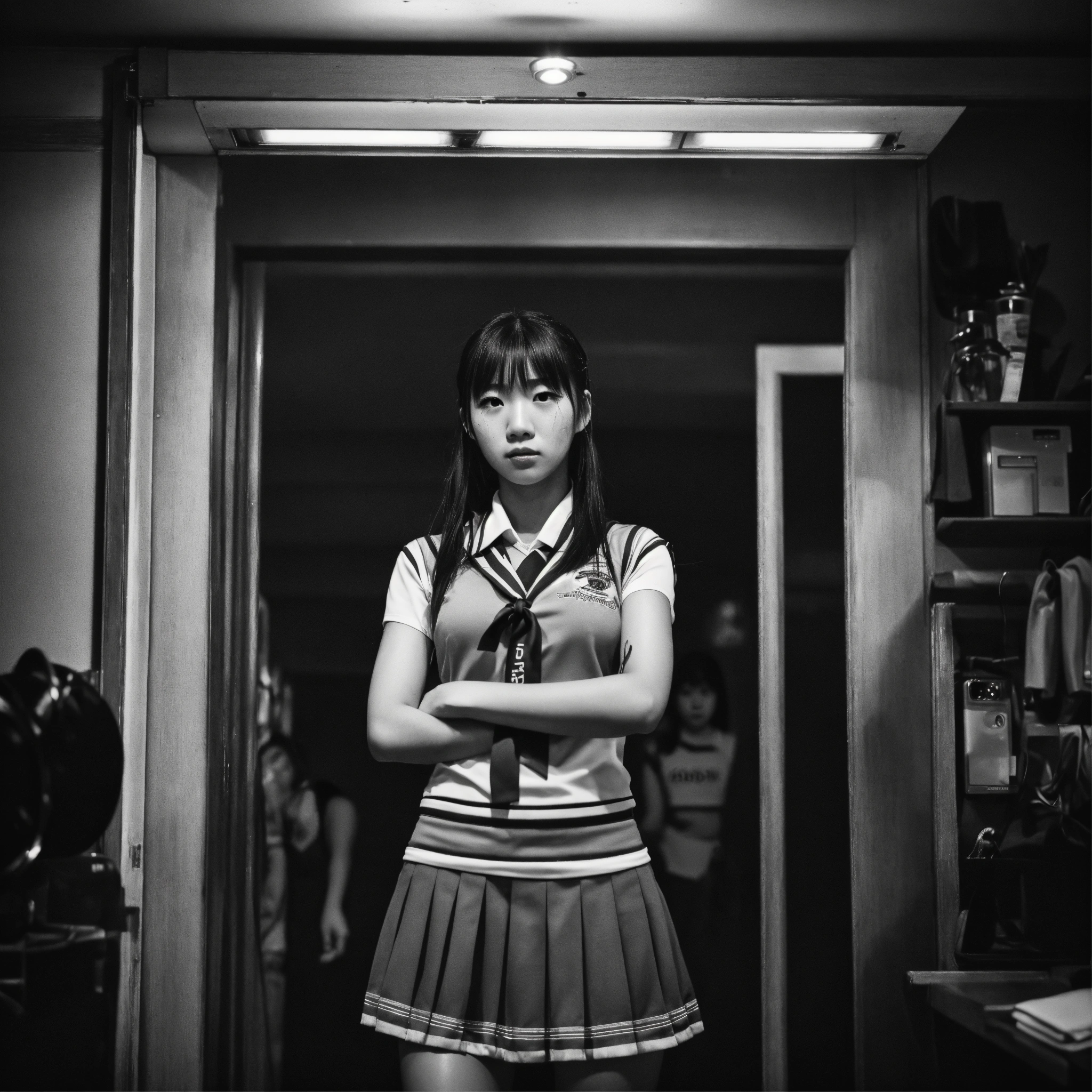Extremely detailed photographic image, portrait of an extremely sweat-drenched beautiful japanese realistic high school idol girl, captured by a surveillance camera inside a mirror, from the ceiling of the scene, dressed in a idol-like cheerleader costume with mini skirt, in a grainy monochrome image, staring into the camera