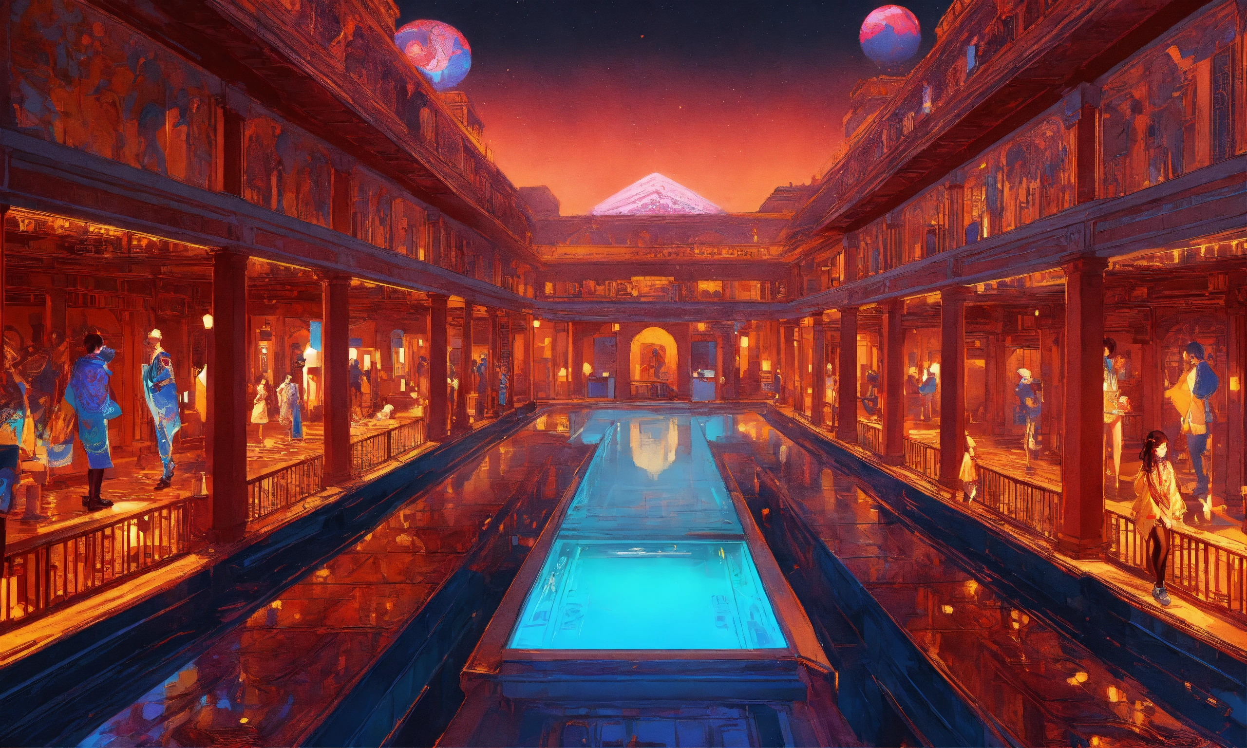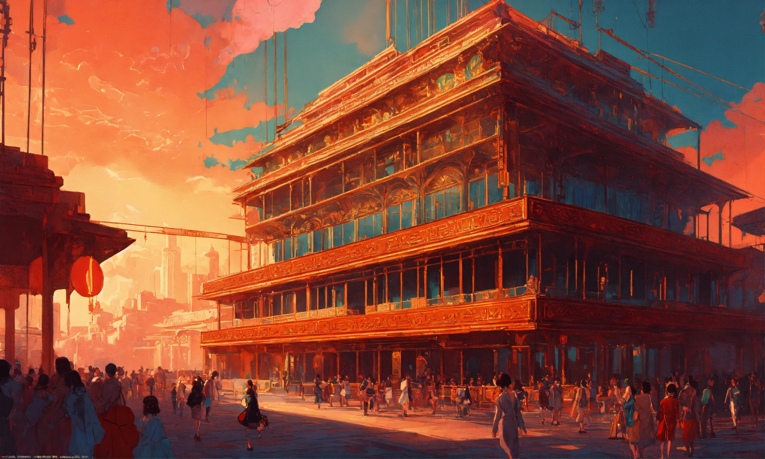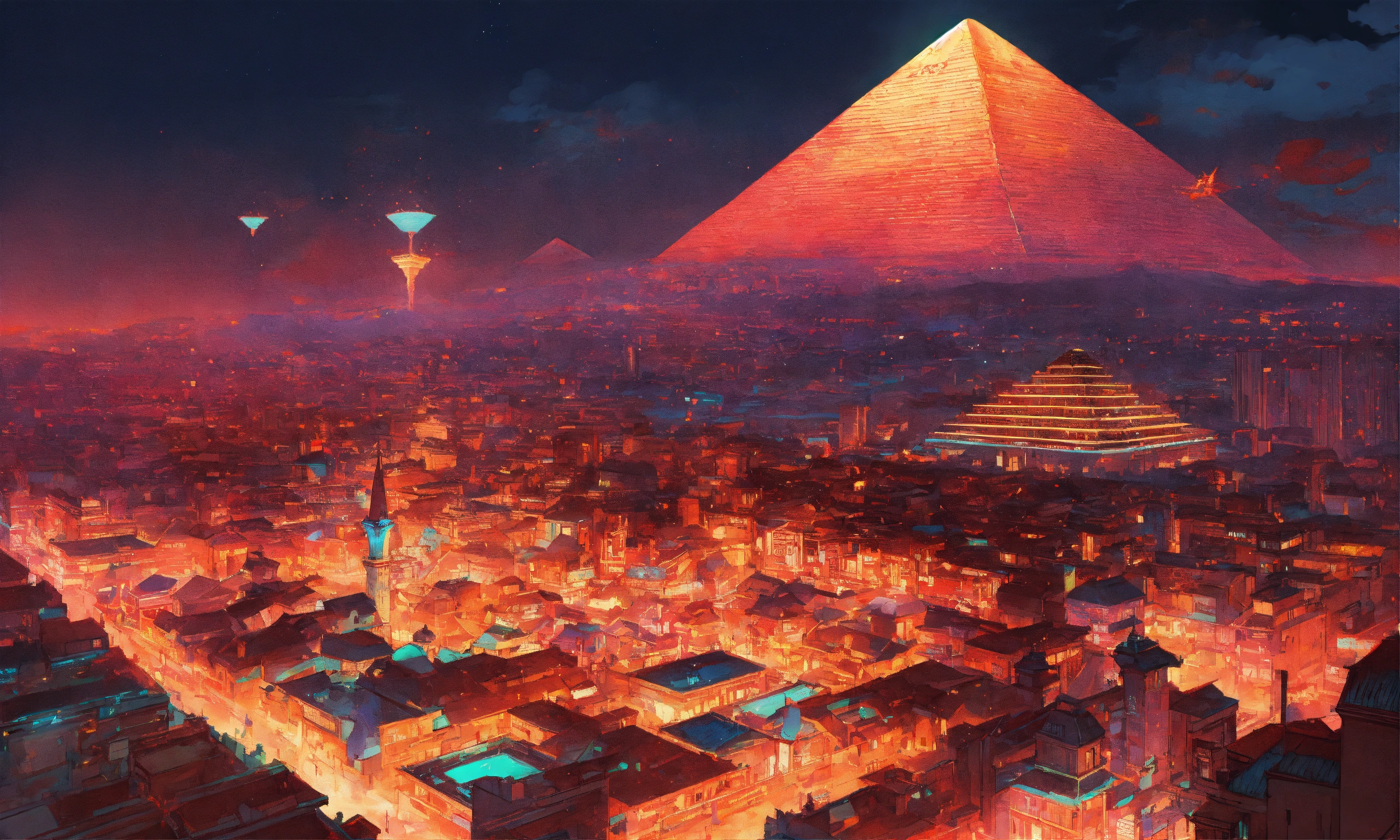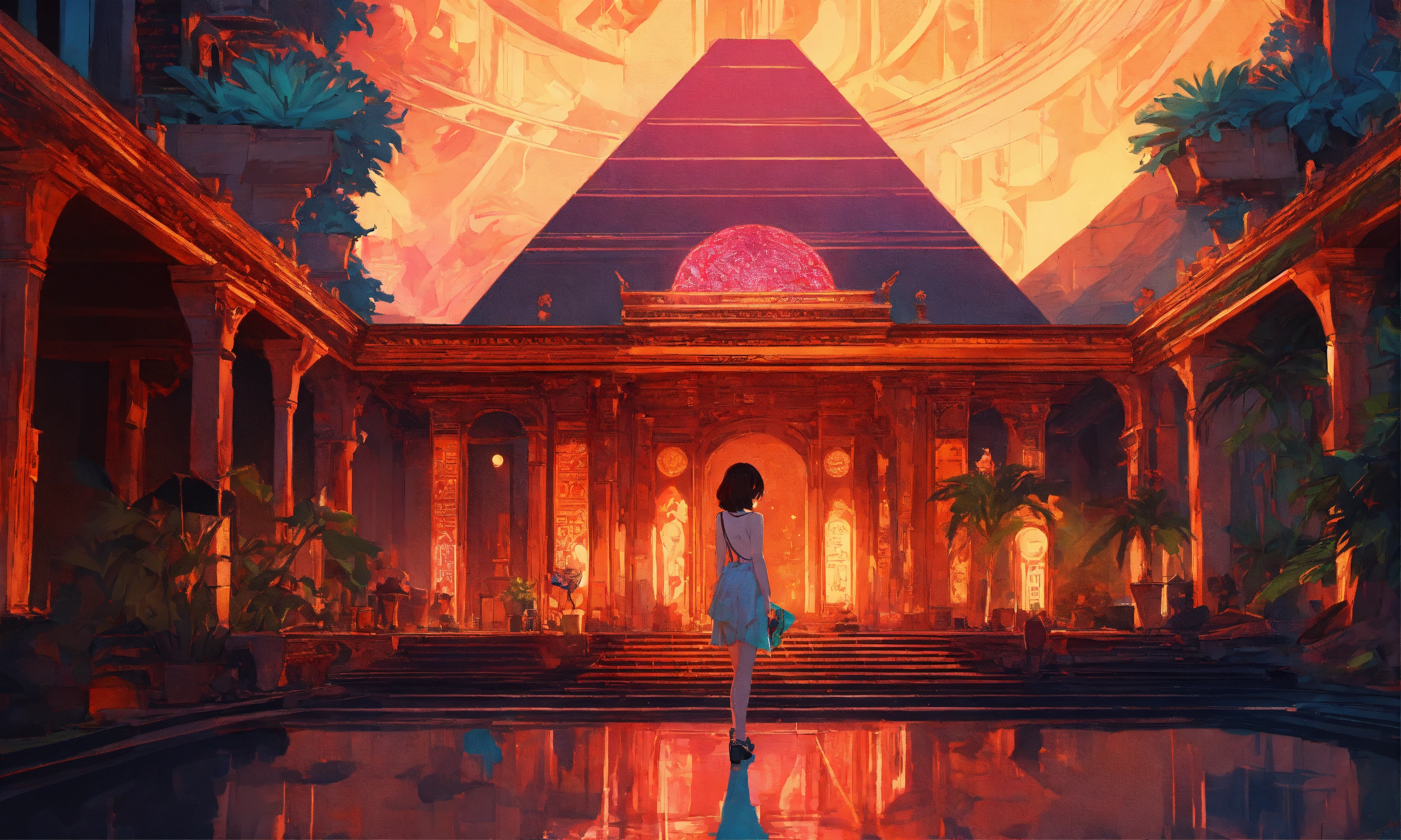 Palace, egyptian architecture, red and gold, ernst haeckel maria sibylla merian. tristan eaton, victo ngai, artgerm, rhads, ross draws, kaethe butcher, hajime sorayama, greg tocchini, virgil finlay, fantasy, colors, neon lights, digital painting, pixiv, by ilya kuvshinov, neon lights, 3d, perspective