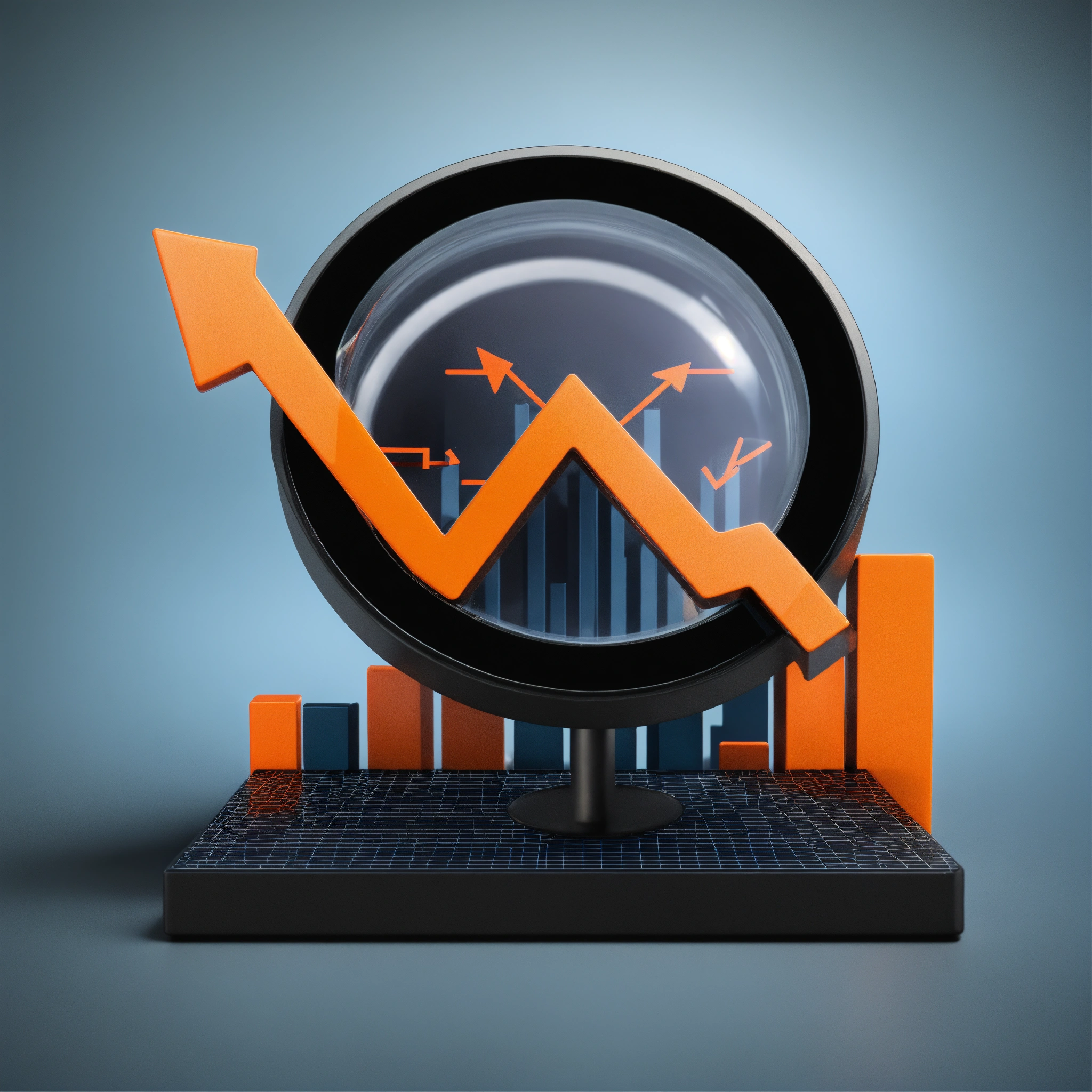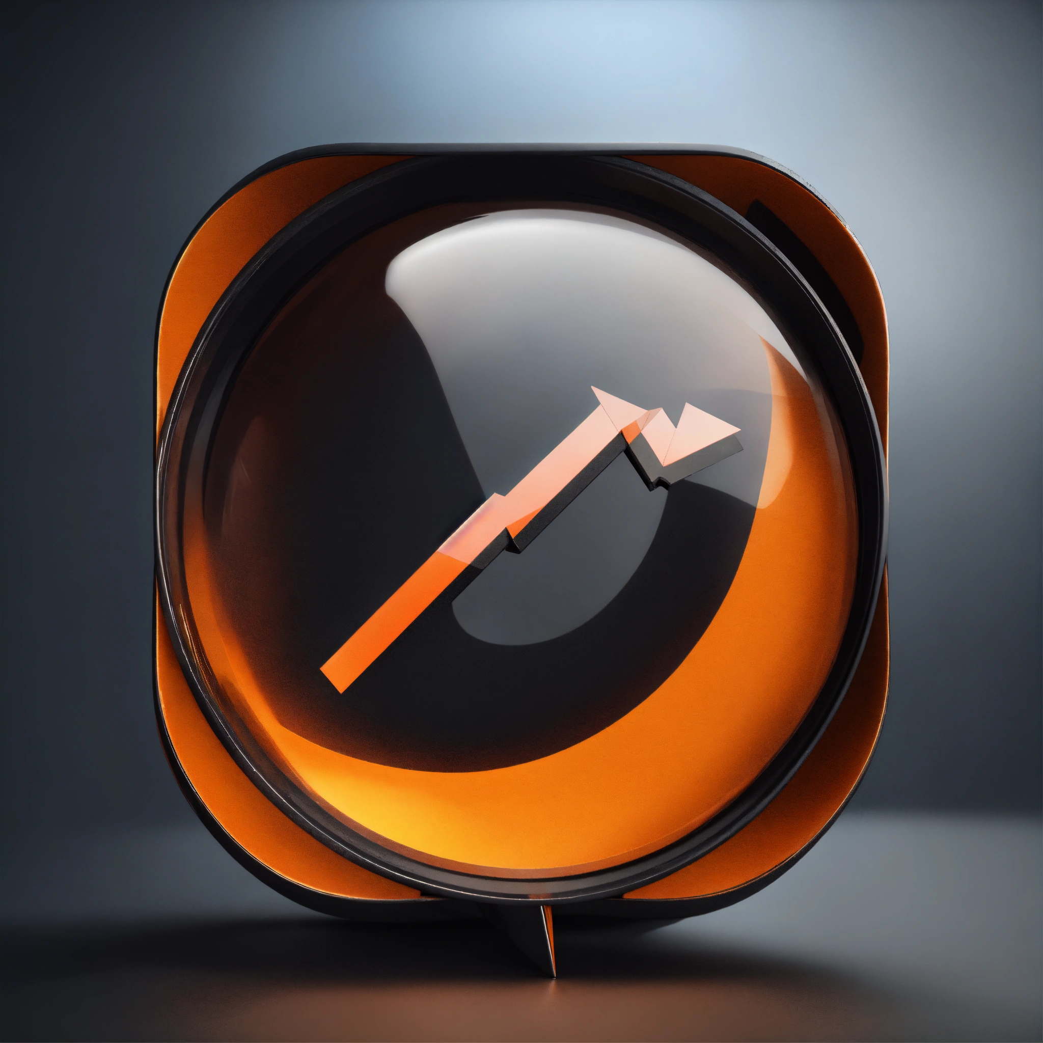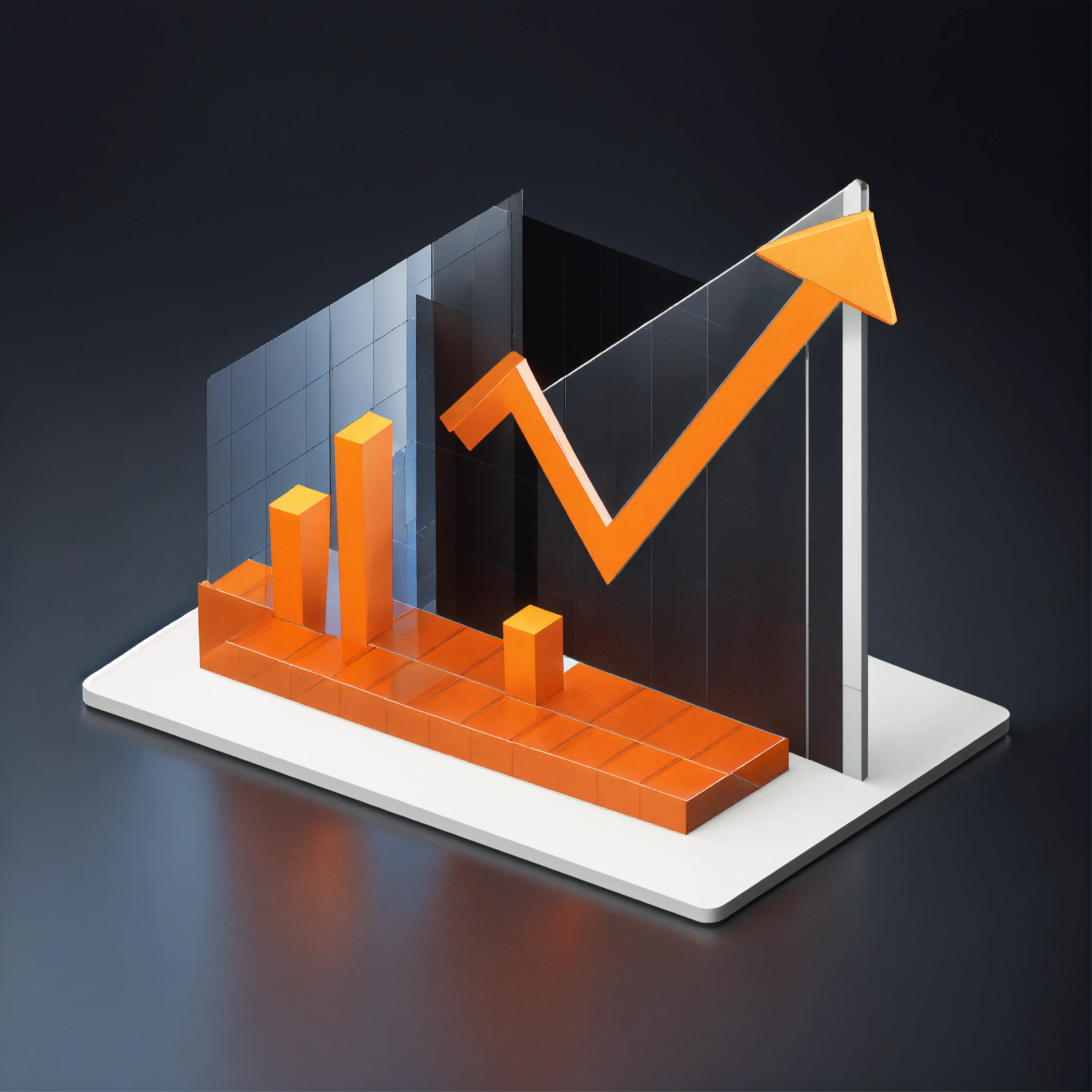 Icon in 3 d, magnification of the graph with an up arrow on the graph itself, icon in black, arrow orange