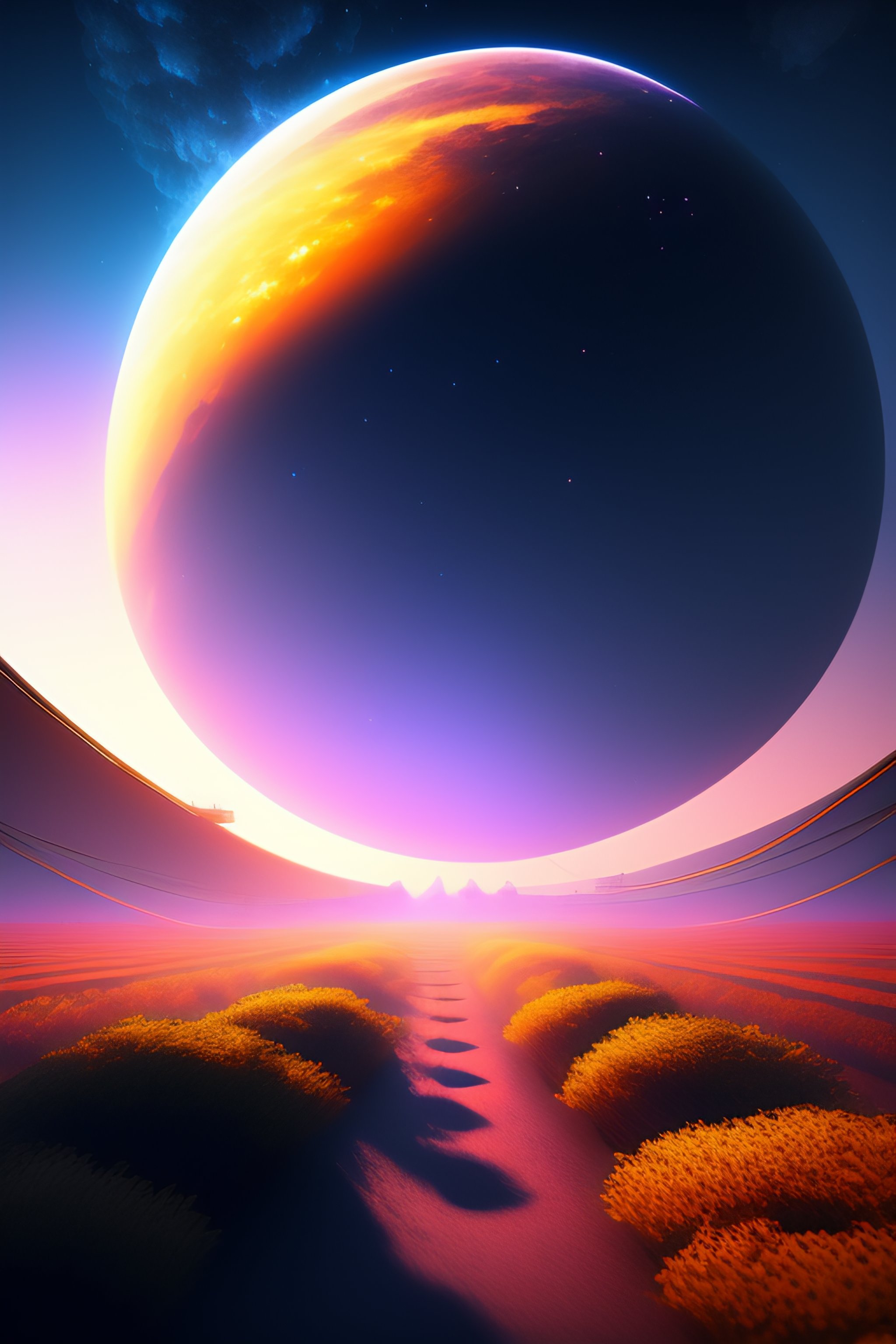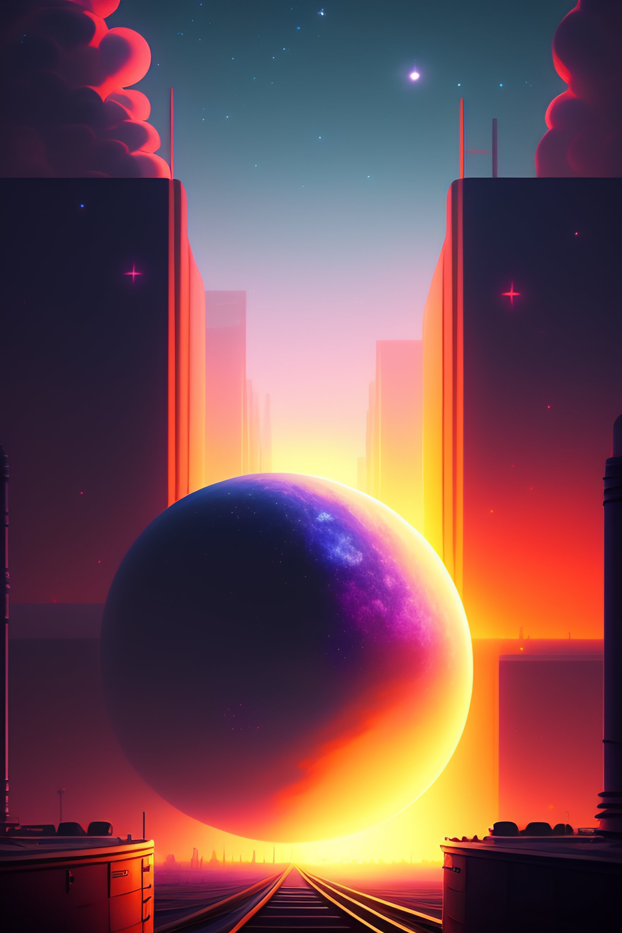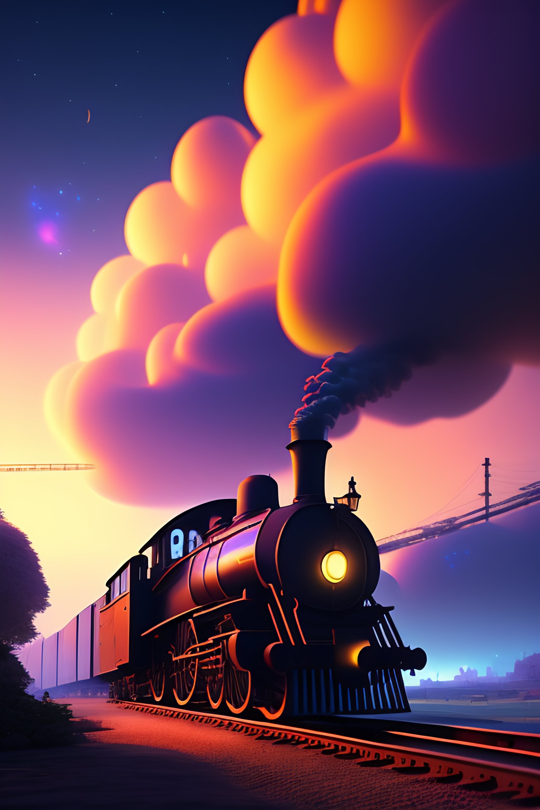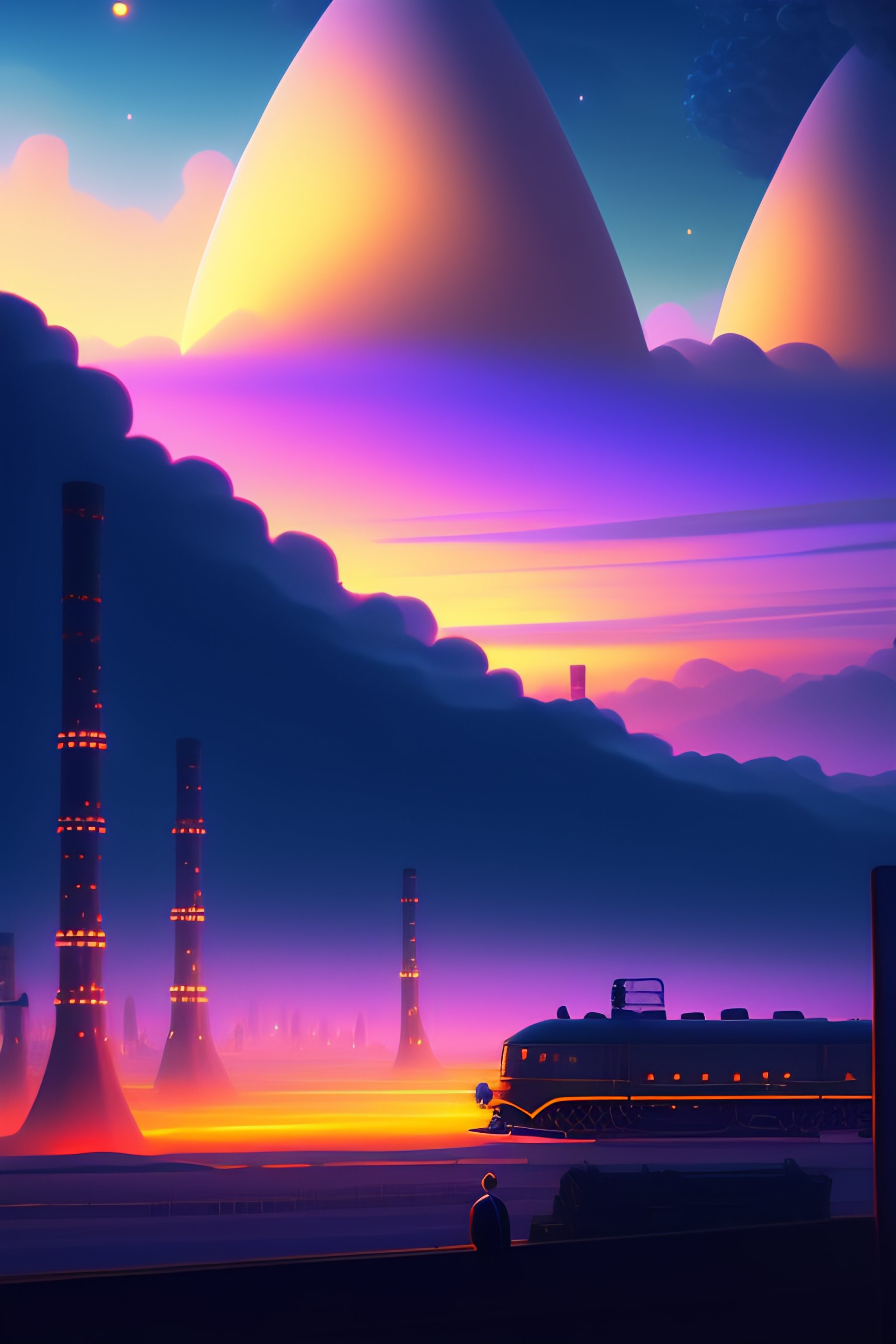 Surrealist anime illustrated starry night painting transorming into reality cinematic shot, volumetric lighting, hayao miyazaki art style, studio ghibli style, isometric, digital art, smog, pollution, toxic waste, chimneys and railroads, 3 d render, octane render, volumetrics, by greg rutkowski
