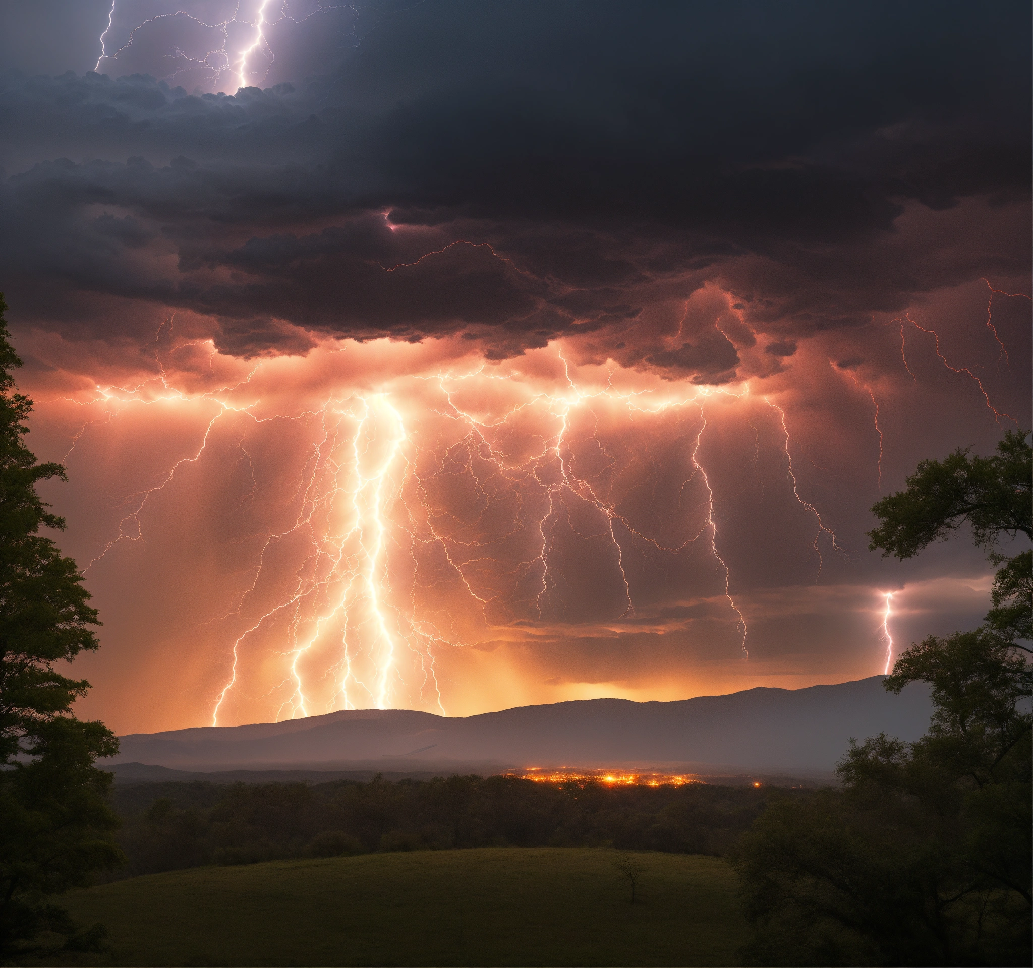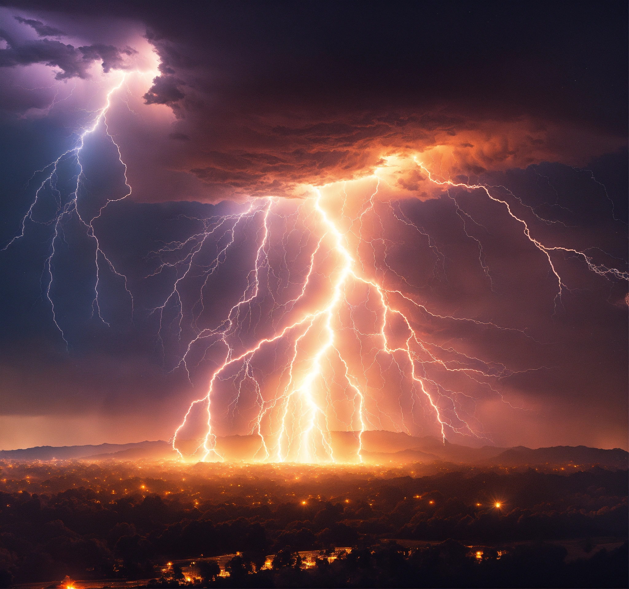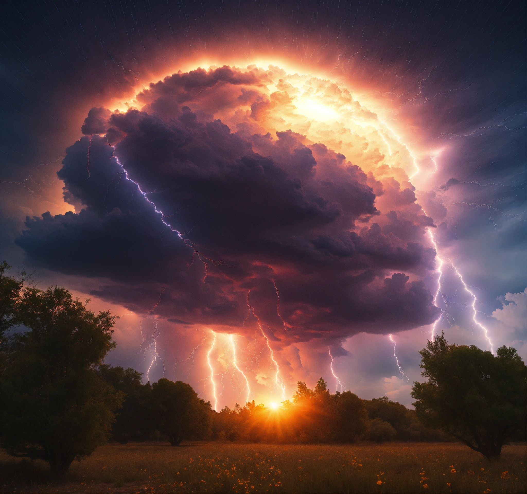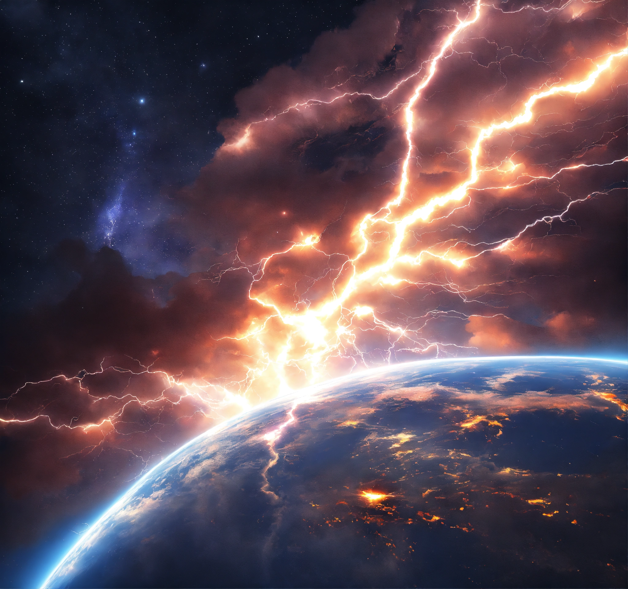 Please generate a dynamic visual of a digital universe with a lightning storm and the sun, make it joyful