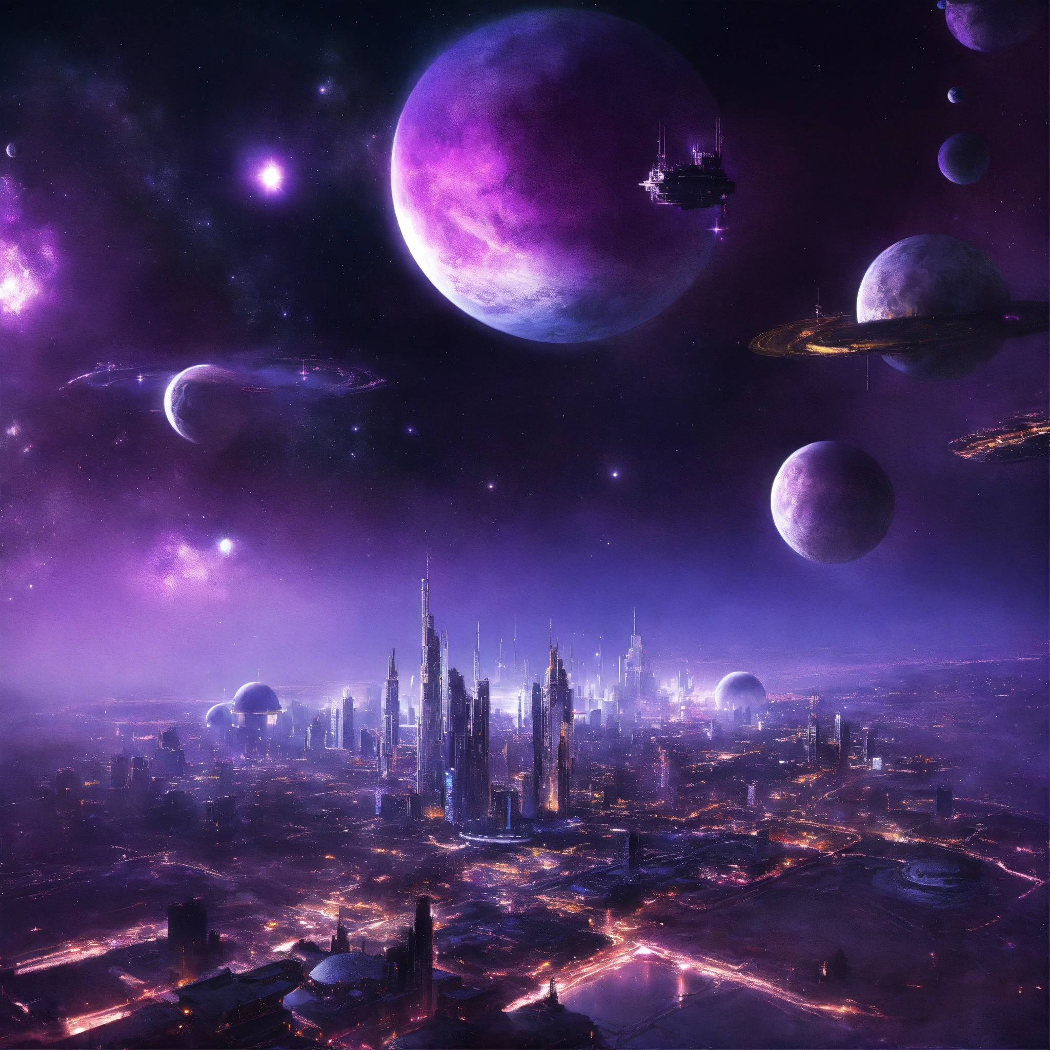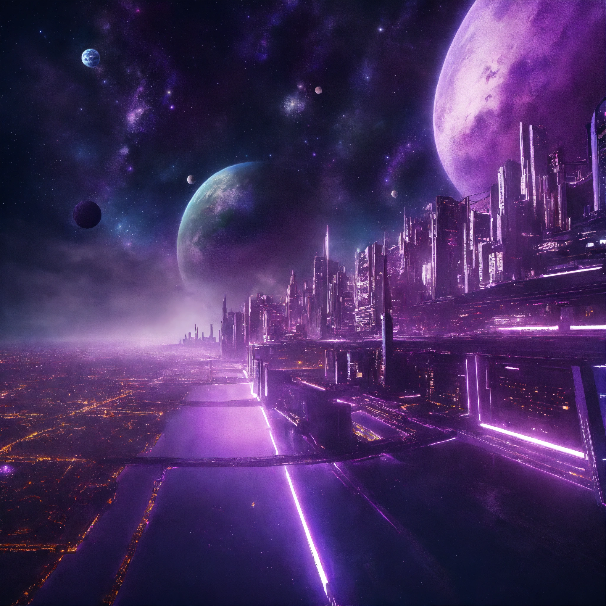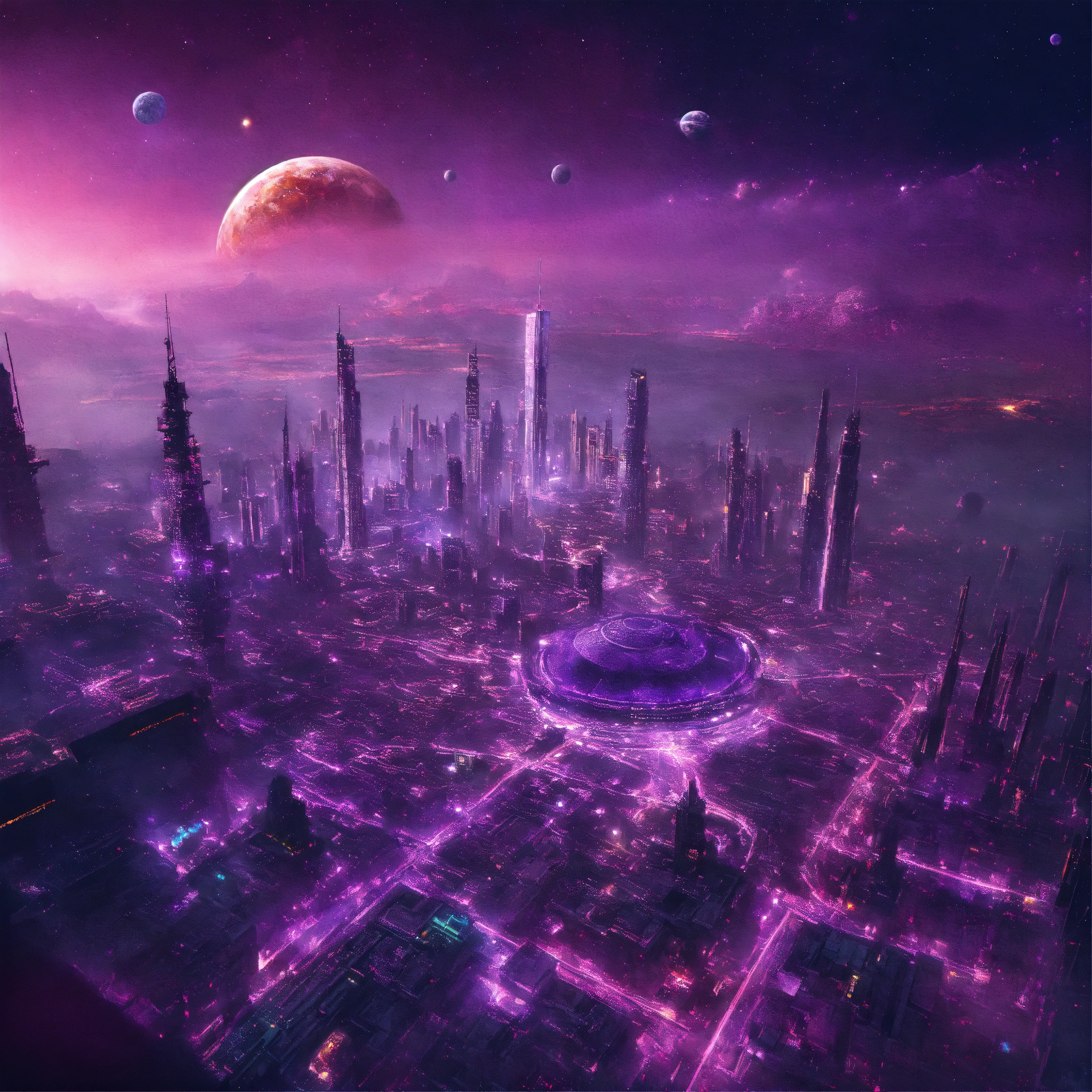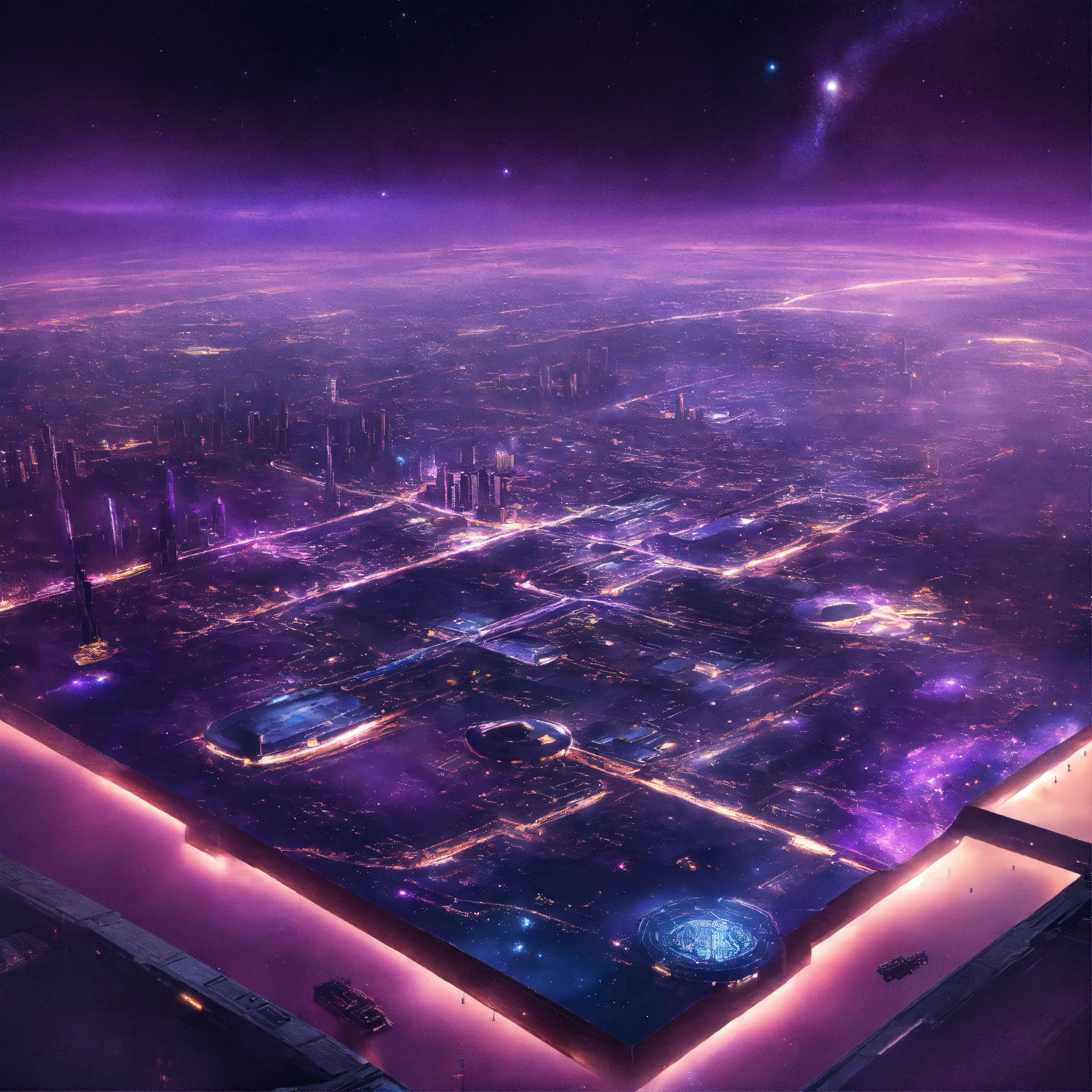 Purple space city in space from top