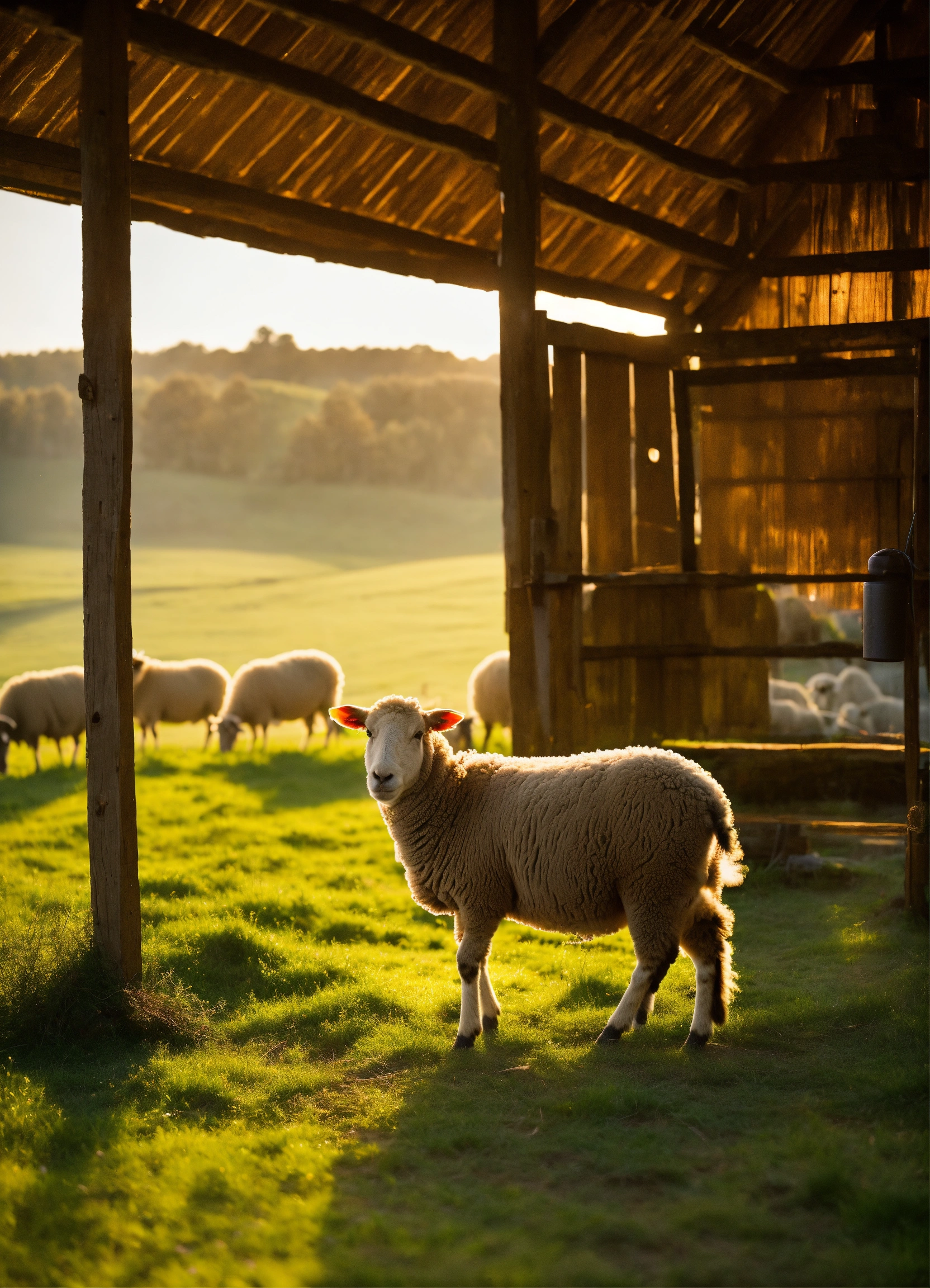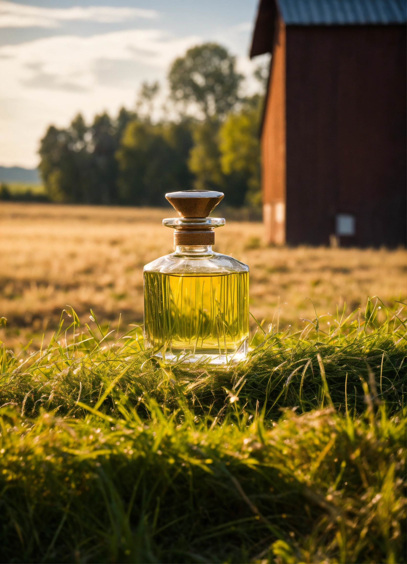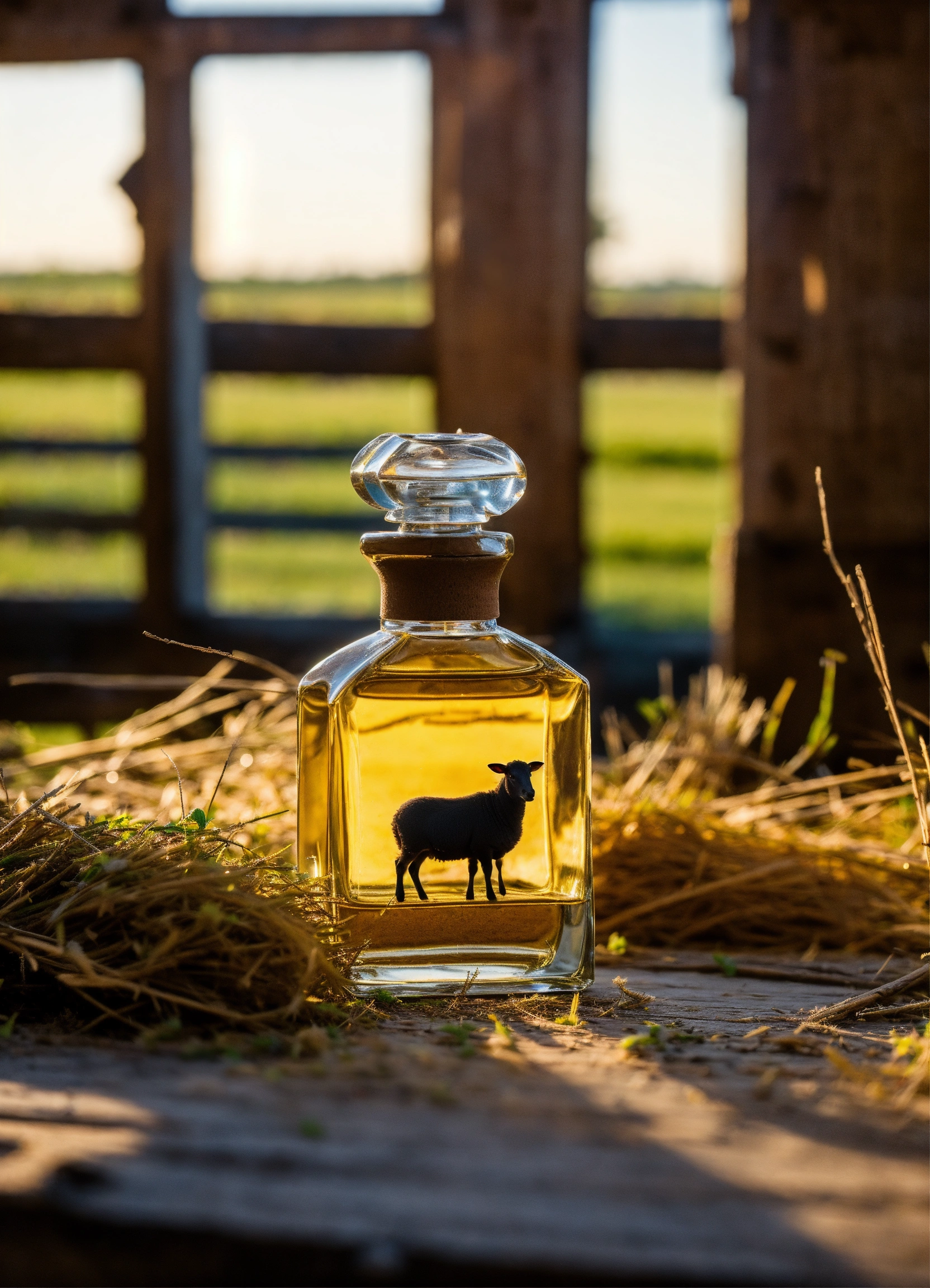 Full length view, barn in the early morning, scent of fresh hay, sheep on the back. it was a soothing fragrance of hard work and nature. close-up on few perfume bottles, nikon d5600 photography
