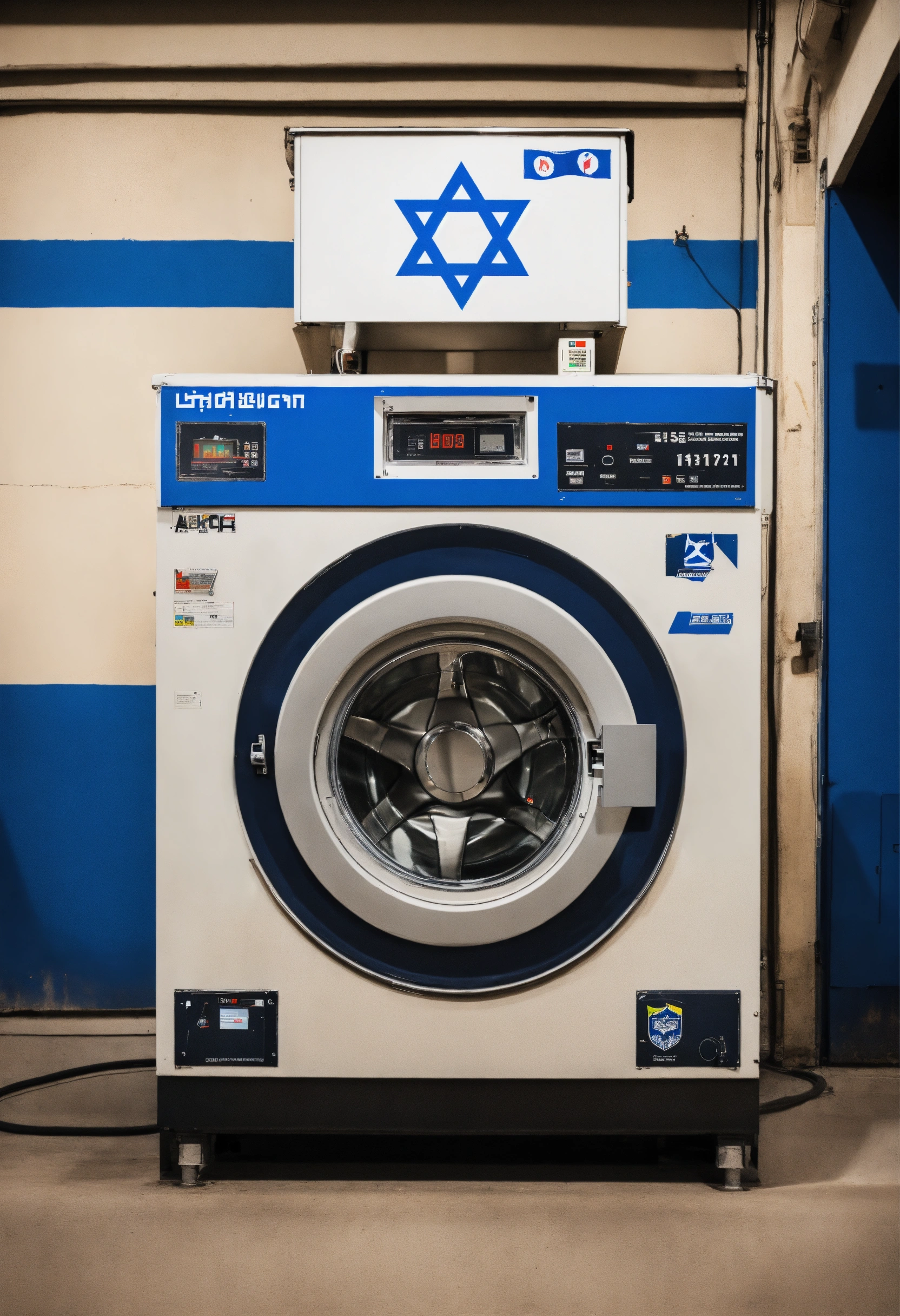 An industrial washing machine in the colors of the israeli flag, with a pilot wearing an israeli air force helmet standing next to the machine