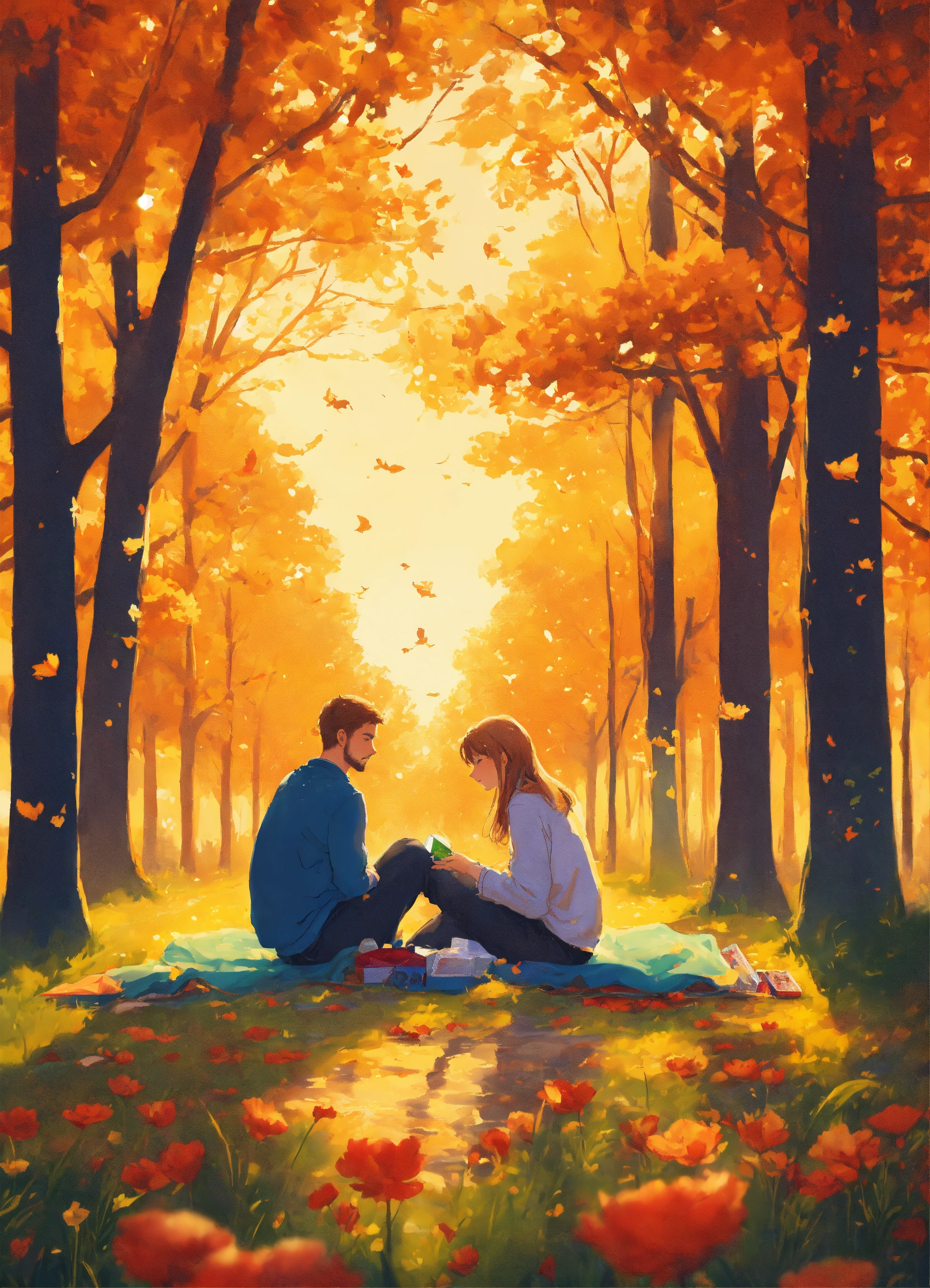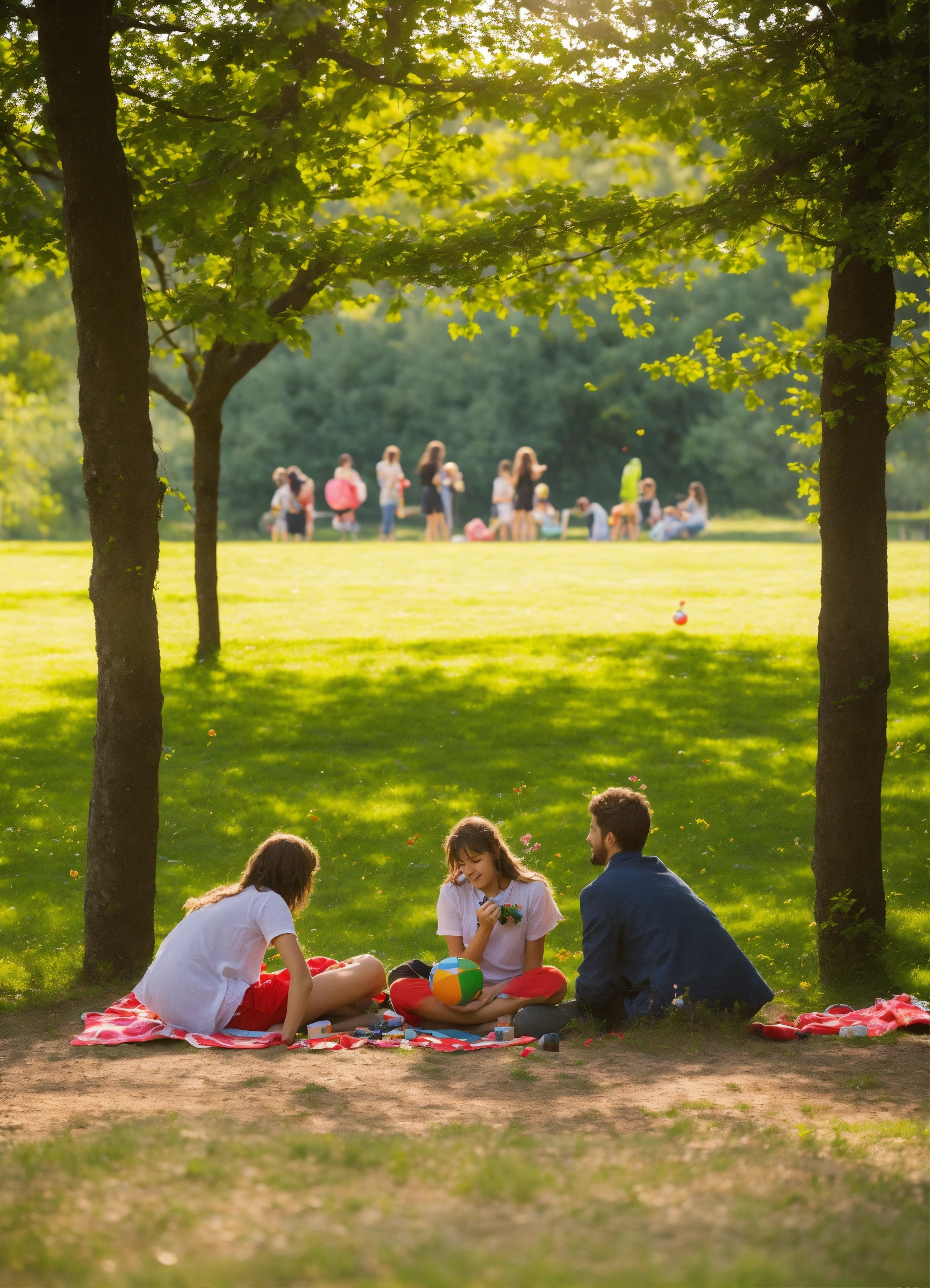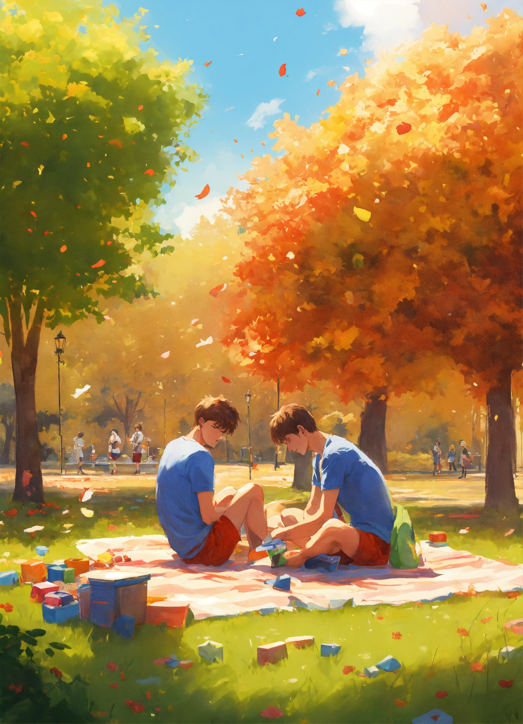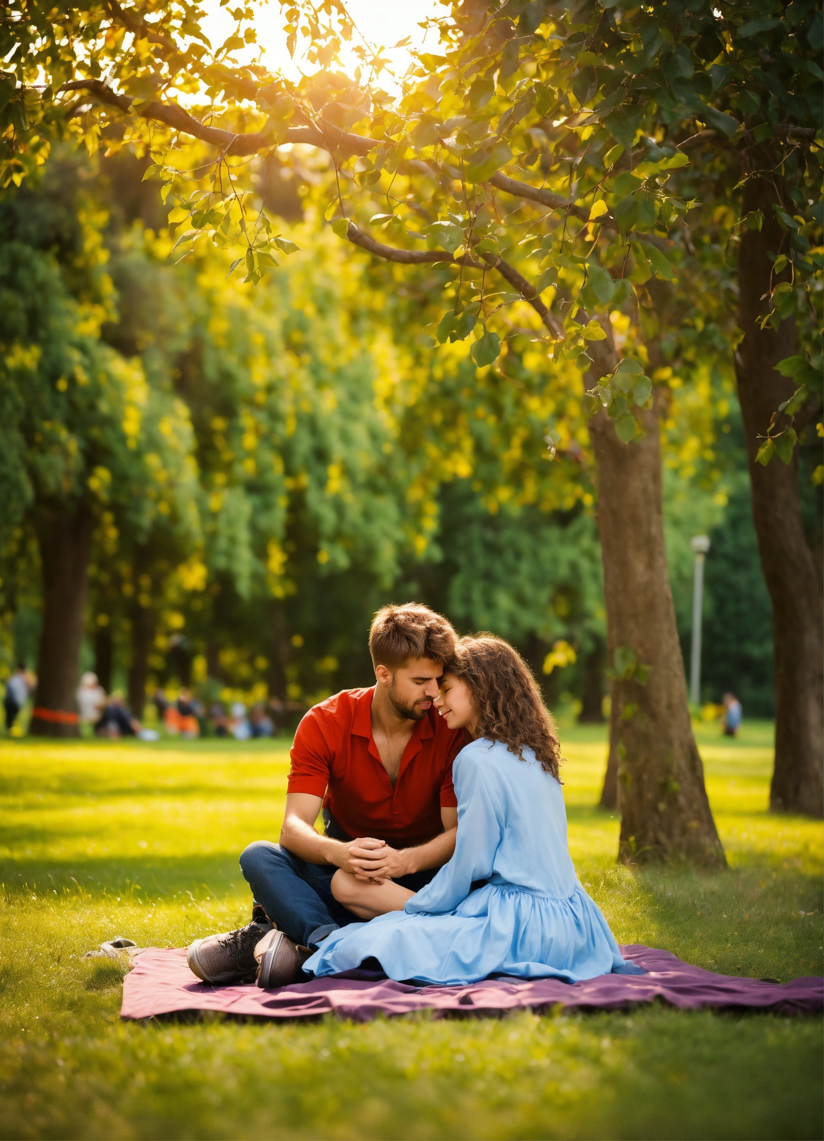 Cette image dépeint une scène paisible dans un parc. les deux jeunes sont assis sur une couverture sur l'herbe, riant et discutant. autour d'eux, d'autres personnes profitent de la journée ensoleillée, certaines faisant un pique-nique, d'autres jouant à des jeux ou simplement en train de se détendre. le fond de l'image est floutté