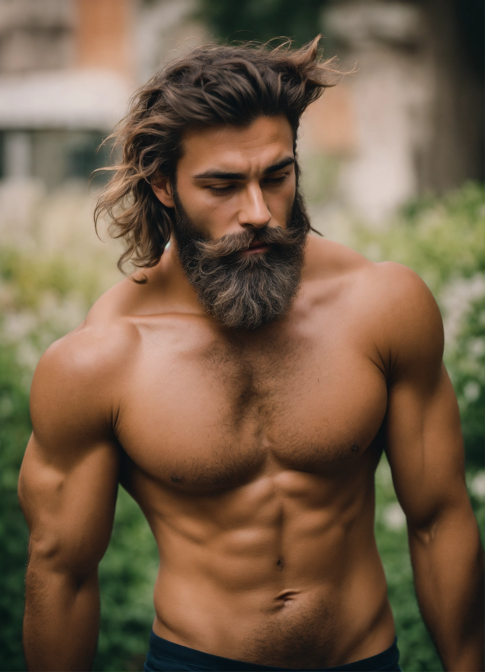Homme humain tenant du loup. très grand, air sauvage, blanc de peau, cheveux brun, yeux vert avec une barbe courte épaisse, sourcils épais. très carrée d'épaule et extrêmement musclé. habillé avec des vêtement tendu près à se déchirer. avec des dents et des ongles acérés. présence intimidante. posture prédatrice