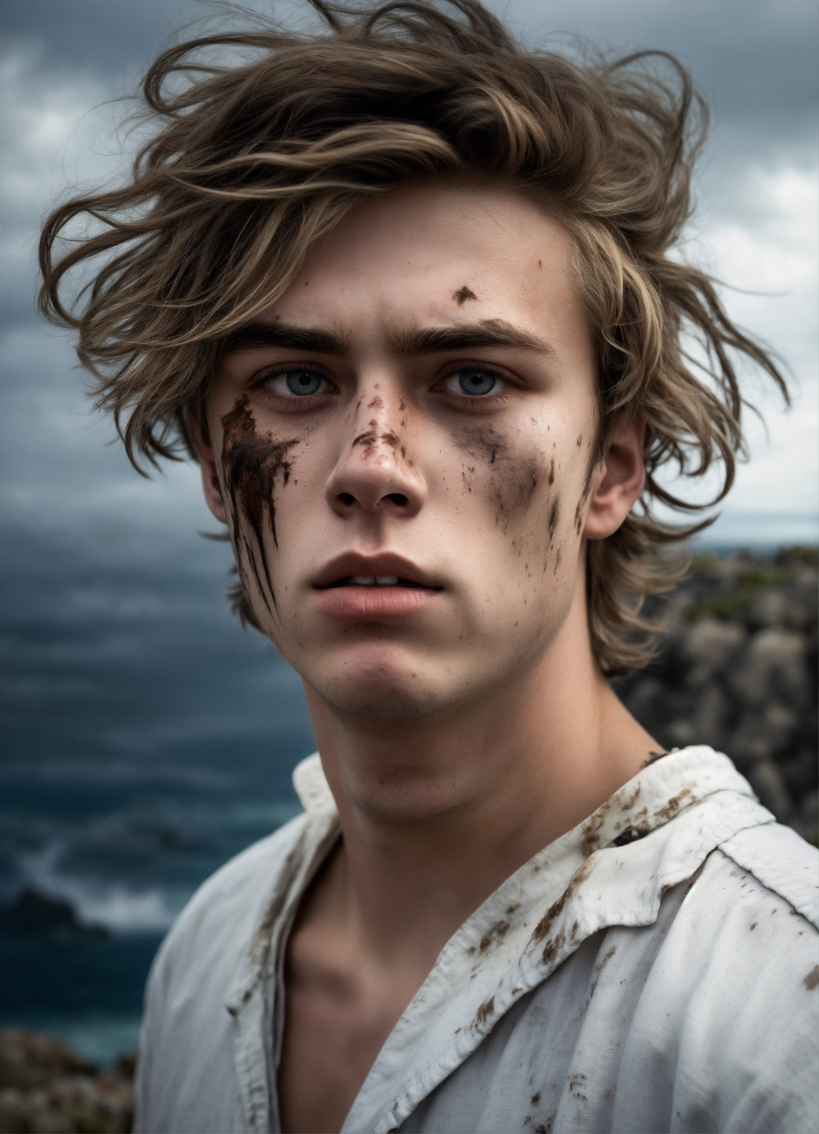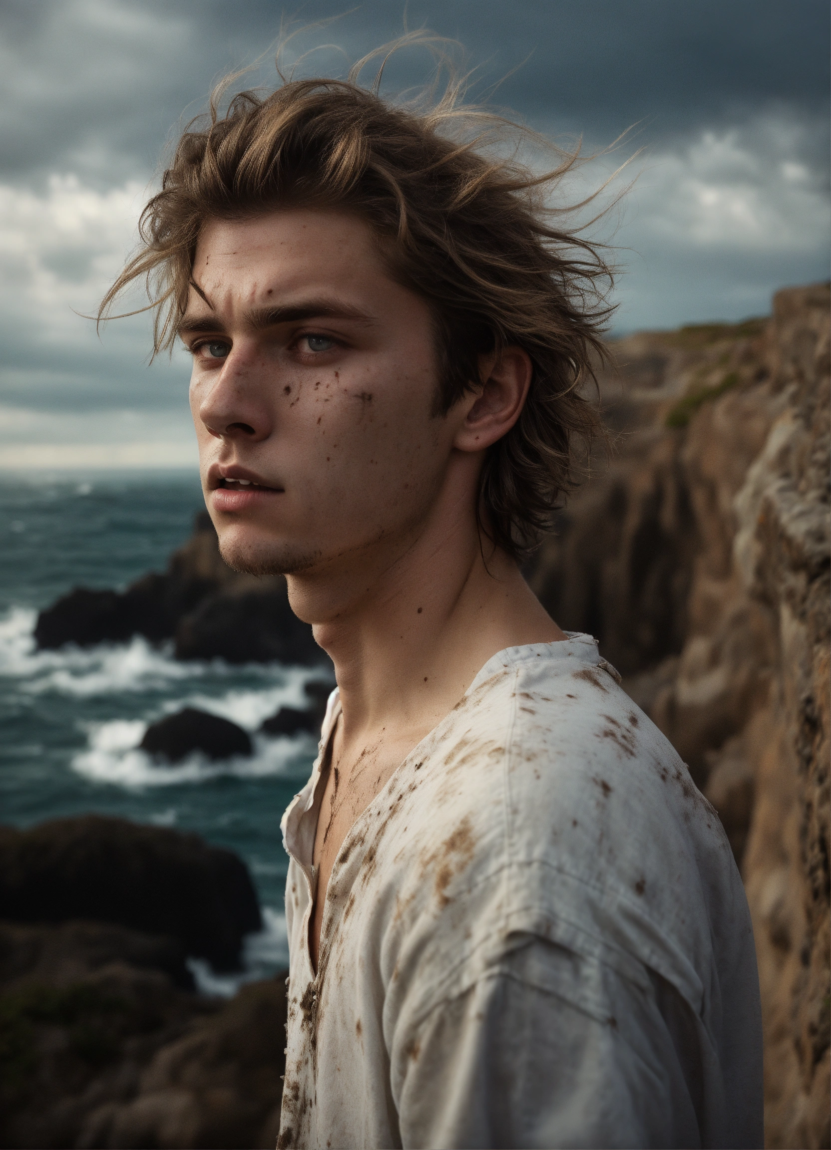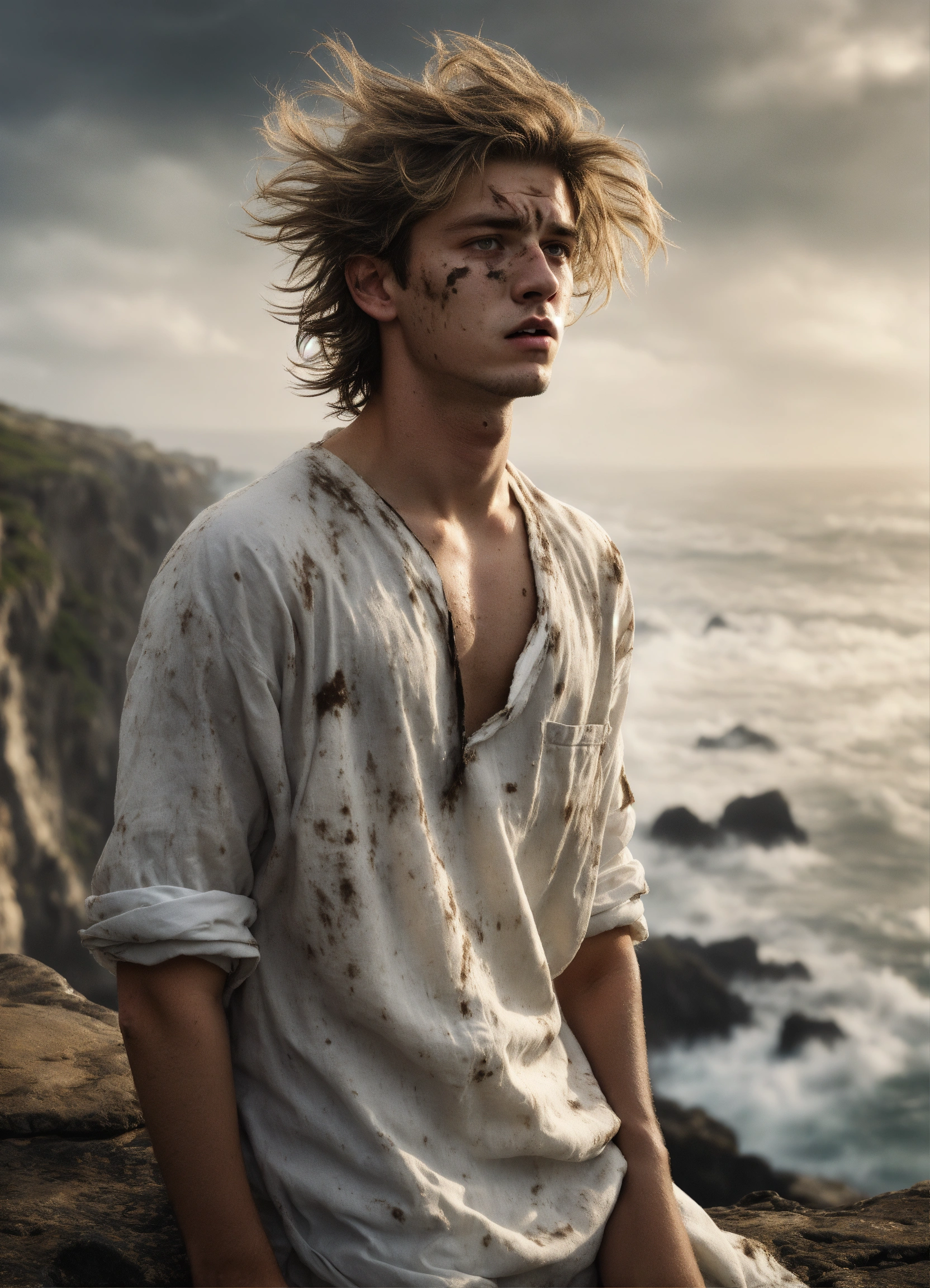 A highly realistic photograph of a white scared 21 years old boy, with a scarred eye, with dirty face, thin lips, dark blonde mid-long hair, slanted brown eyes, messy hair, white skin, scared expression, wearing white dirty prisoner clothes, on a rocky cliff in front of the sea, storm sky, hyperrealistic, hyperdetailed, 4k