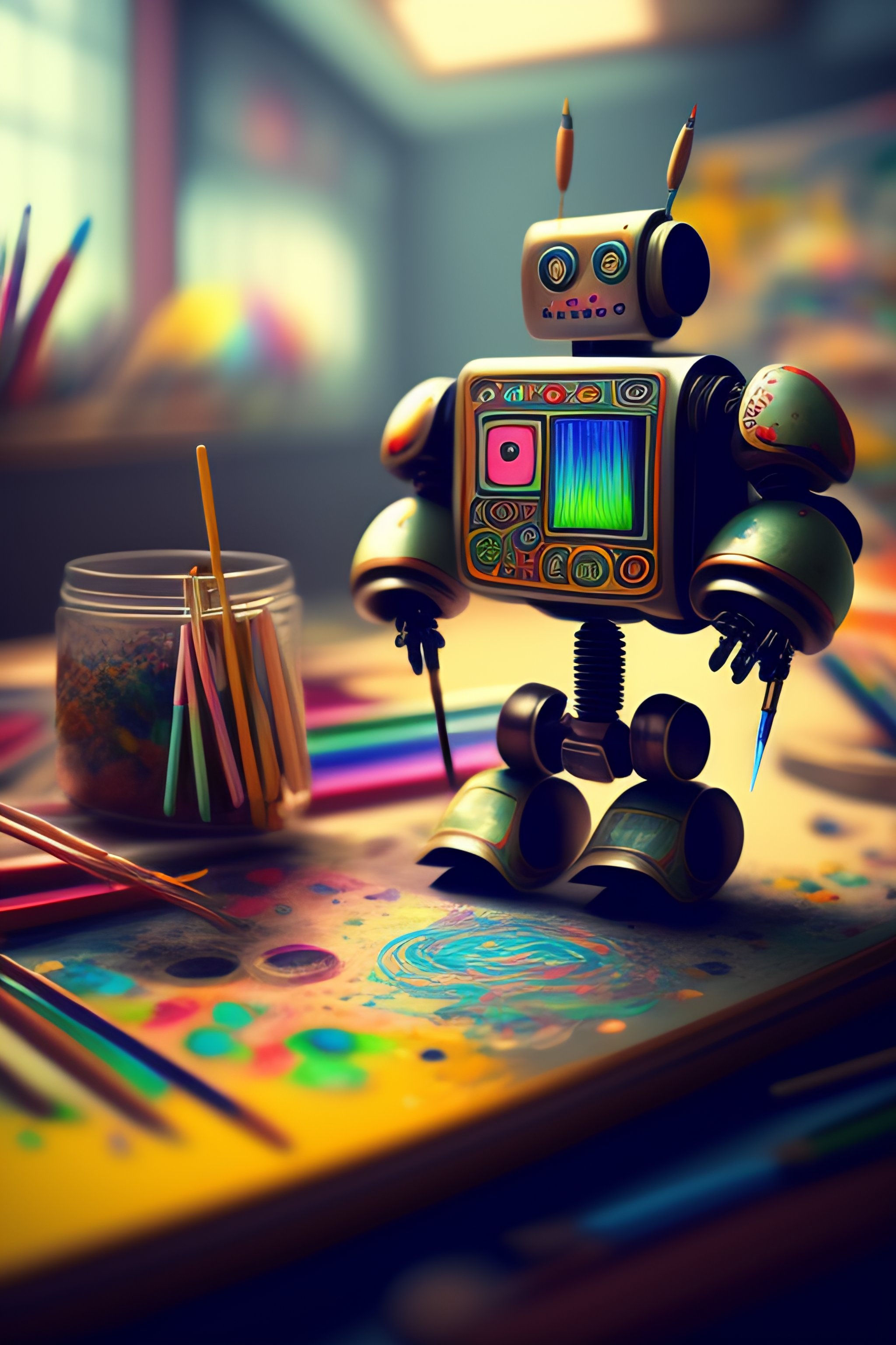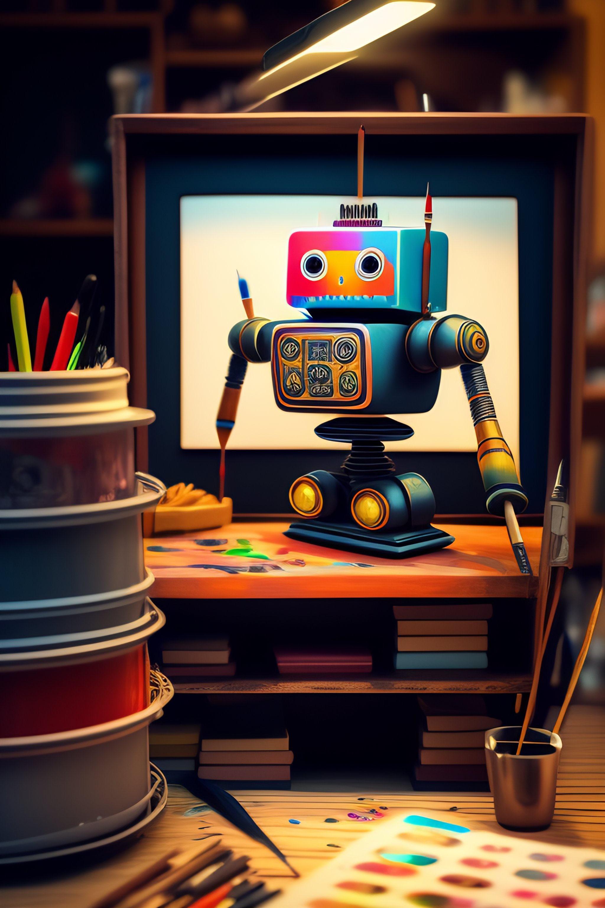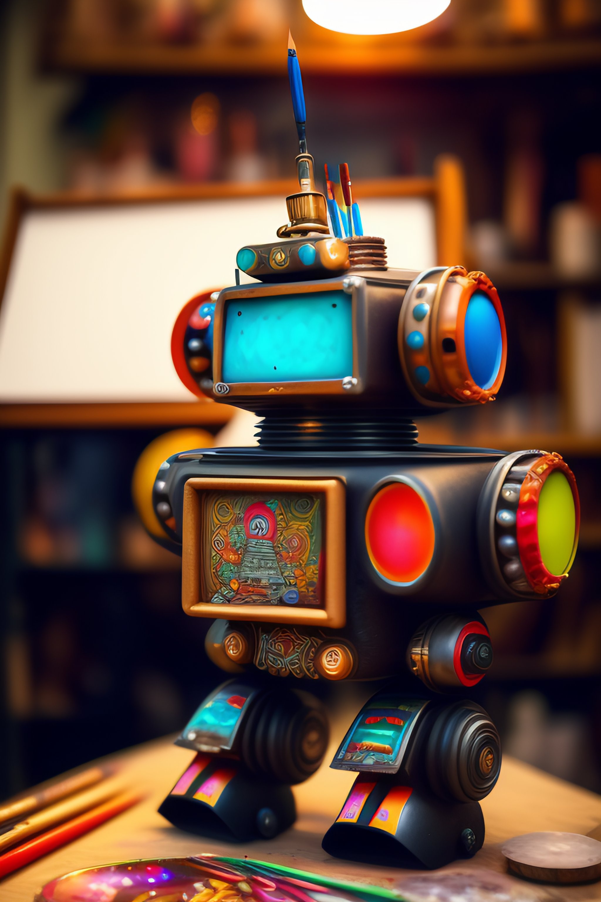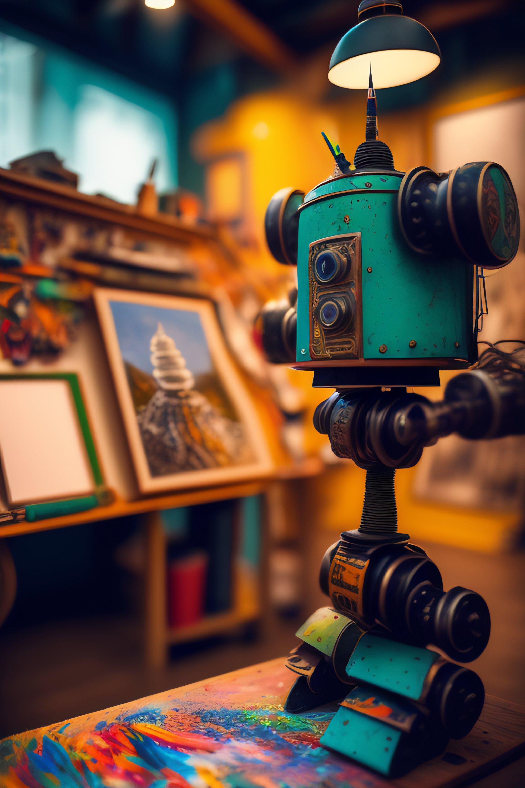 A detailed chaotic chaotic artist's workshop, inside is a cute robot drawing a picture with a paintbrush. the picture is of another robot.