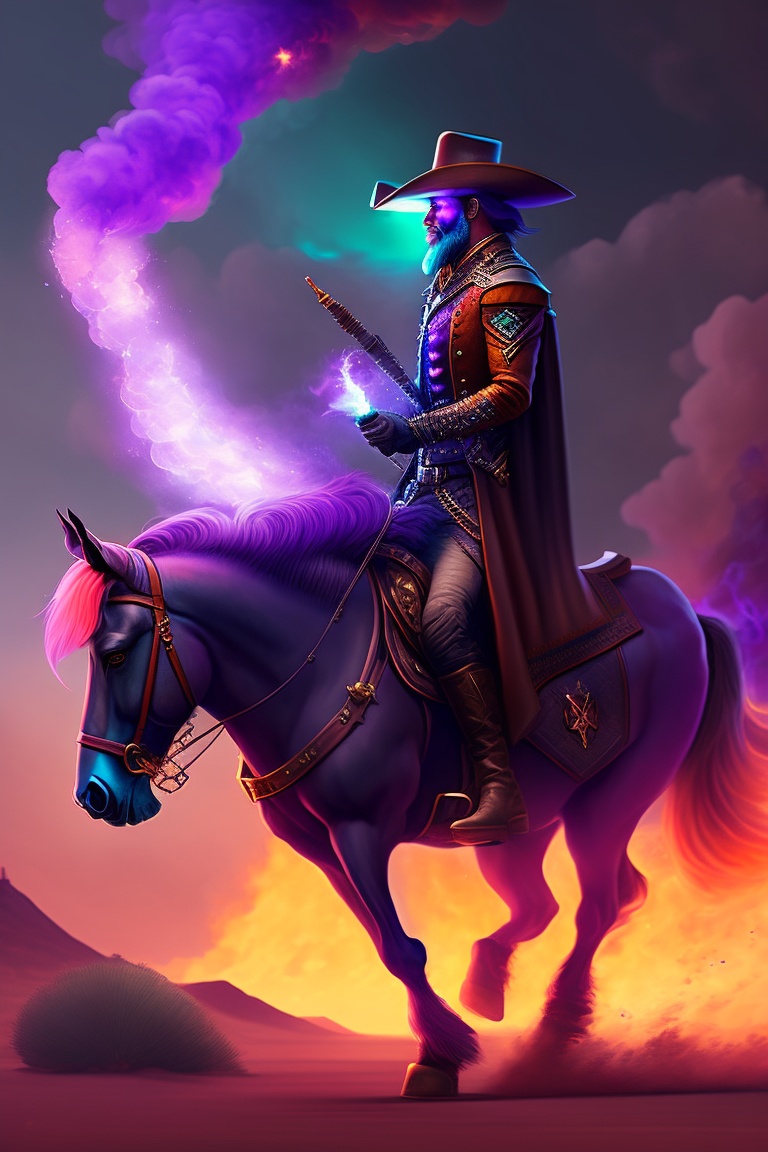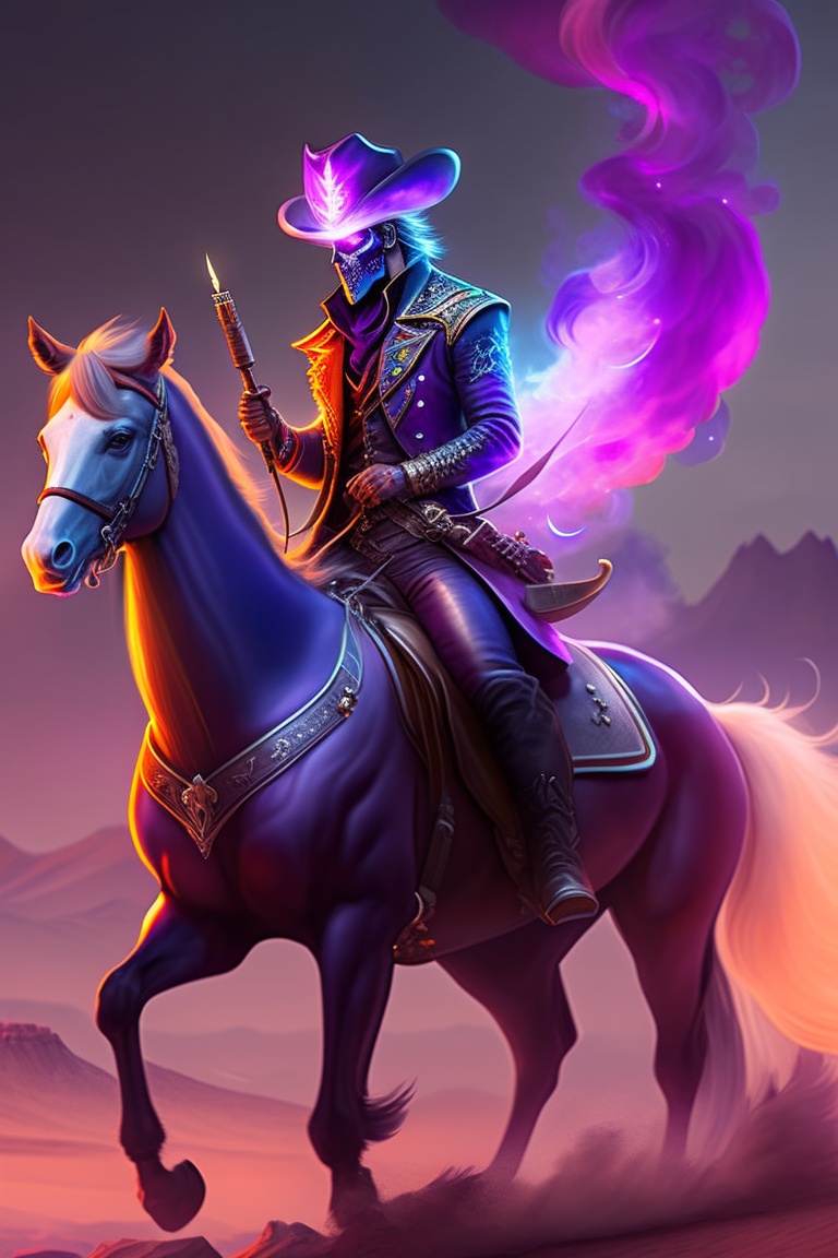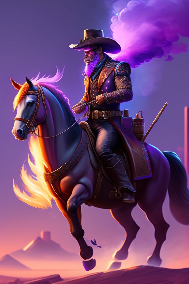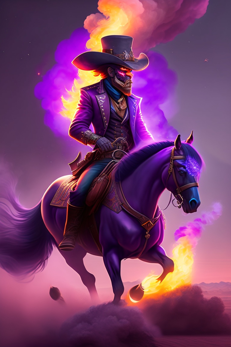 A cowboy ghost rider with purple flames smoking a pipe, high quality, trending on artstation, 4k, desert, night sky