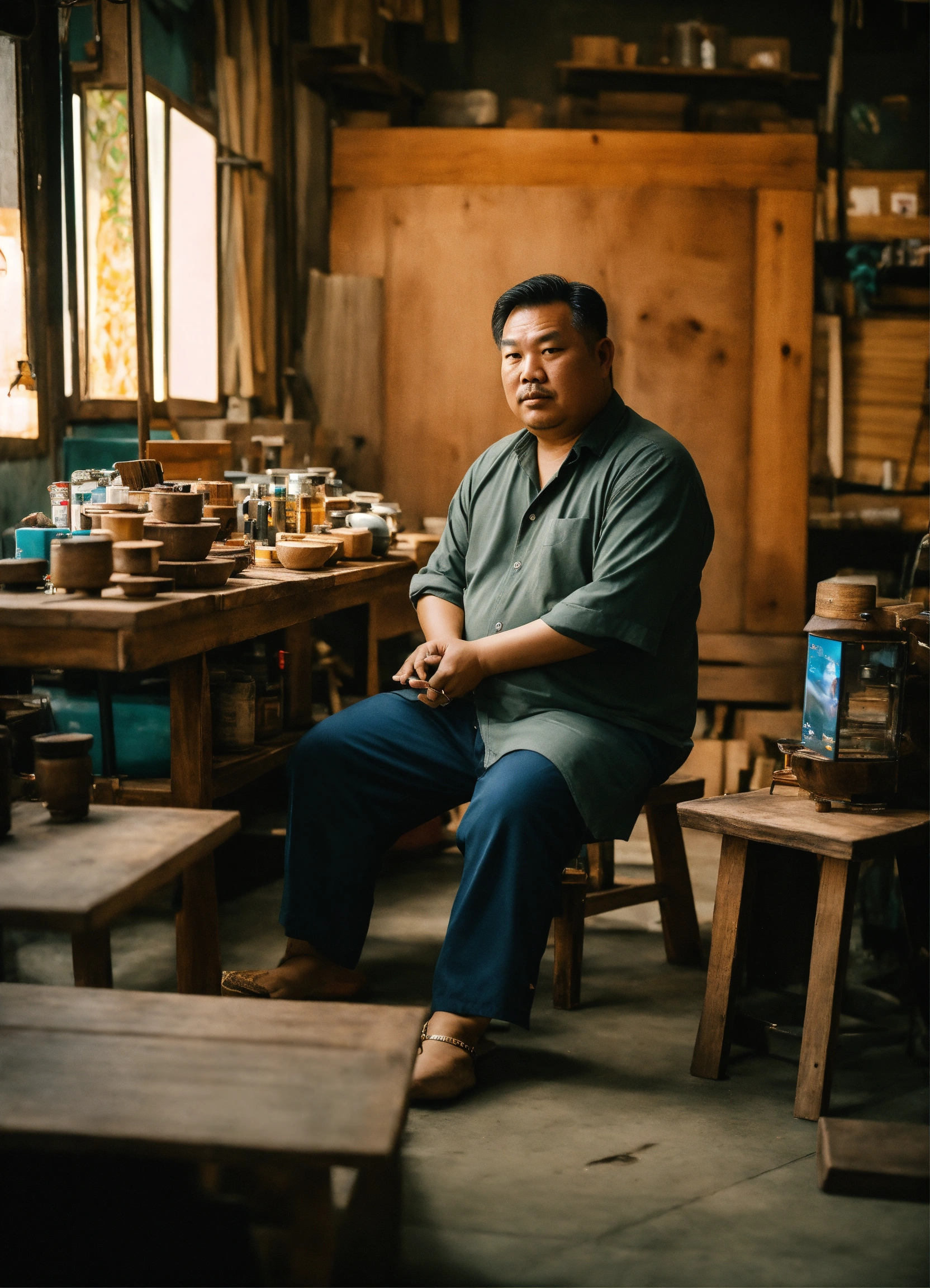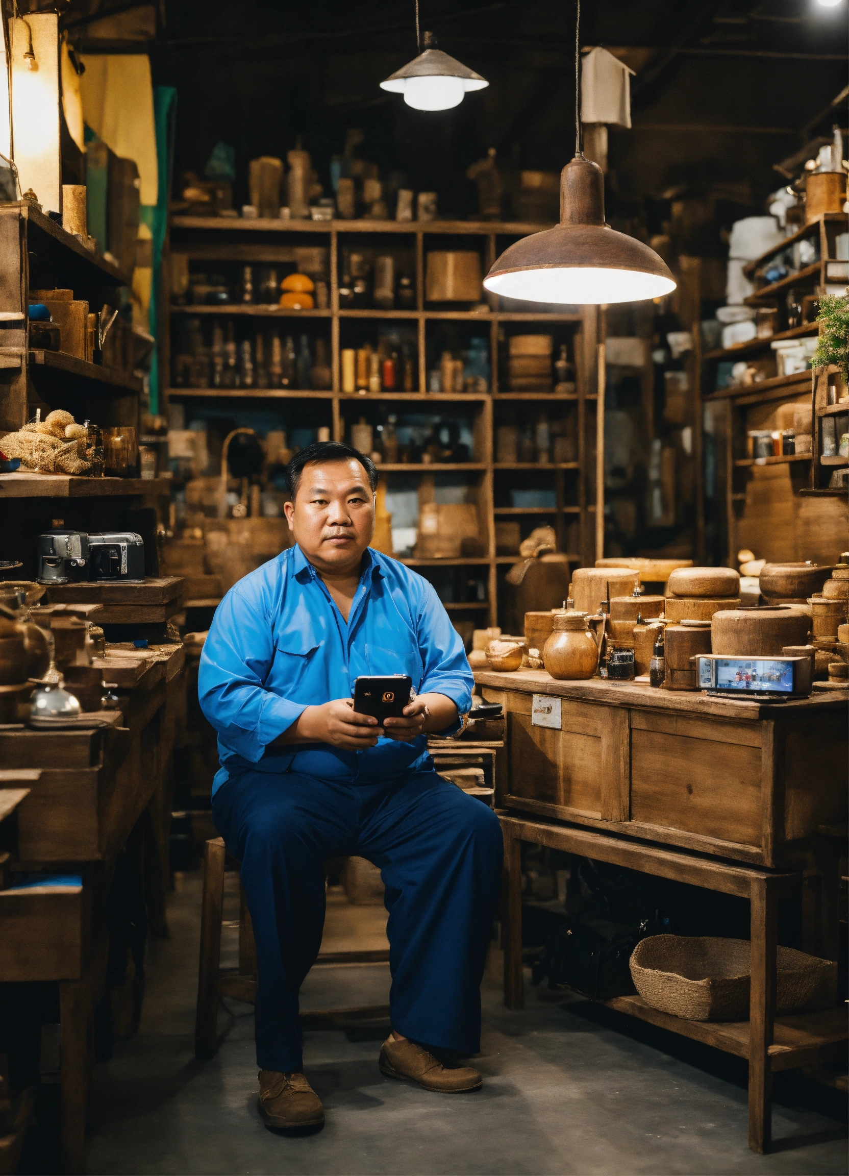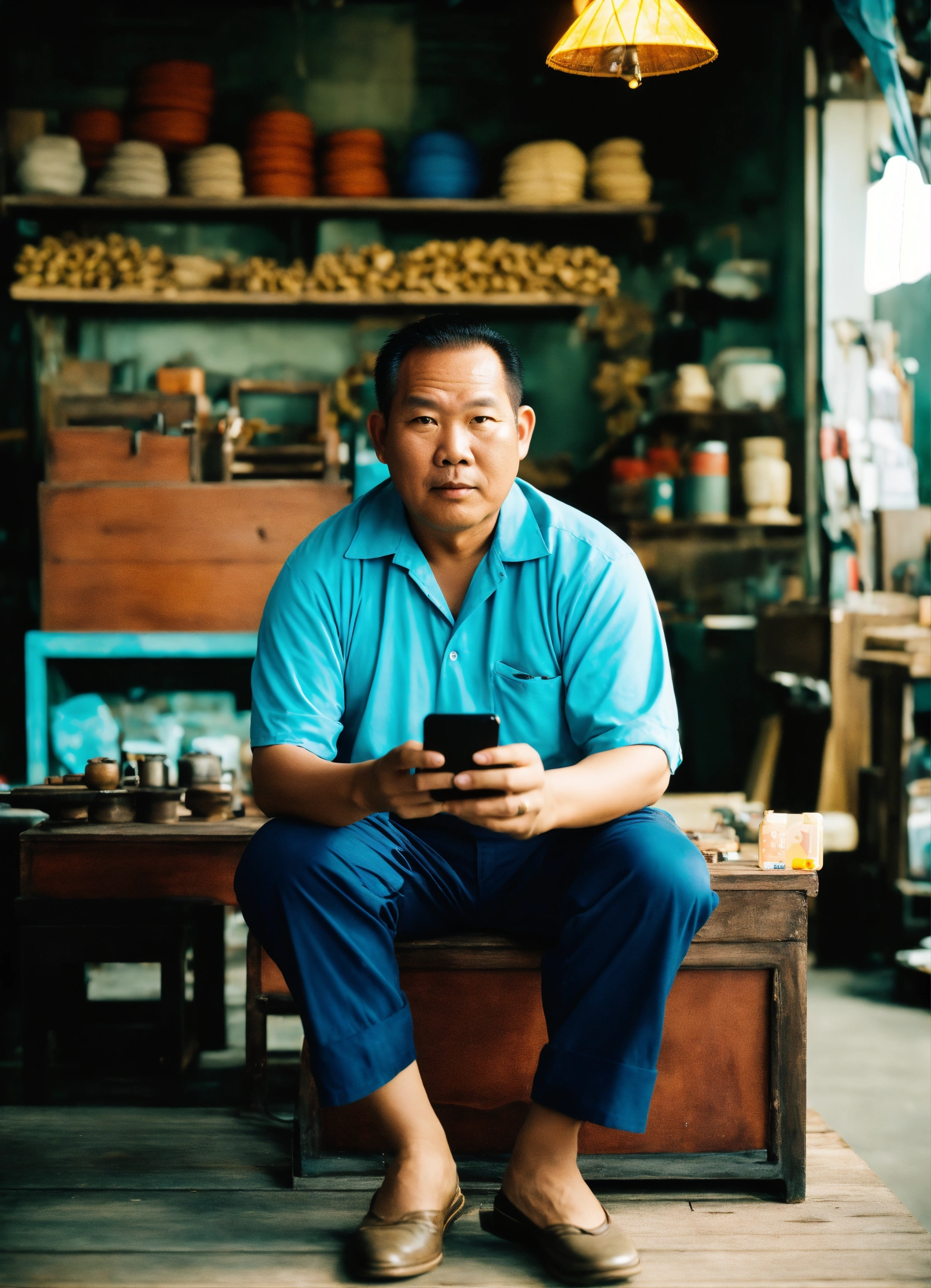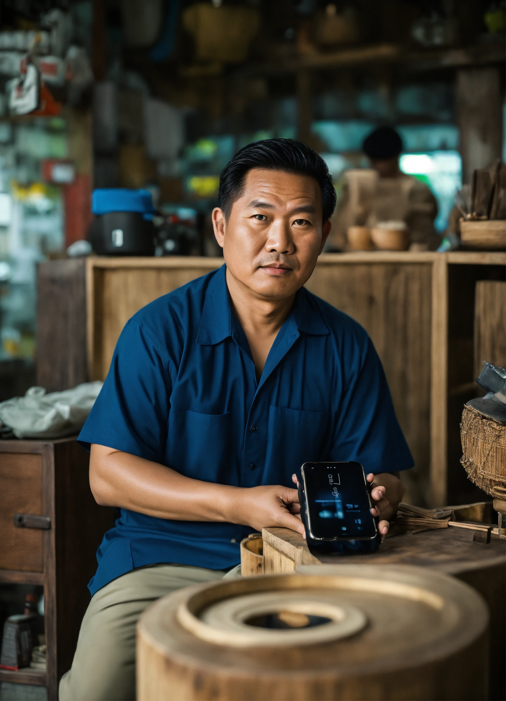 Huge vietnamese man, square face, sly eyes selling wooden furniture, holding an iphone 13 promax in his hand. he is sitting in his shop, the shop very nice interior design of suite shop in industrial style, enormous dignity for men, massive, harmony, chill&clam, atmostpheric, volume light, photo from nikon fm2, 35 mm lens, sharp focus, 16k resolution.