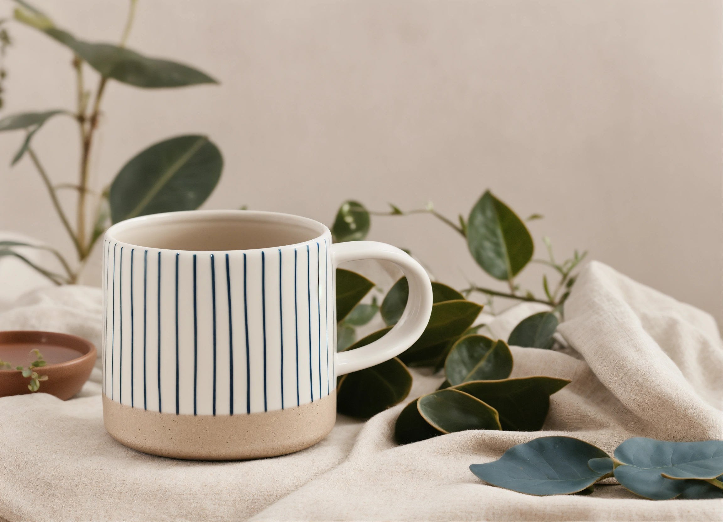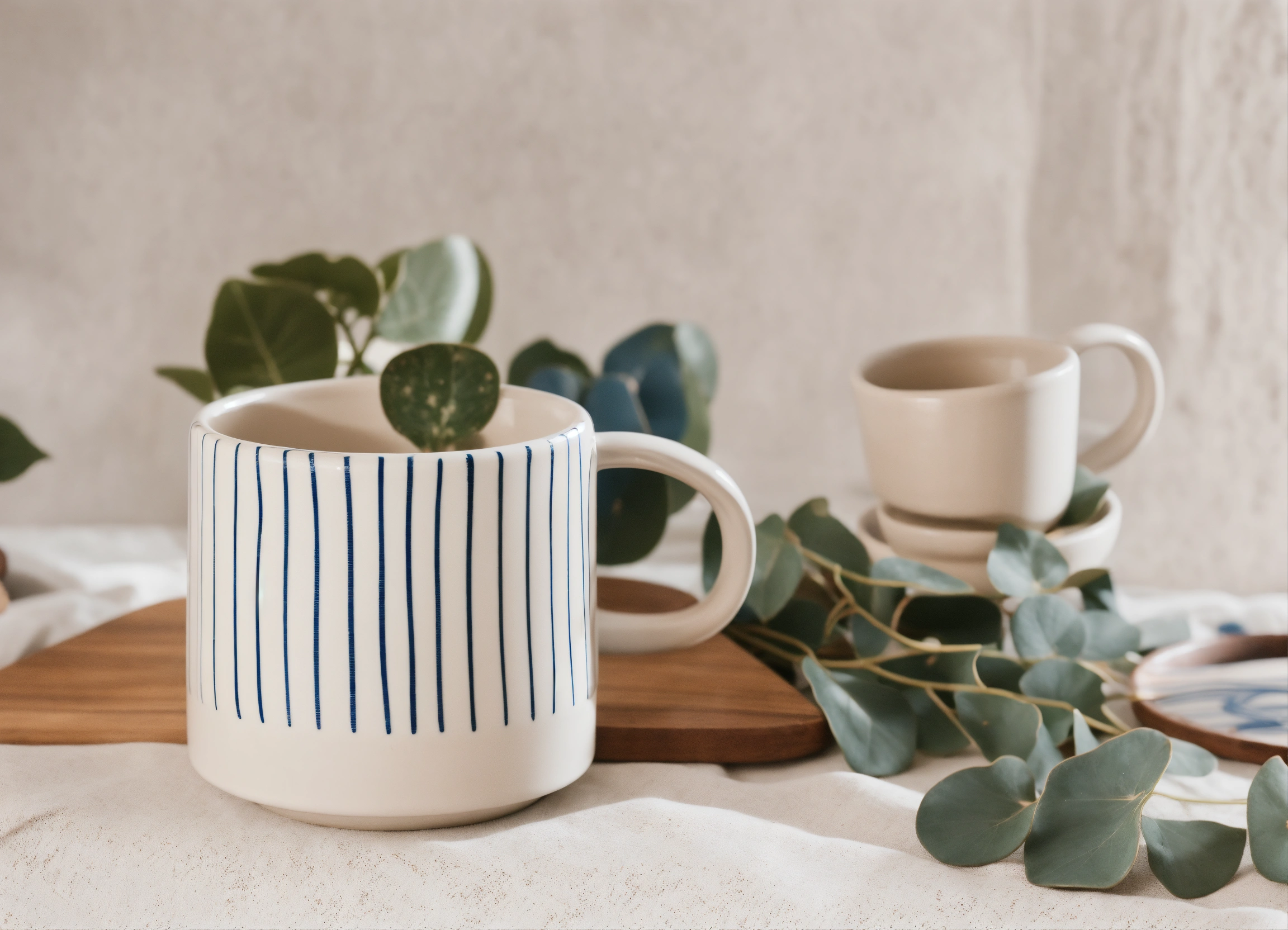 Stoneware straight edge cylindrical short ceramic mug with half circle handle, white matte surface with hand drawn blue lines. ad style modern minimalistic photoshoot with soft warm tone linen fabrics and plants.