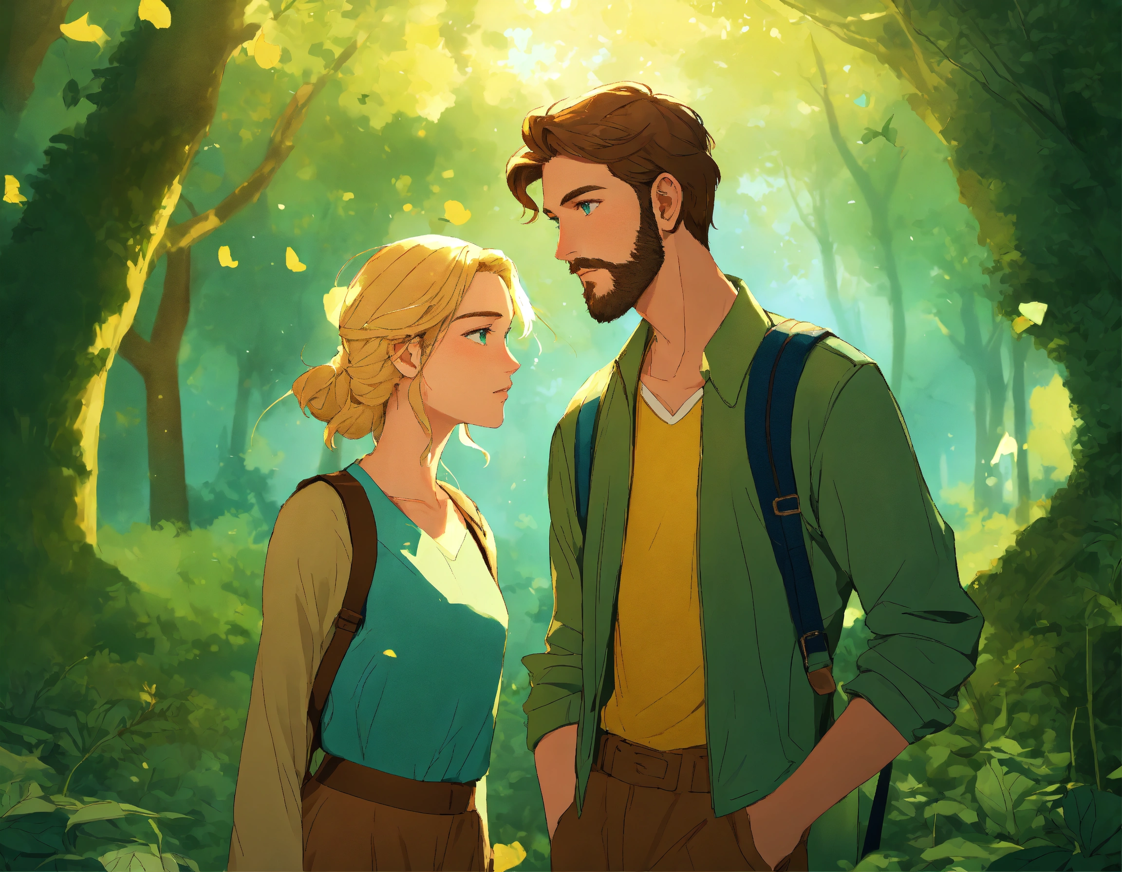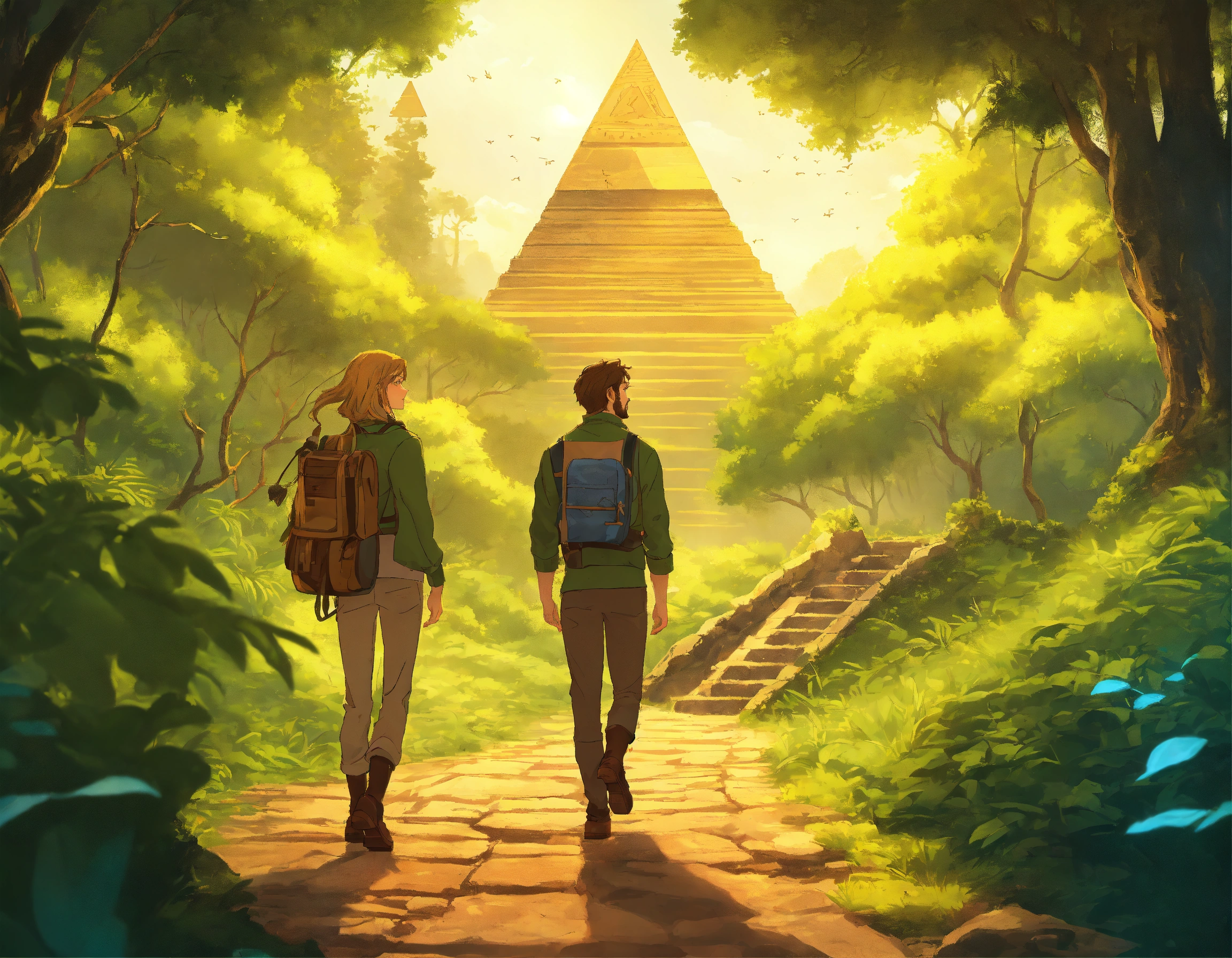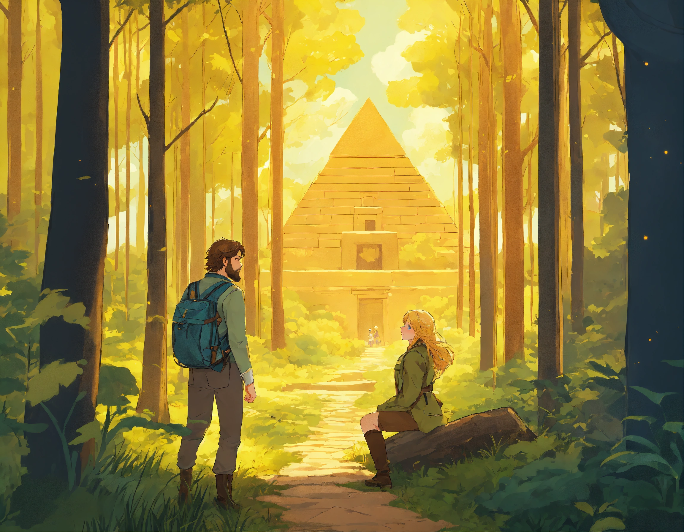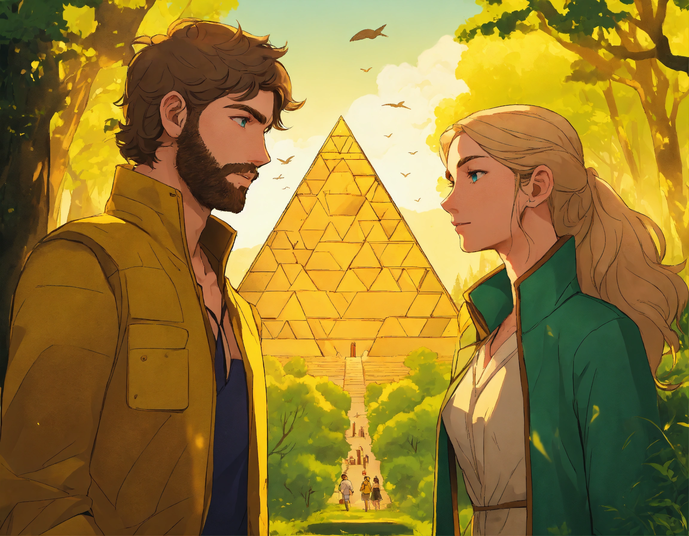 An illustration style where young man with brown hair, light thin brown beard and green eyes, yellow jacket and woman with blonde hair, blue eyes and v shape face, no beard embarks on their journey young man and woman reached to the heart in the forest and pyramid but a network of traps set by an ancient civilization to protect their secrets to test their bond and wits . show the whole background view forest and trap set by an ancient civilization