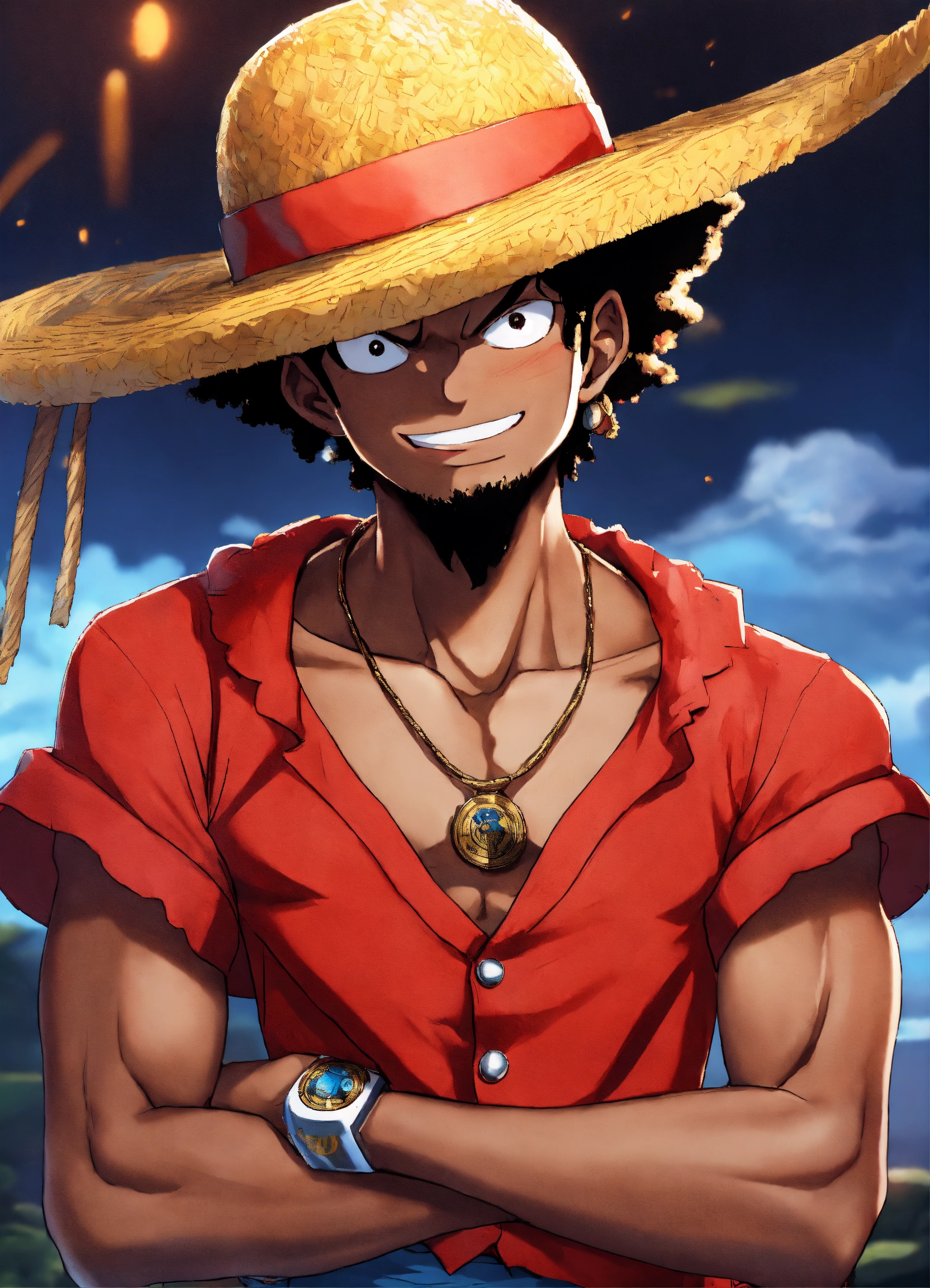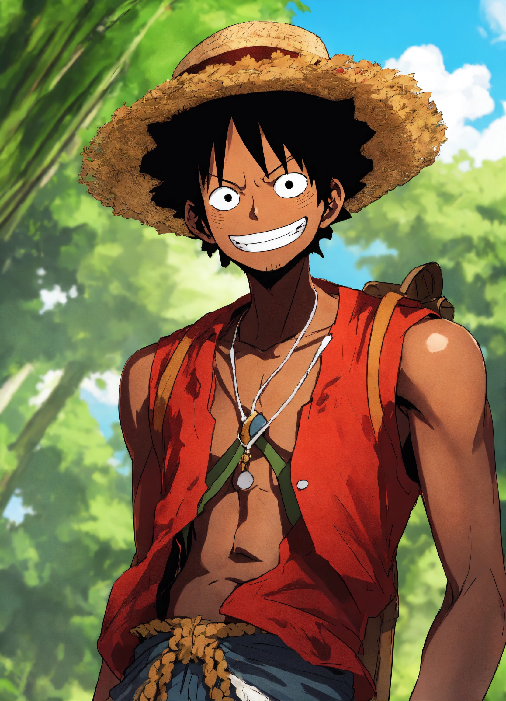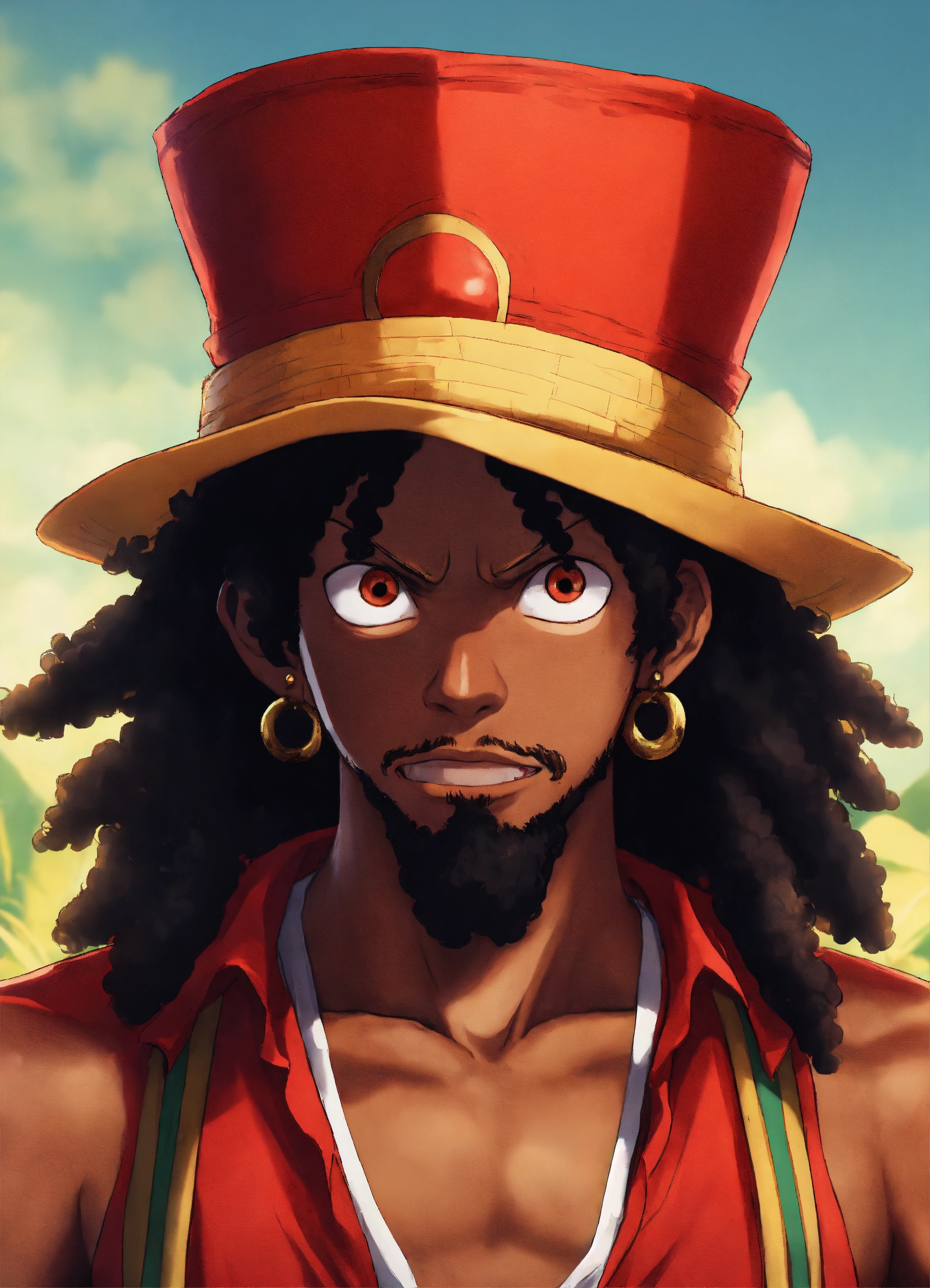 Luffy from one one piece as a afro black american with his red vest an his straw hat, an elongated face, in adventure mode.