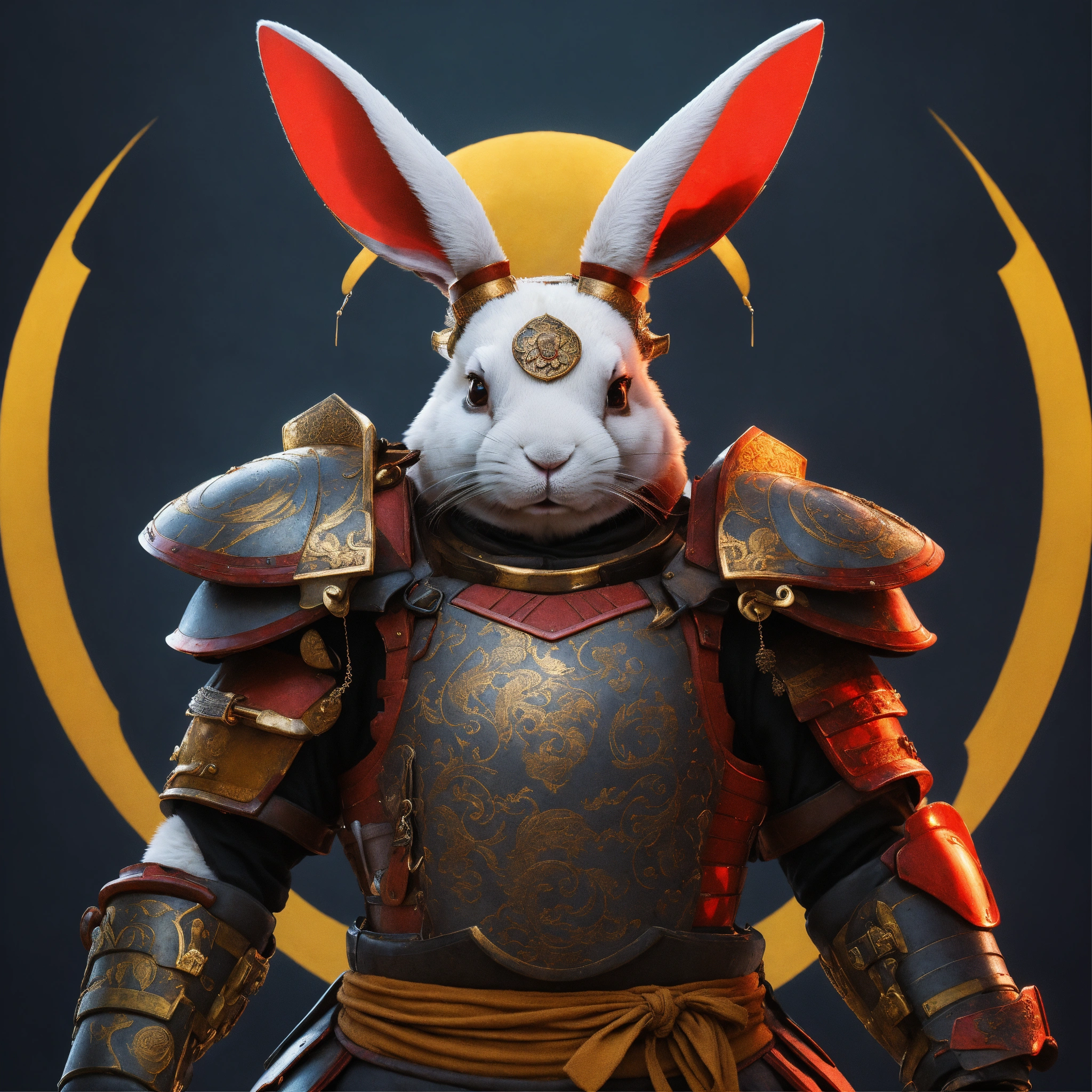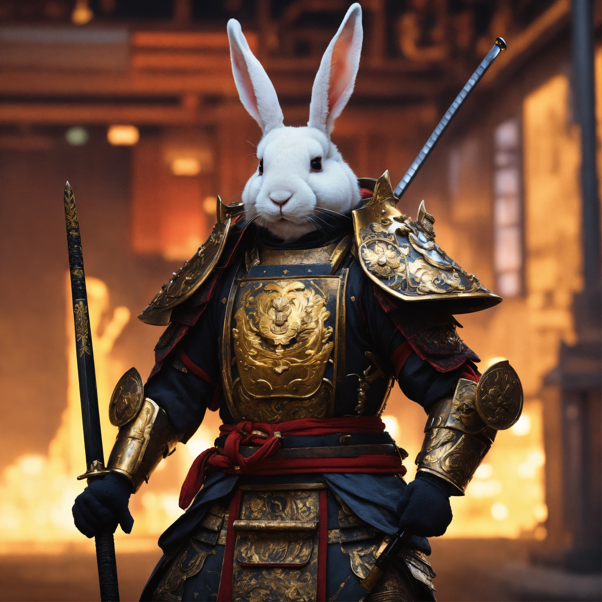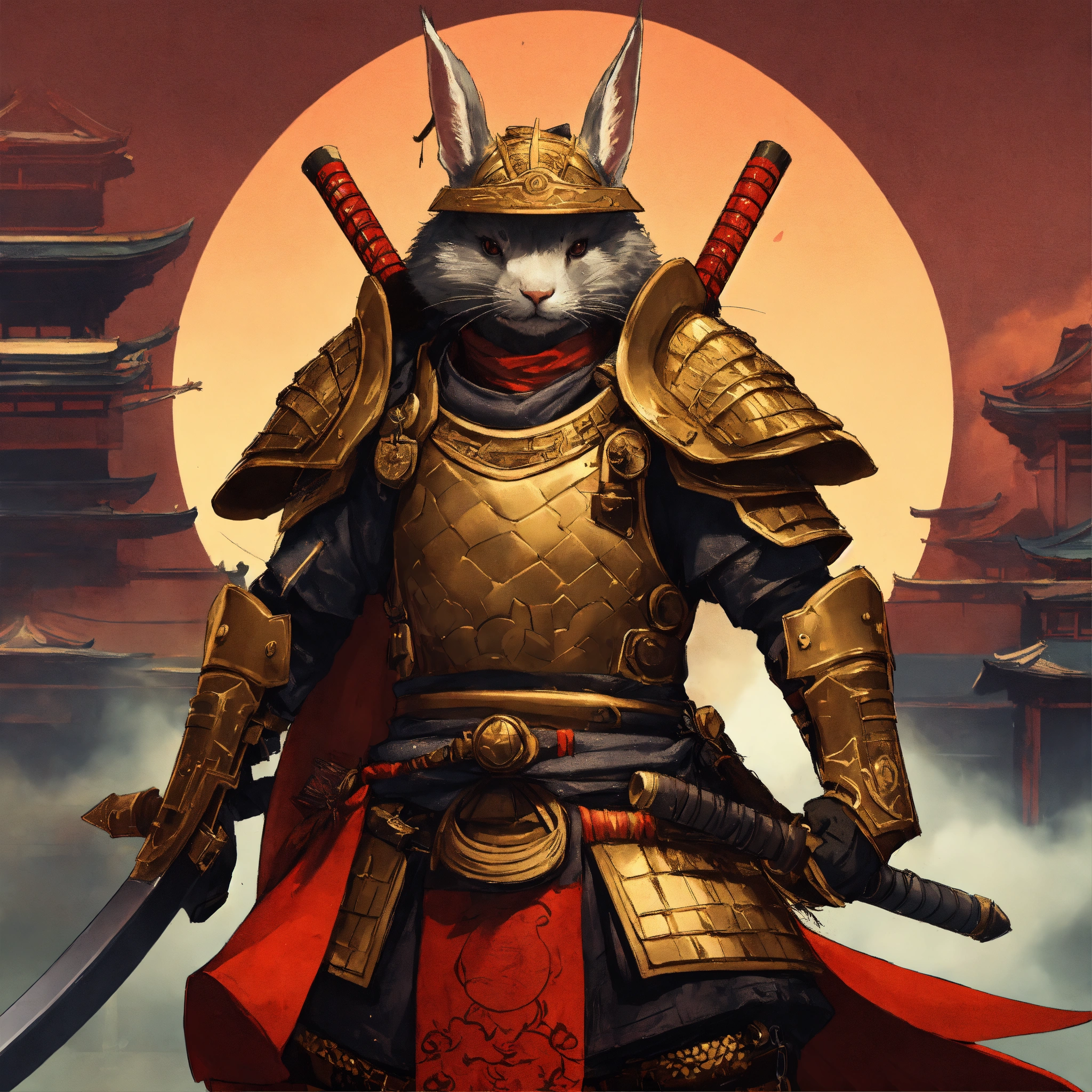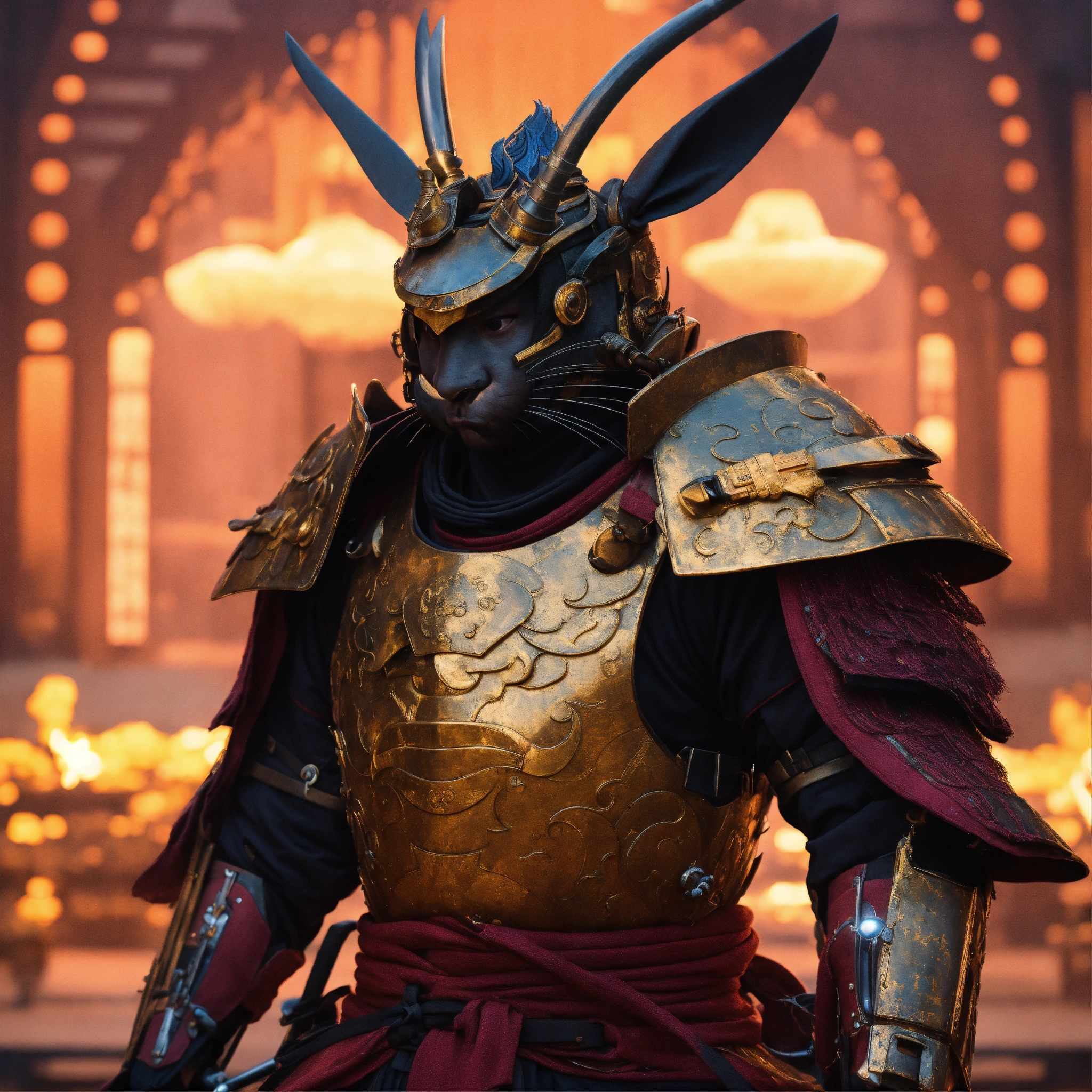 Imagine a samurai rabbit, a unique character who embodies both elegance and determination. create a samurai with a distinctive appearance, wearing traditional armor inspired by feudal japan but with modern or futuristic elements that reflect cyberpunk aesthetics. give this samurai rabbit a strong personality, imbued with wisdom and nobility. they can be a guardian of the ancient samurai tradition, or a defender of justice in a futuristic world dominated by technology. ensure that the details of their appearance, from their armor to their sword, are impeccable. the environment in which they exist can be a blend of traditional japanese landscapes and cyberpunk settings. the goal is to create a captivating character that seamlessly fuses the timeless grace of a samurai with modern or futuristic elements while capturing the essence of a noble and devoted warrior.