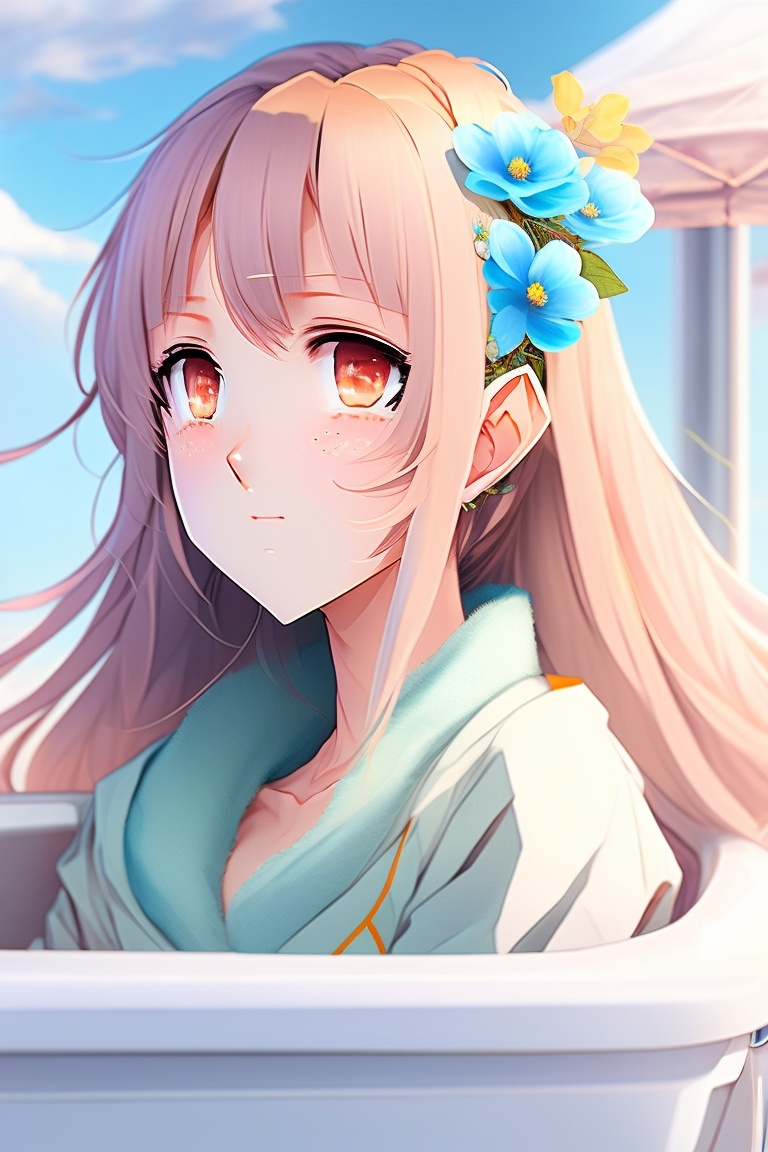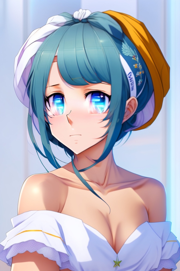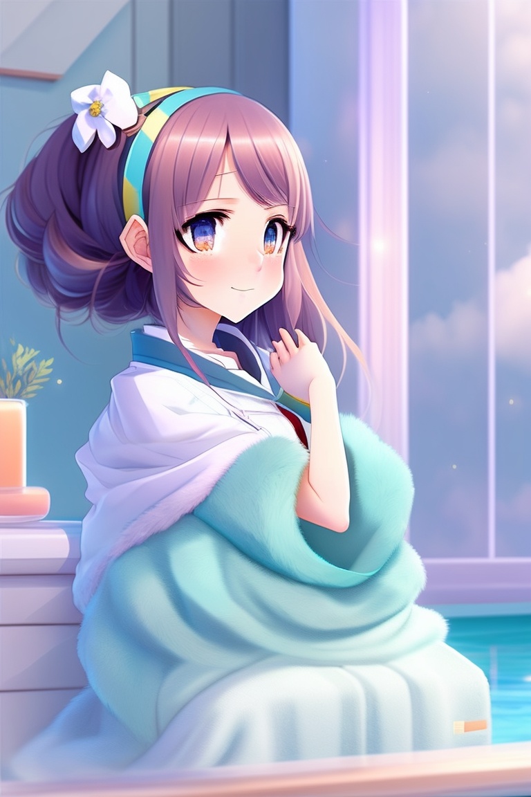 An anime girl wearing a bath towel and having her hair wrapped in a towel while doing a spa treatment, very pretty, upper body shot