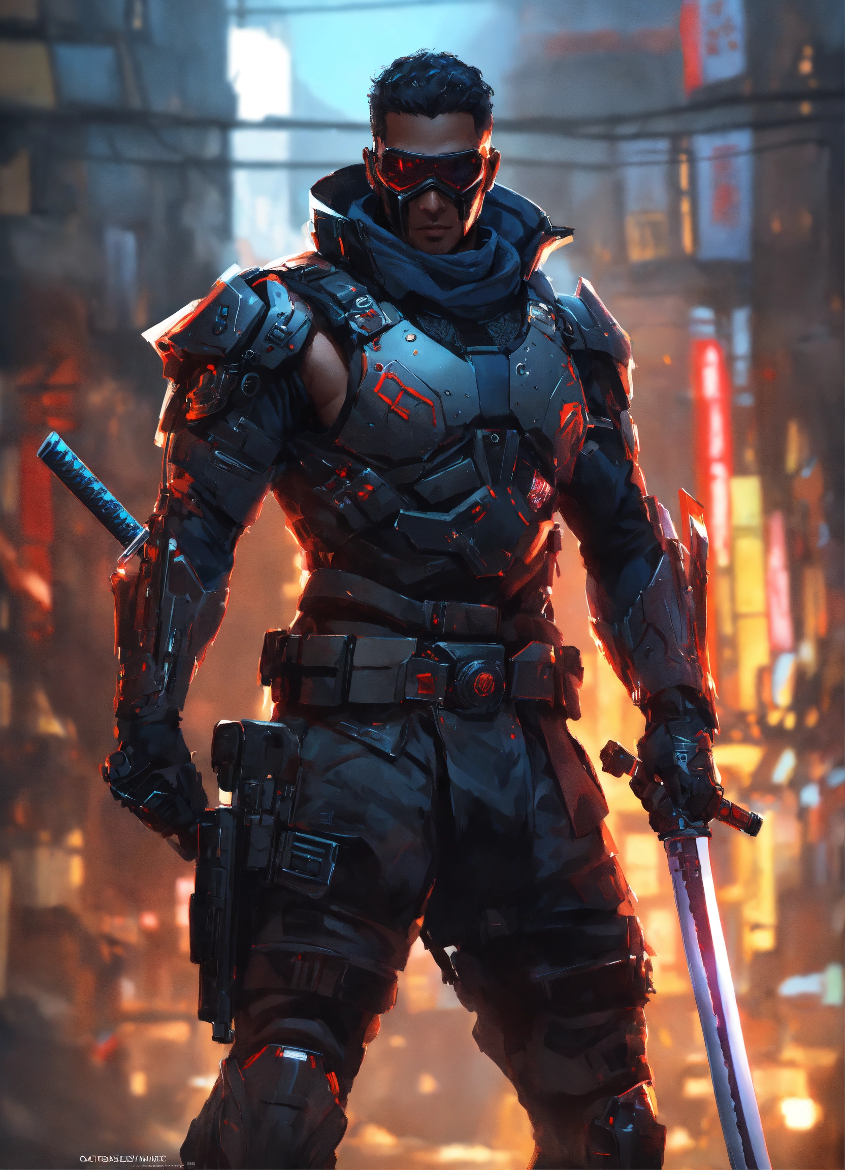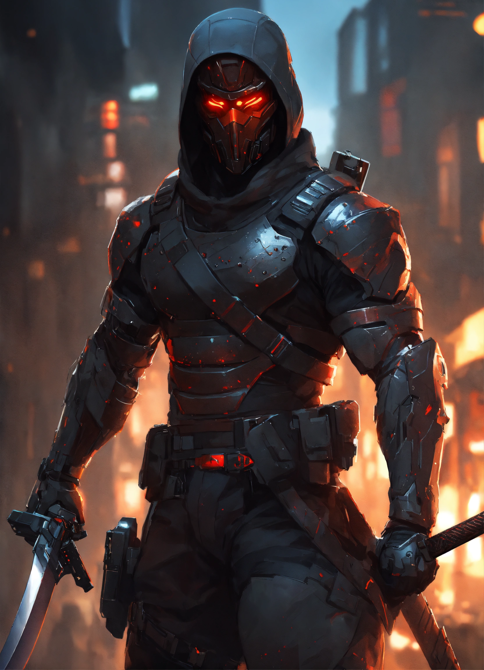 Male cyborg assassin, using katana, military spec ops tight-fitting clothing, oni face mask cyborg, dark black color, full body shot, sci-fi, intricate, elegant, highly detailed, digital painting, artstation, concept art, matte, sharp focus, illustration, art by artgerm and greg rutkowski