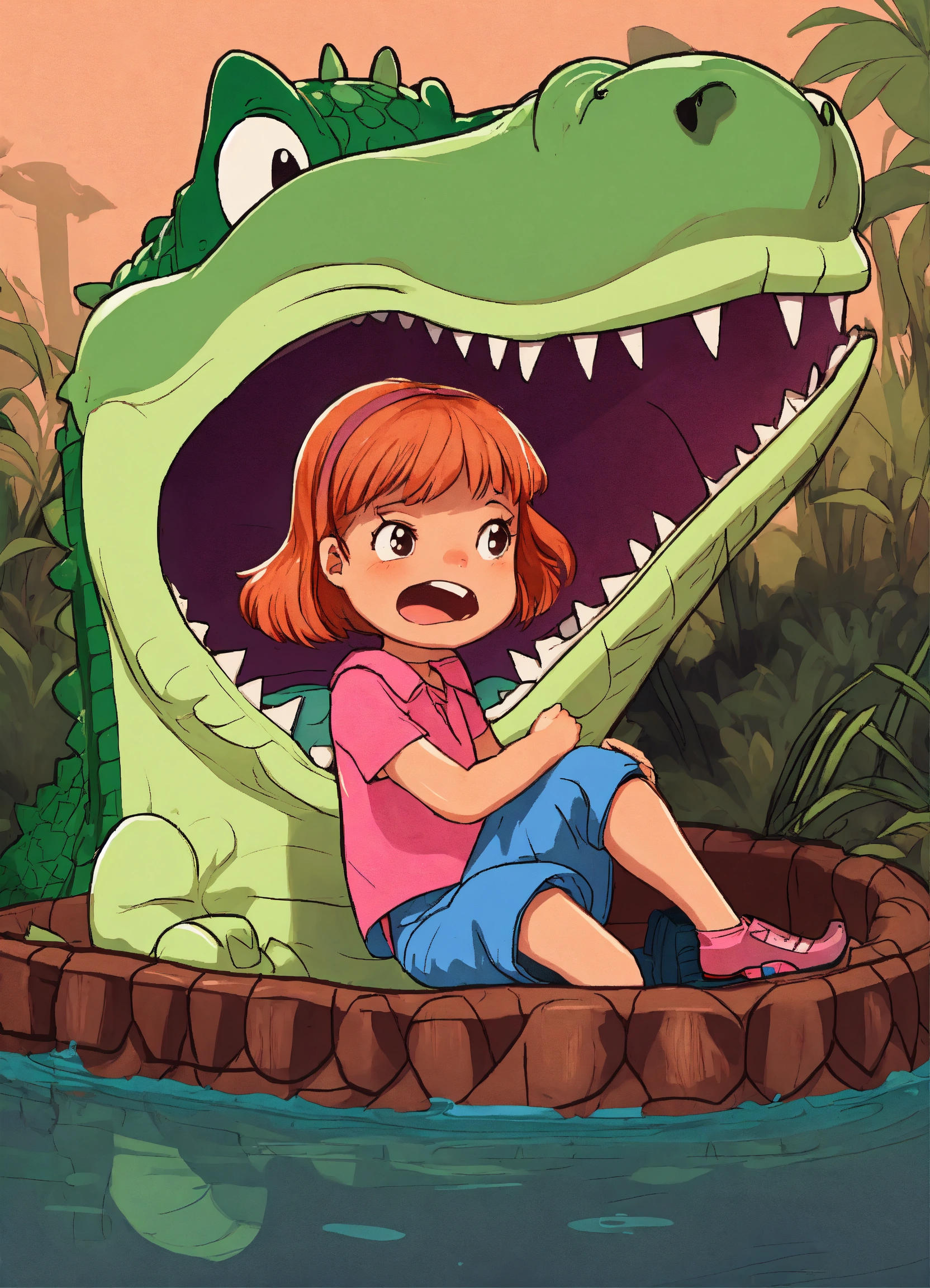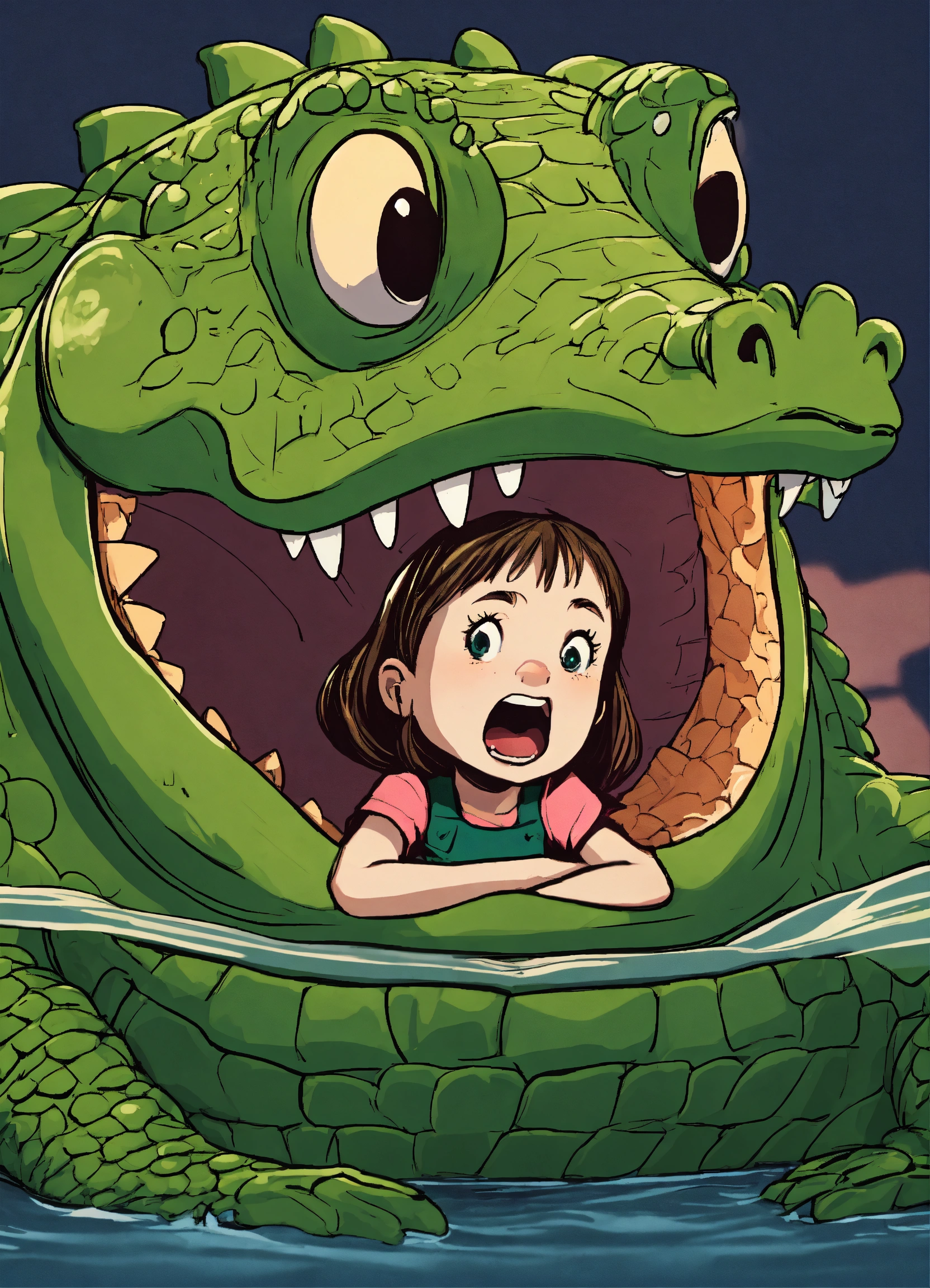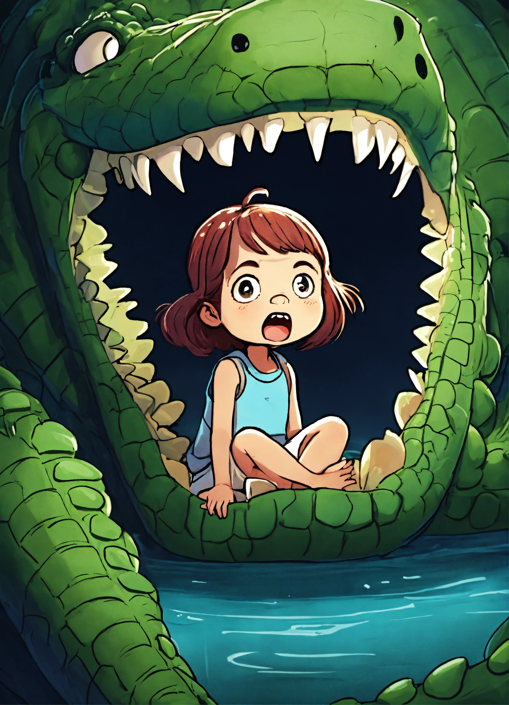 Terrified little girl sitting deep entirely inside crocodile's throat