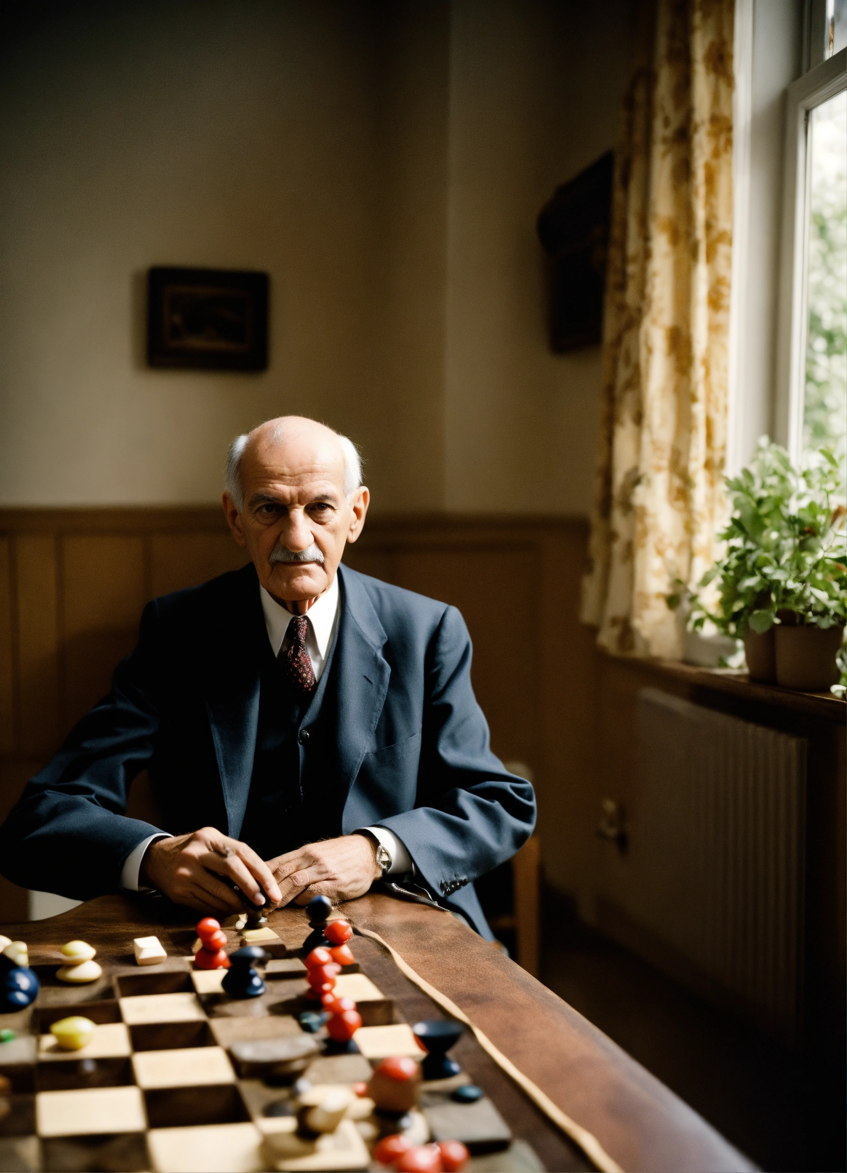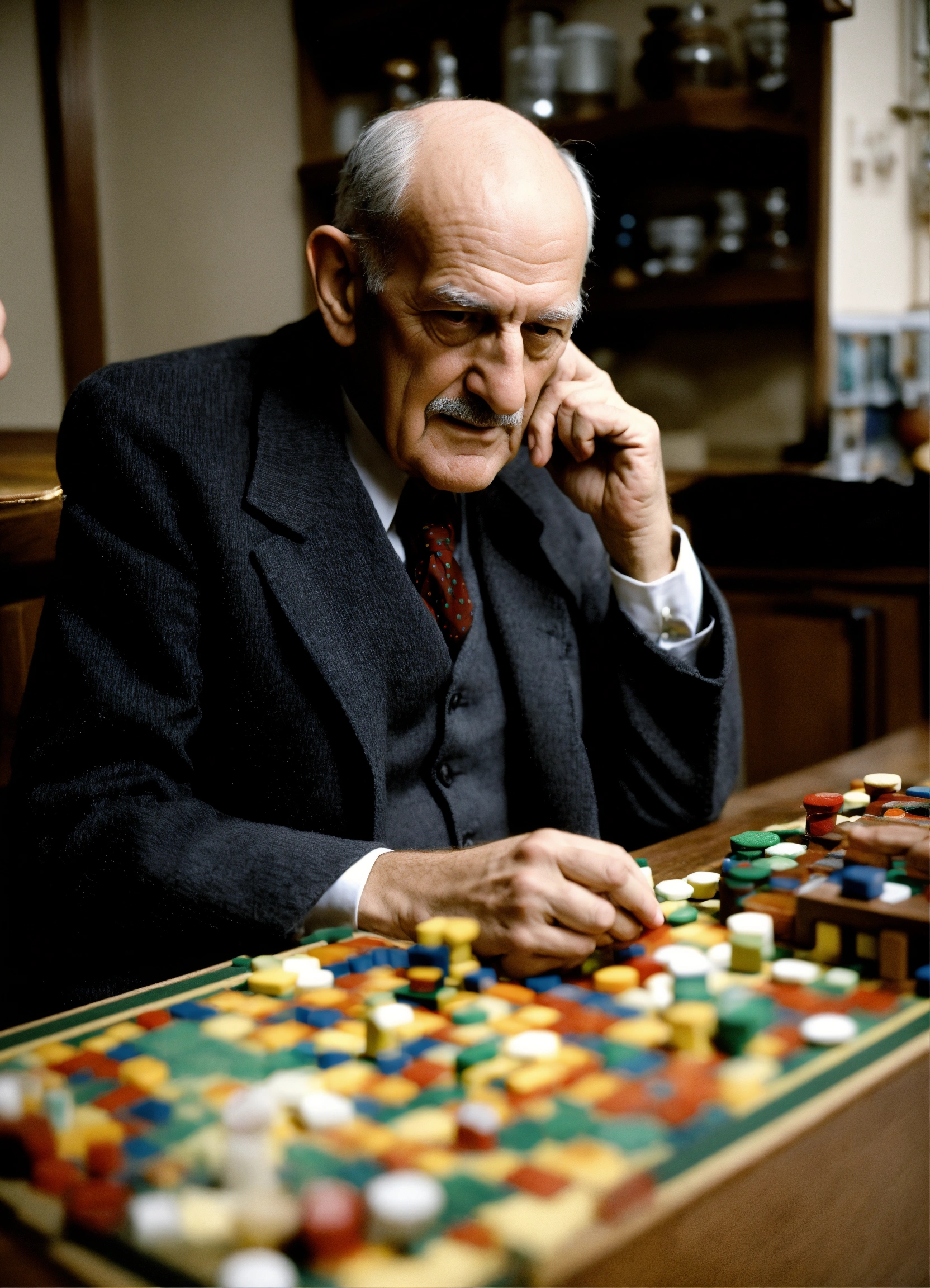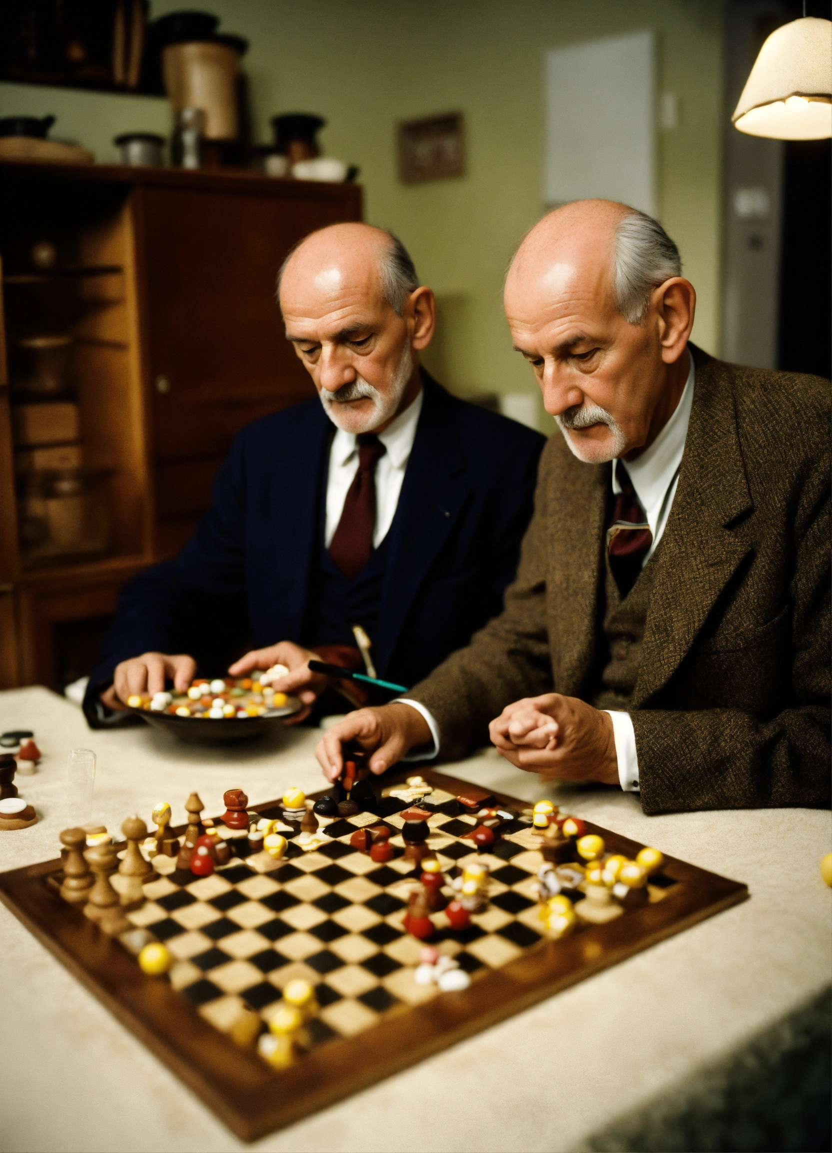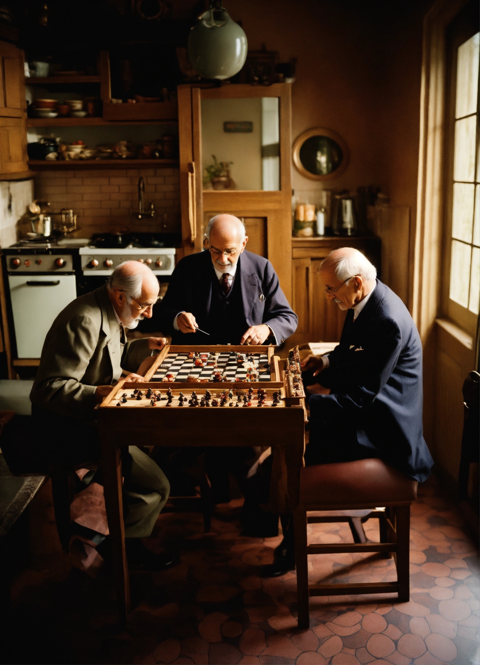 Una fotografía, como un daguerrotipo, de winnicott jugando al juego del go con sigmund freud en la cocina de freud