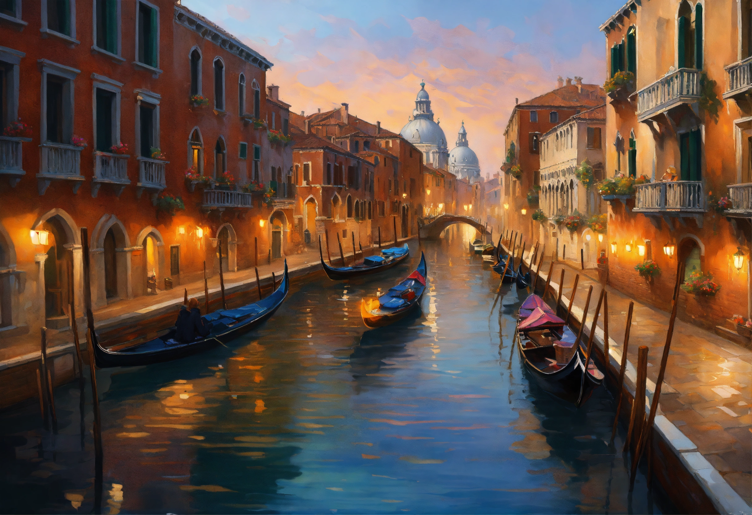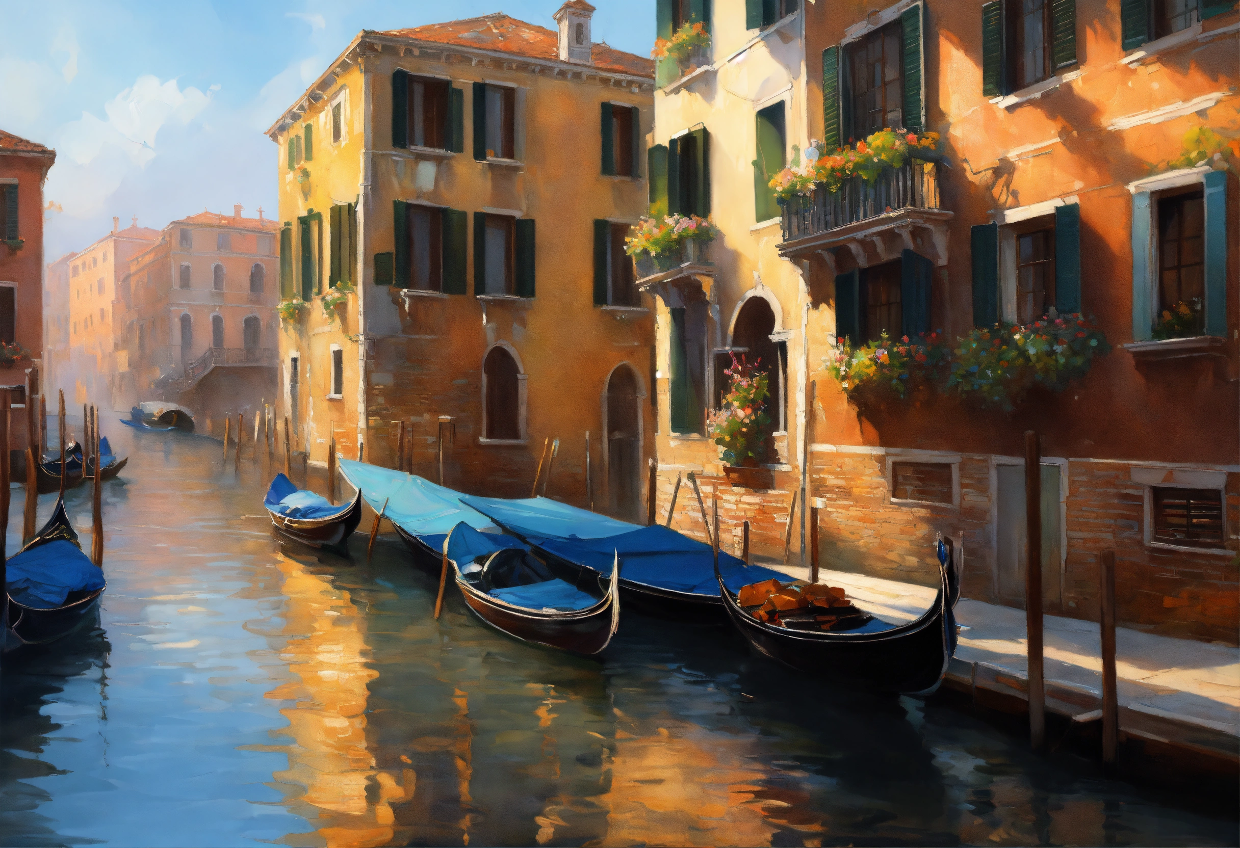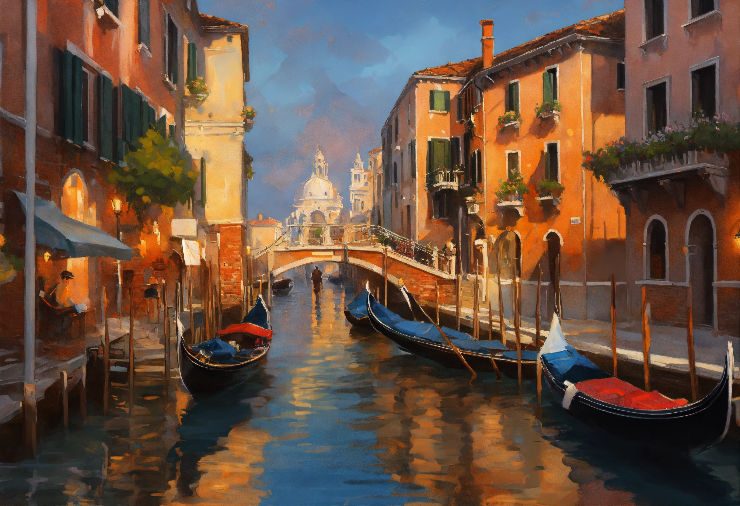 A realism illustration of urban city scene, venice, painting by evgeny lushpin and daniel f gerhartz and claude monet and leonid afremov, and sensory details