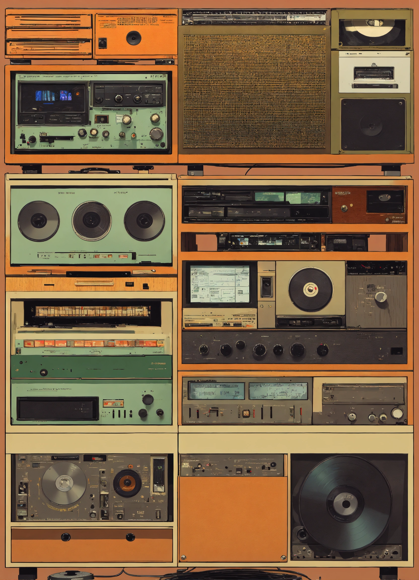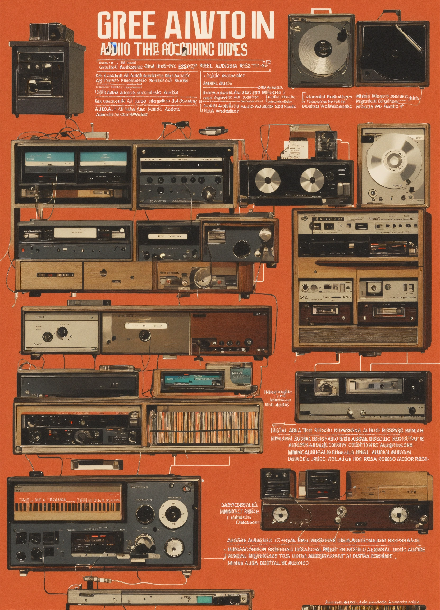 I want the audio recording devices in one combined picture 1, phonograph 2, magnetic tape recorder 3, reel-to-reel tape recorder 4, compact cassette recorder 5, digital audio recorder 6, minidisc recorder 7, digital audio workstations