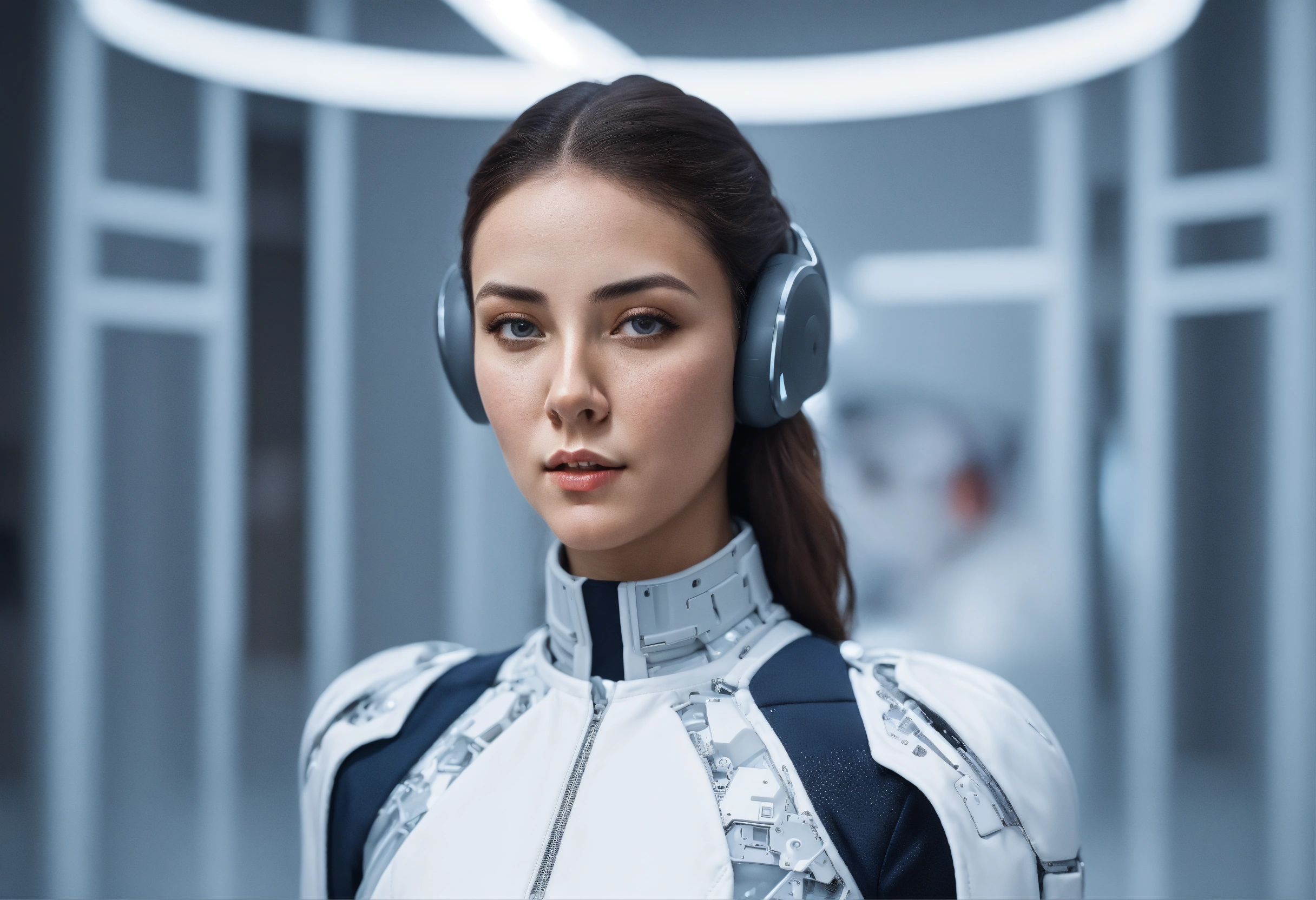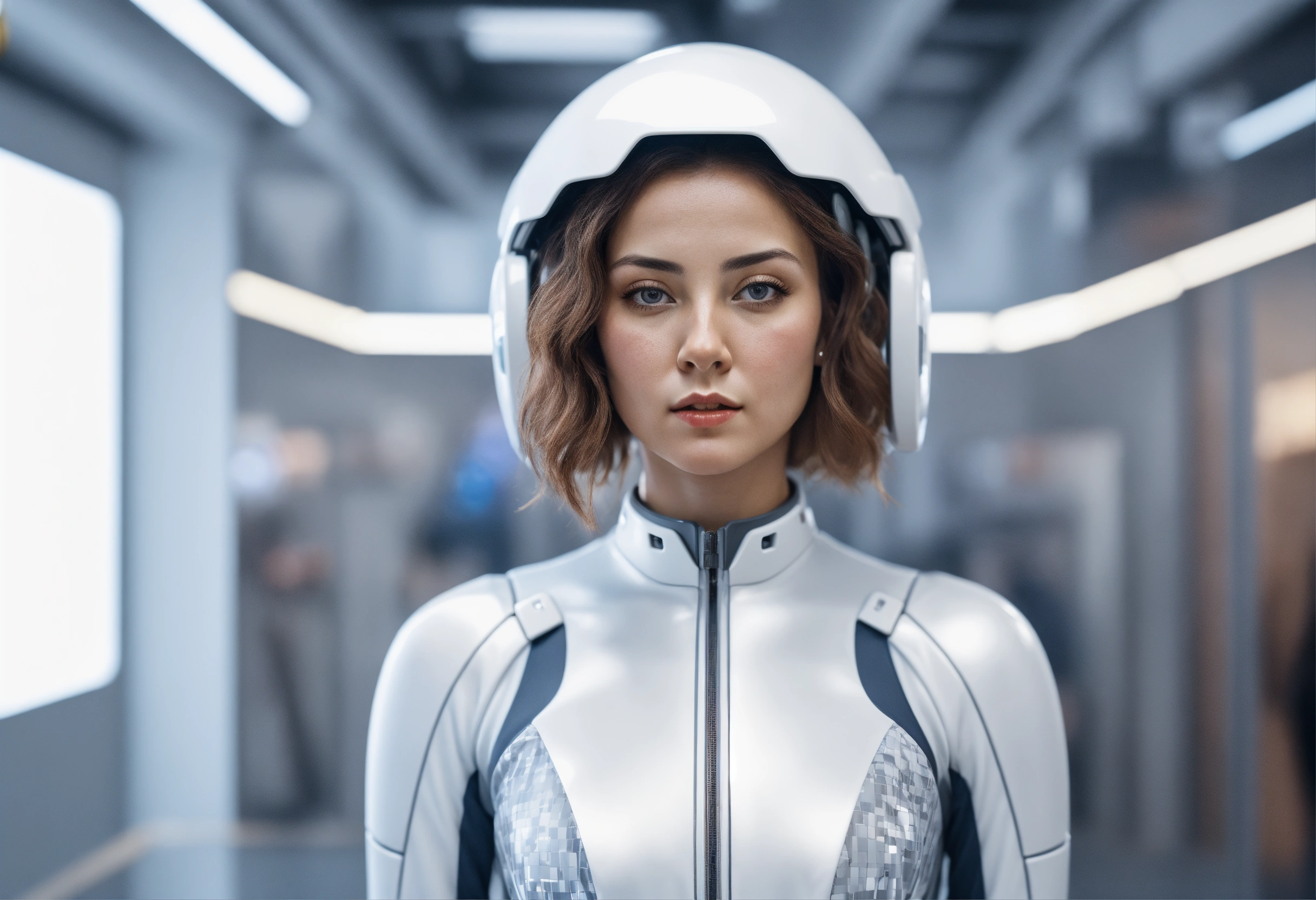 Centered portrait photo of digital marketer wearing a jump suit, ai concept, artificial intelligence, real human face, pudica pose by bouguereau, inside white room, ultra - realistic and detailed, 8 k