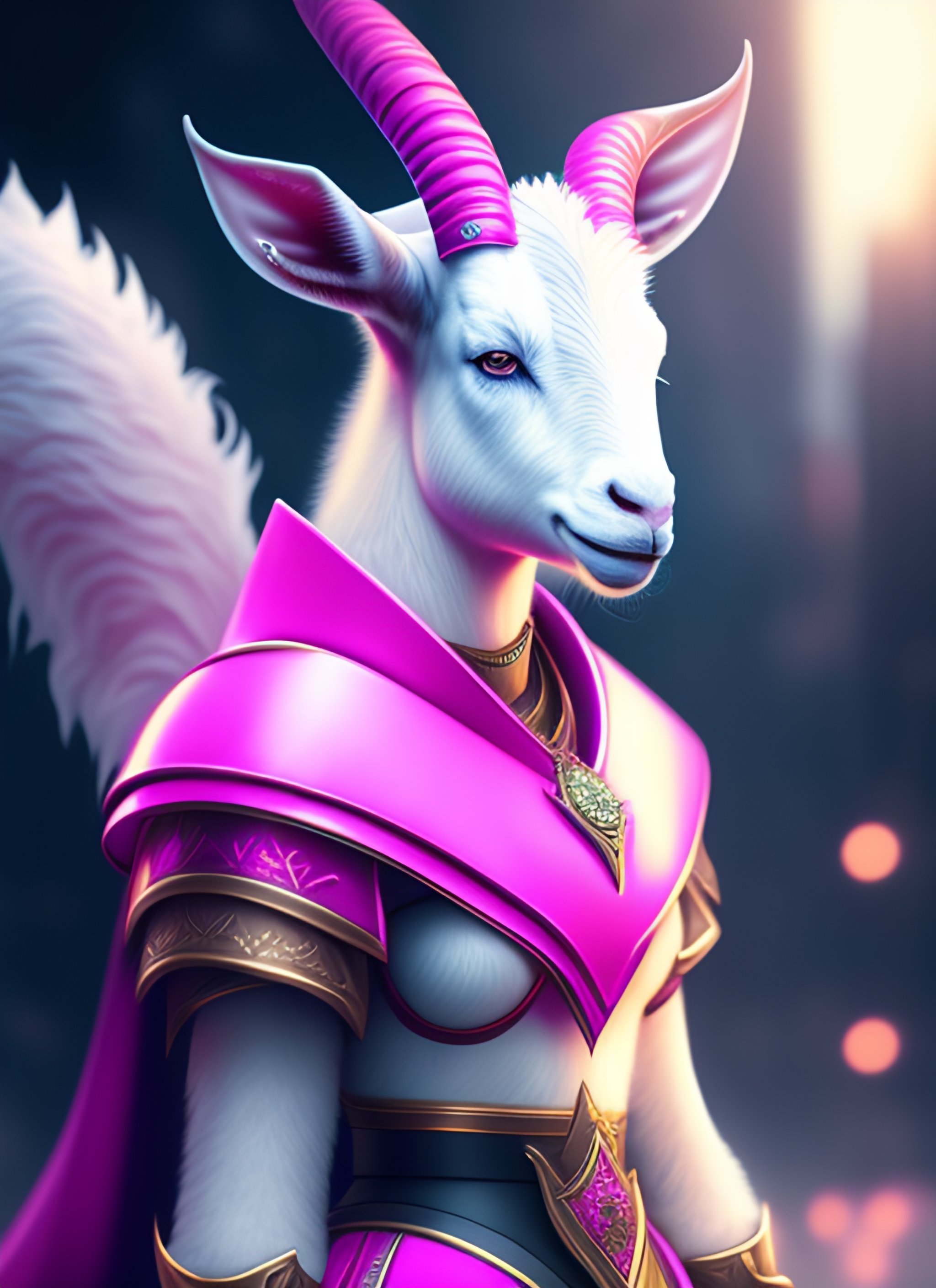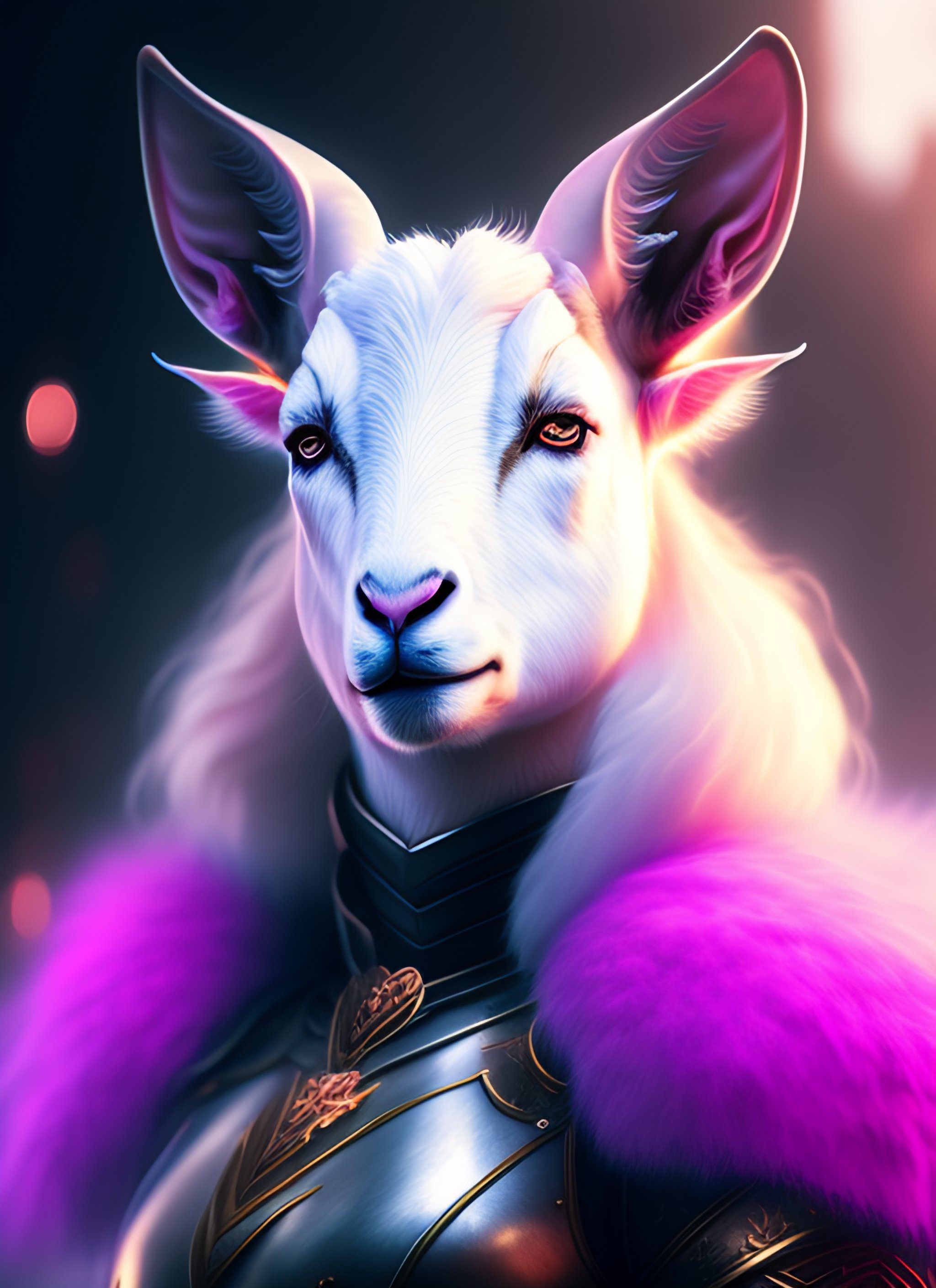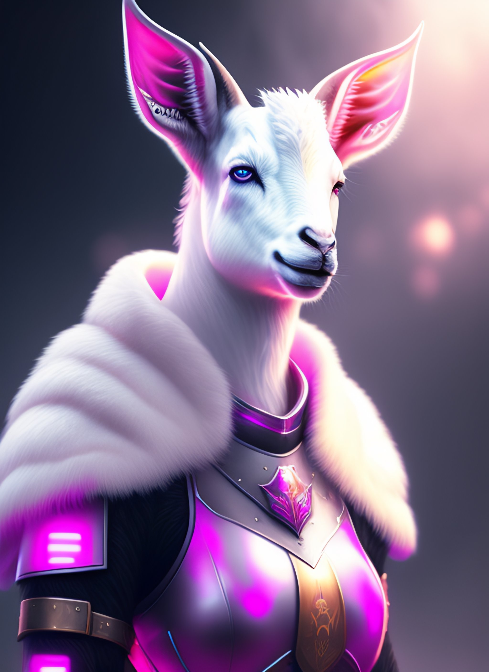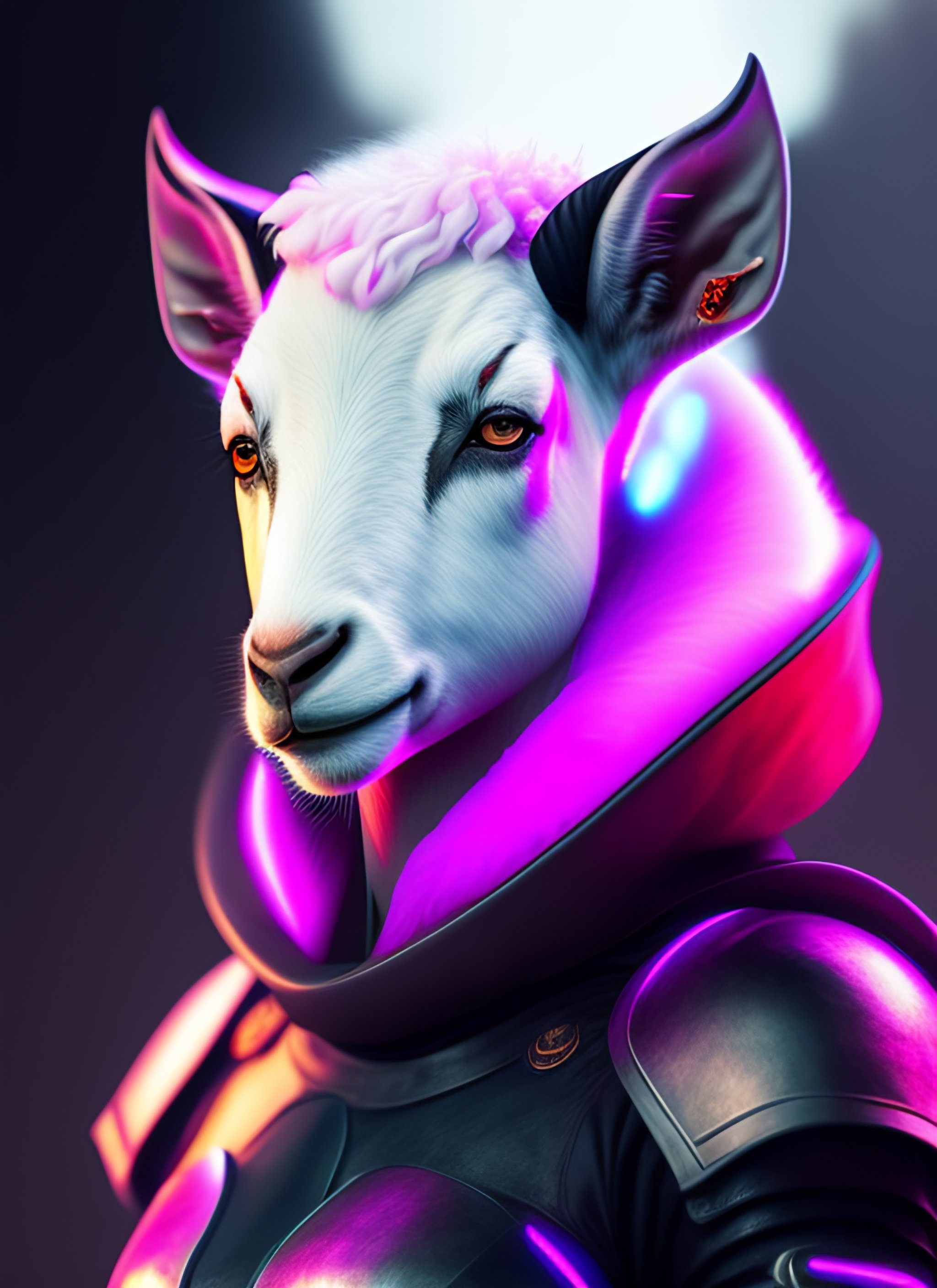 Digital painting concept art, white goat female fursona, cute face, wearing black and pink armour, surreal, volumetric fog, cyberpunk, high detail sharp, studio lighting, chromatic aberration