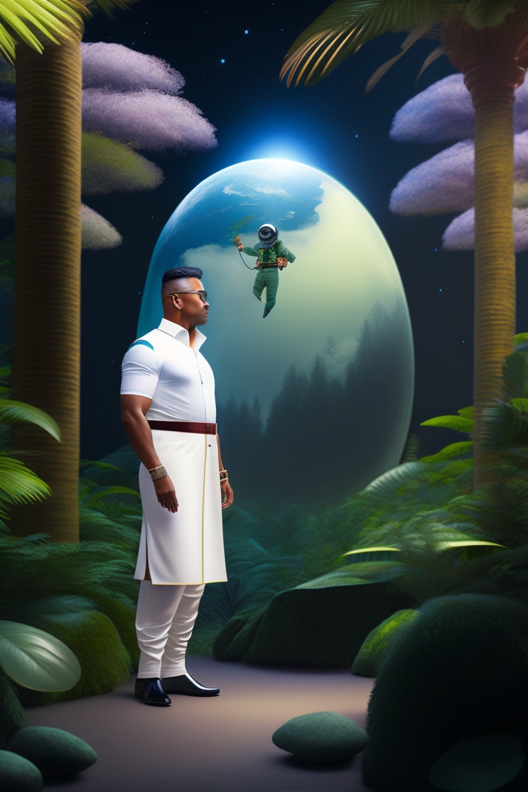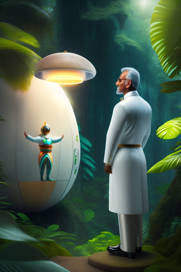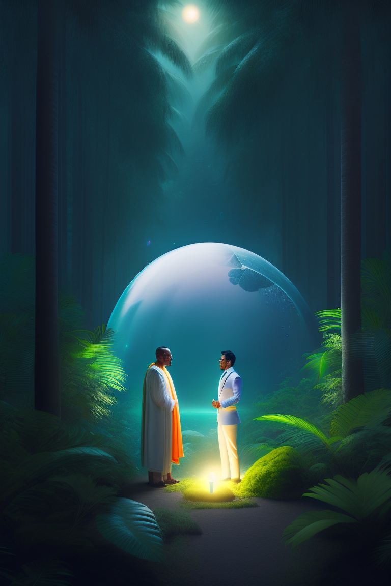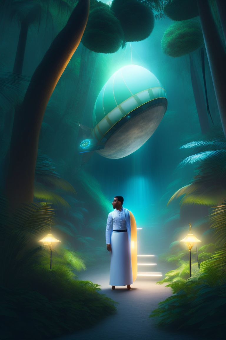 3d image of a bengali middle aged man, wearing white dhoti meeting with an alien in a tropical forest at night in front of an alien spaceship
