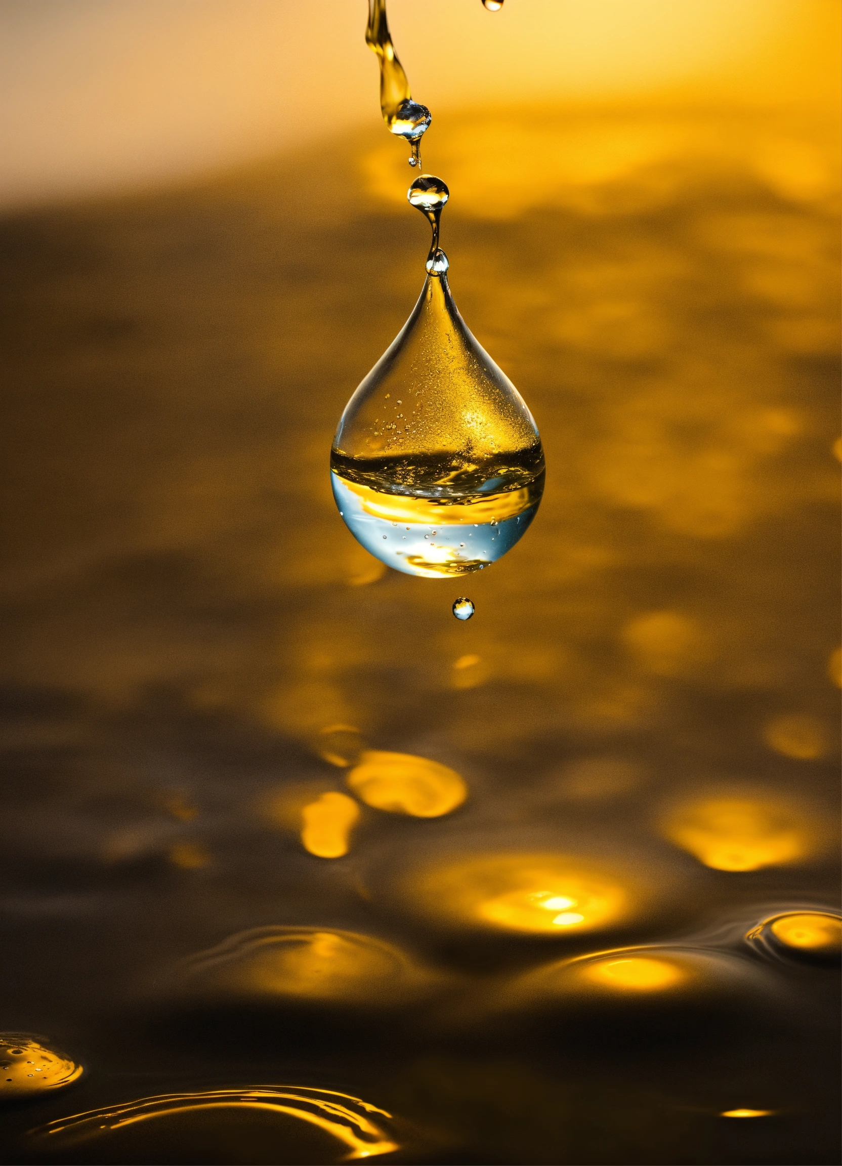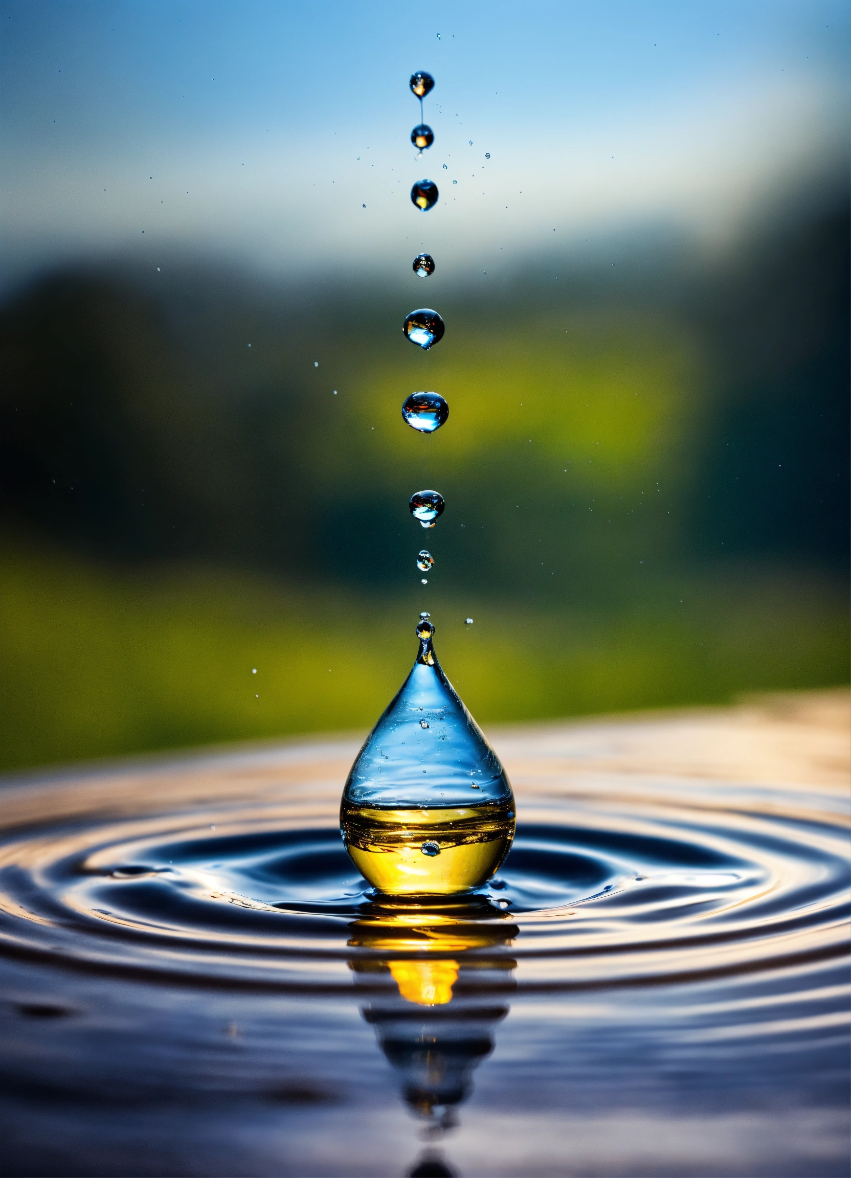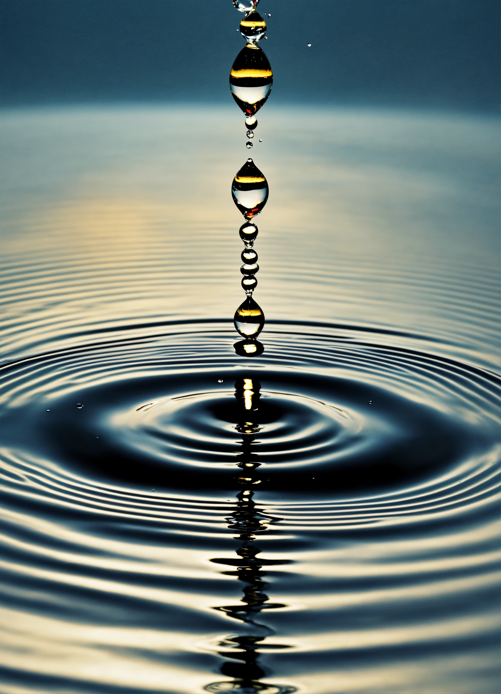 One drop of water falling on a liquid surface, causing a ripple. the drop transforms into various shapes as it bounces on and off the surface.
