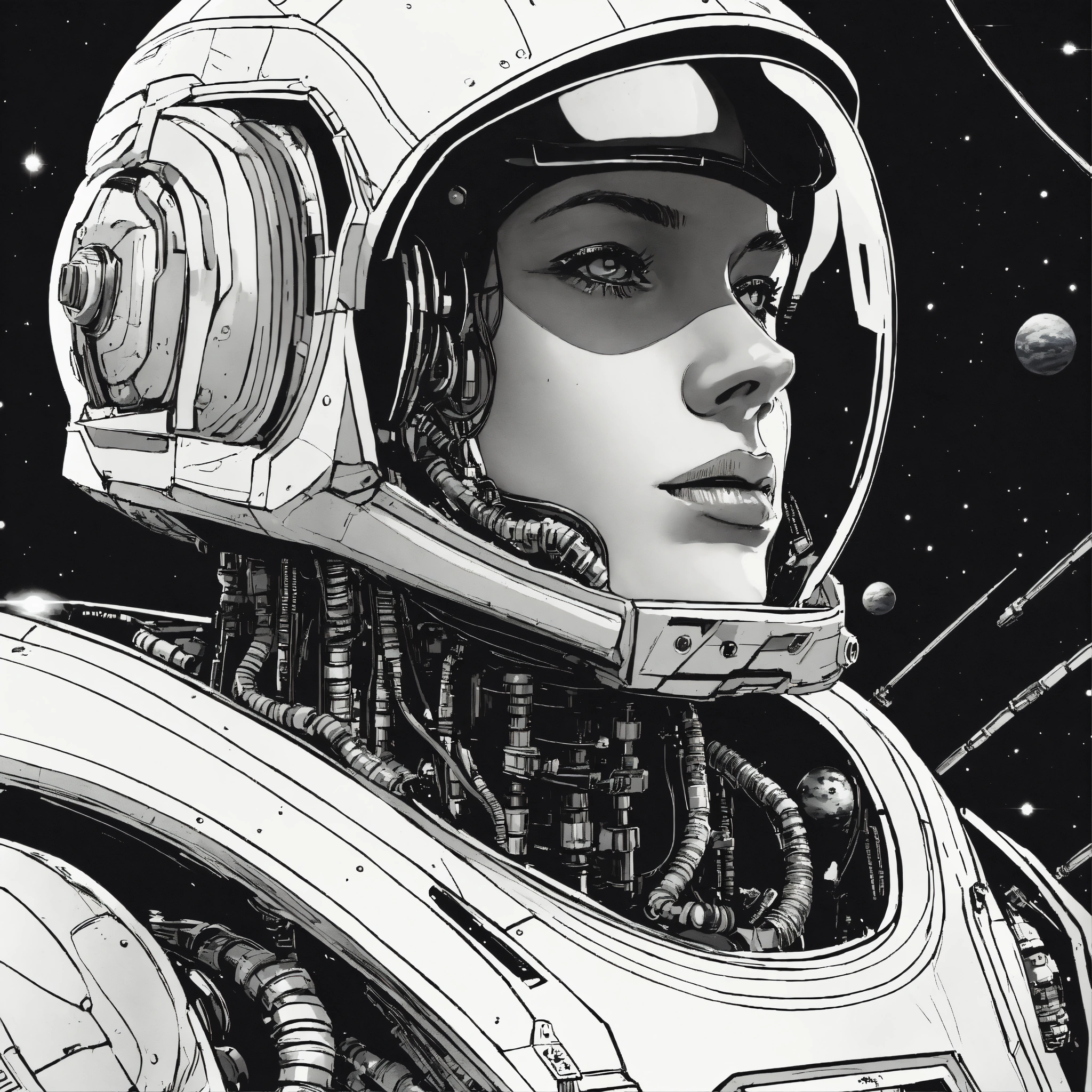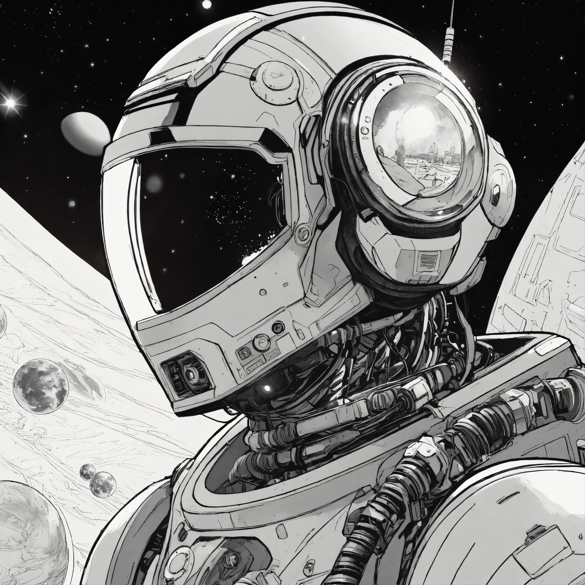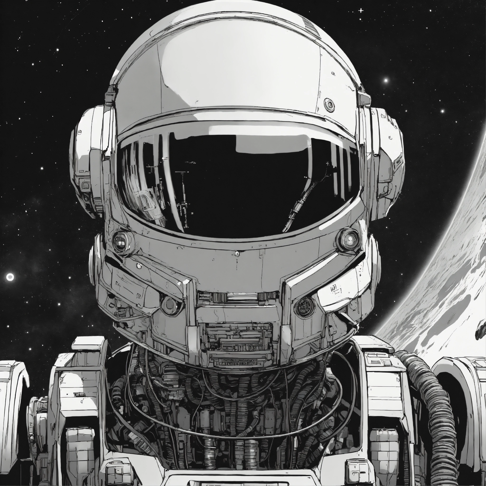 A comic book panel about robots taking over the world, detailed comic art. comic book cover art. photorealistic ink art. mnimal, close up androids face, visor reflecting planets, minimal wires coming off helmet, black & white, in space