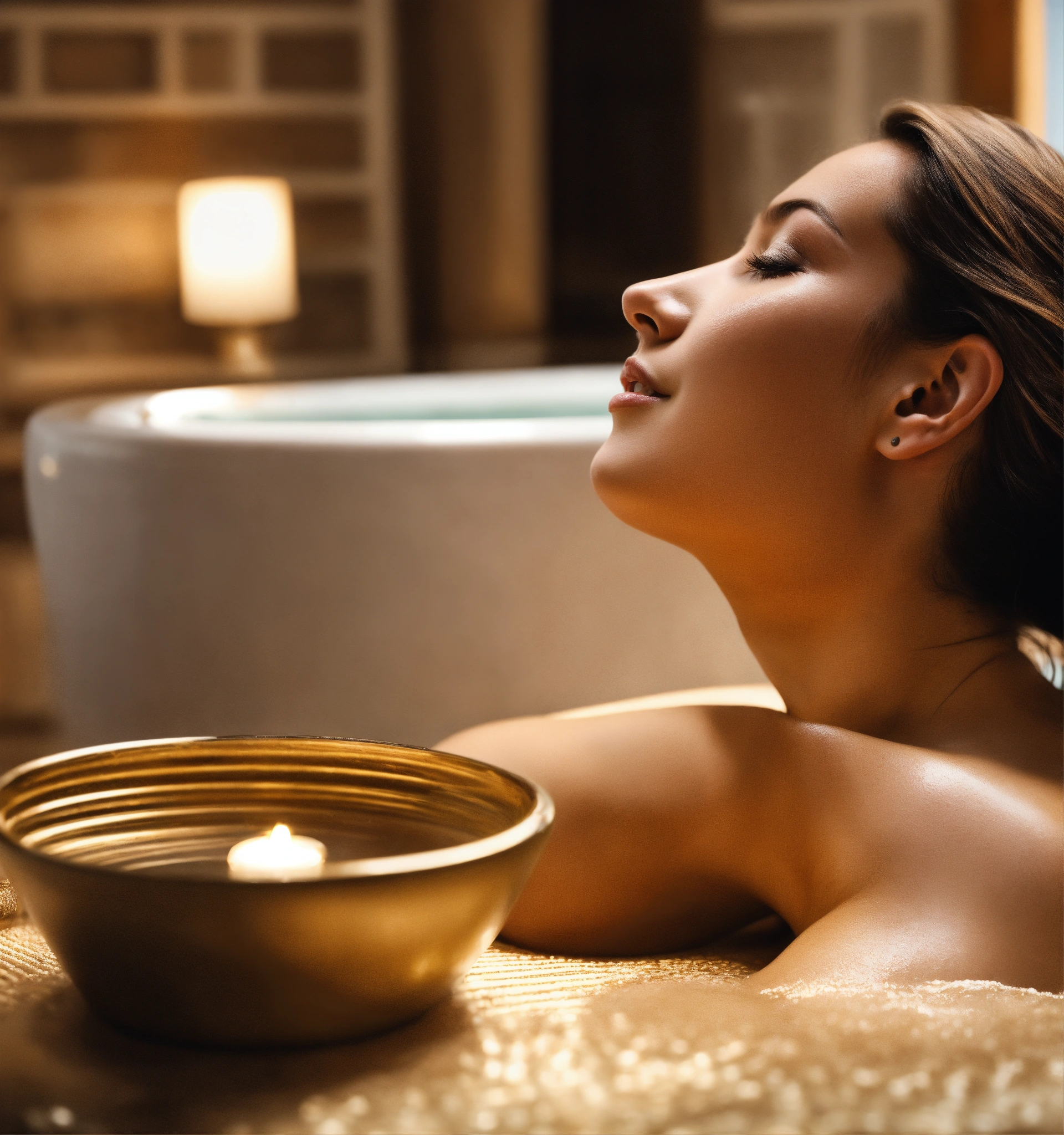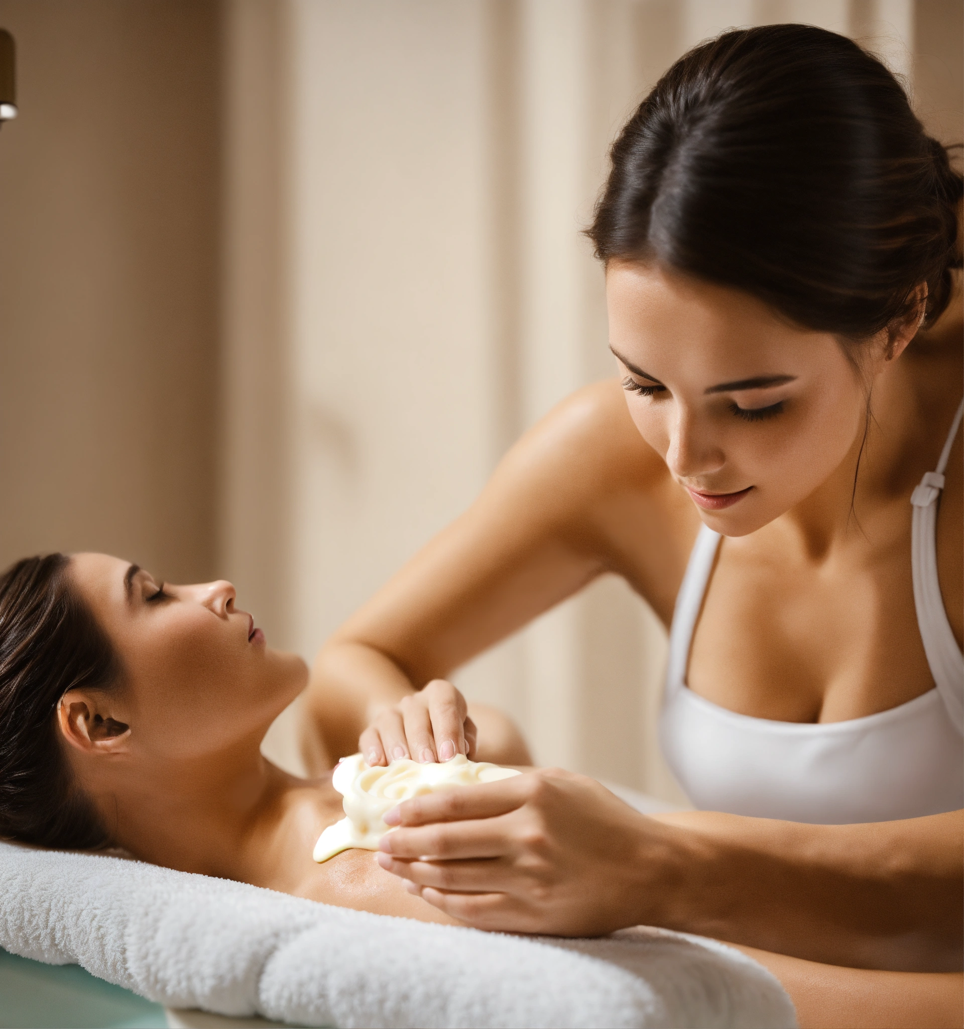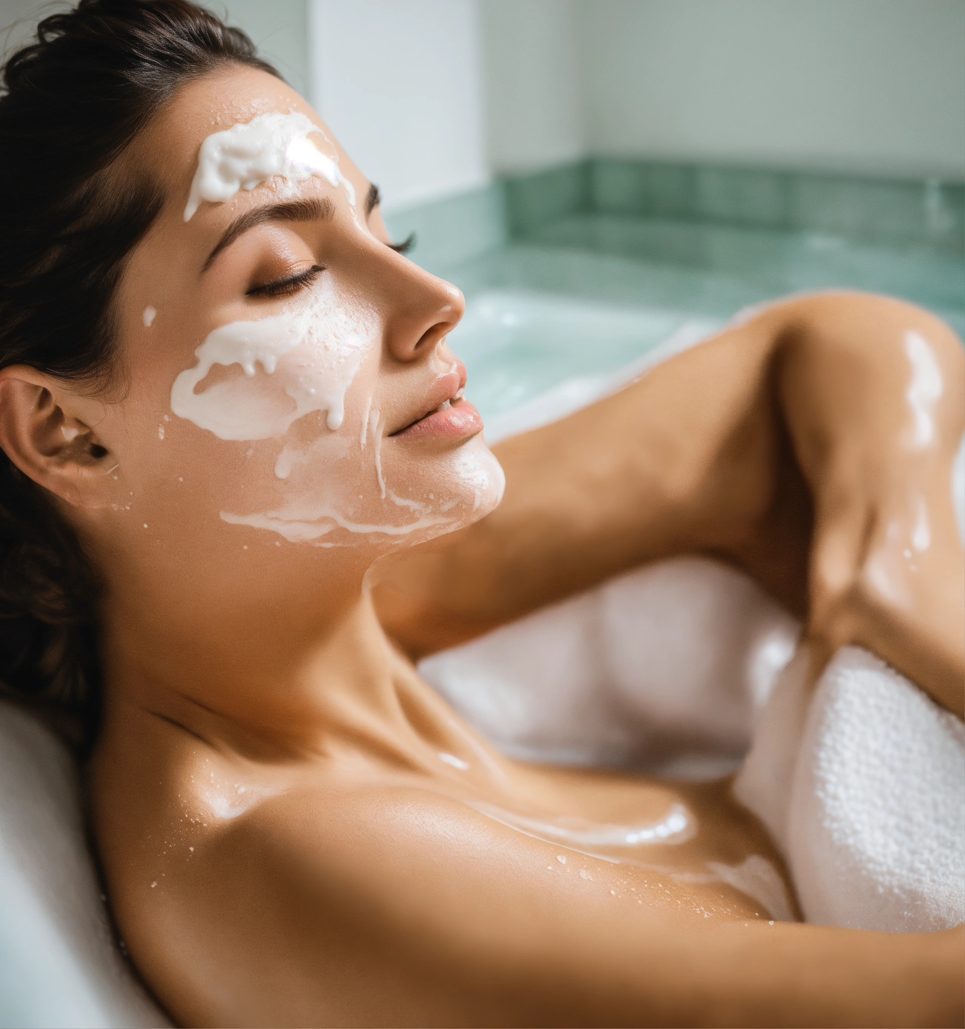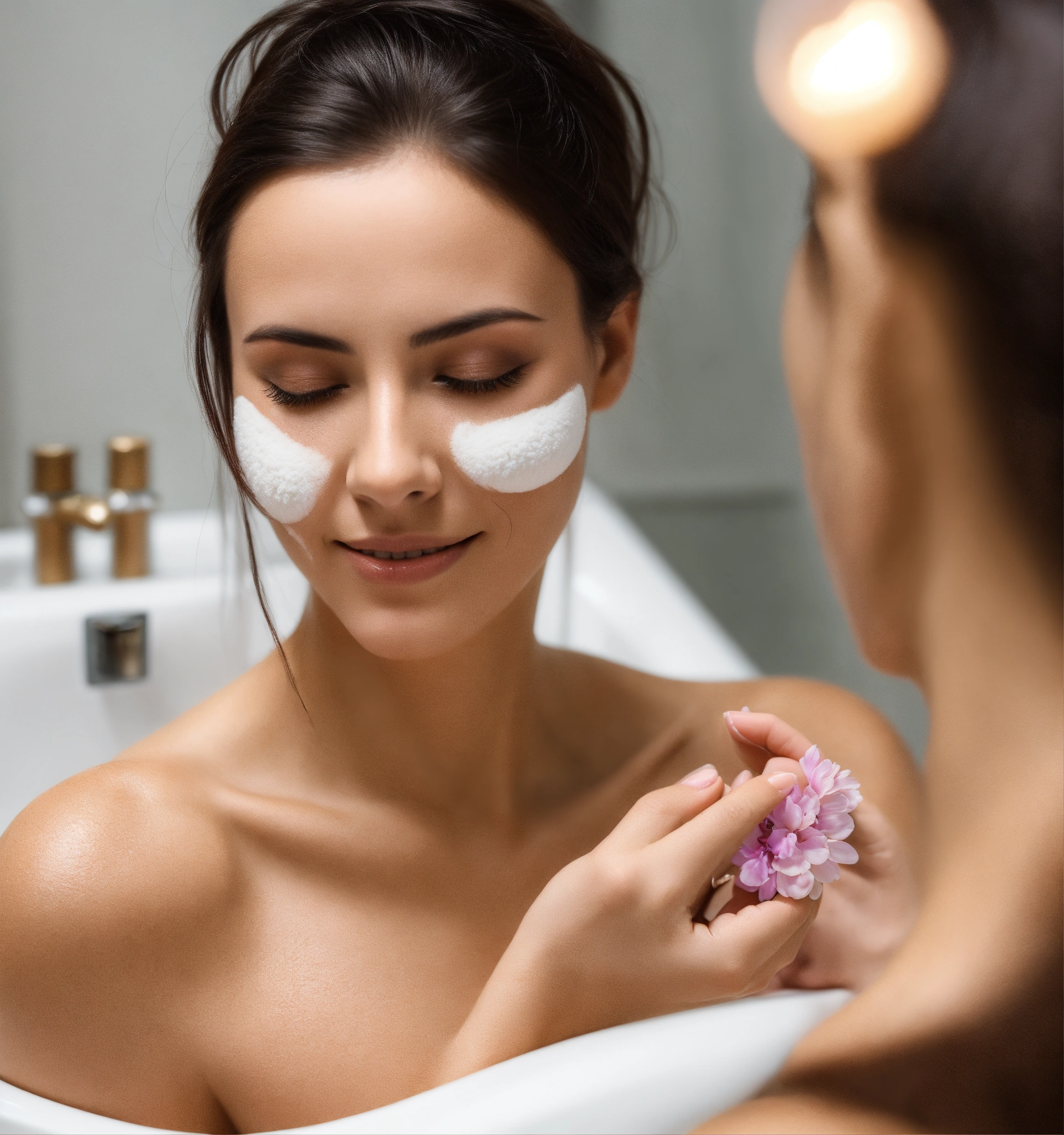 Donna matura che si massaggia con la mano una crema sul viso con soddisfazione davanti allo specchio del suo bagno