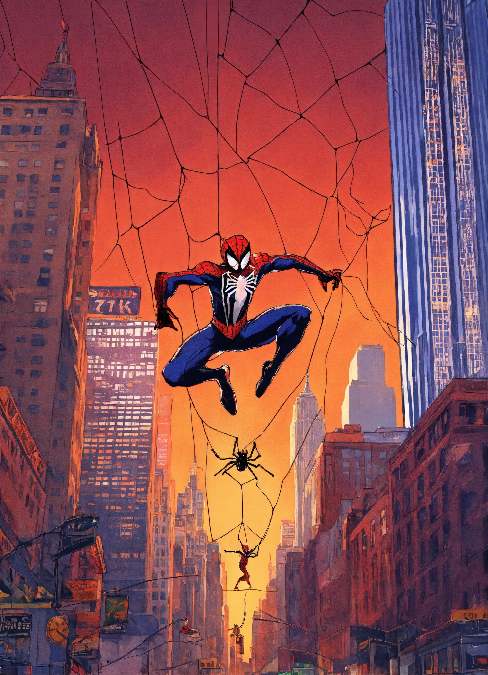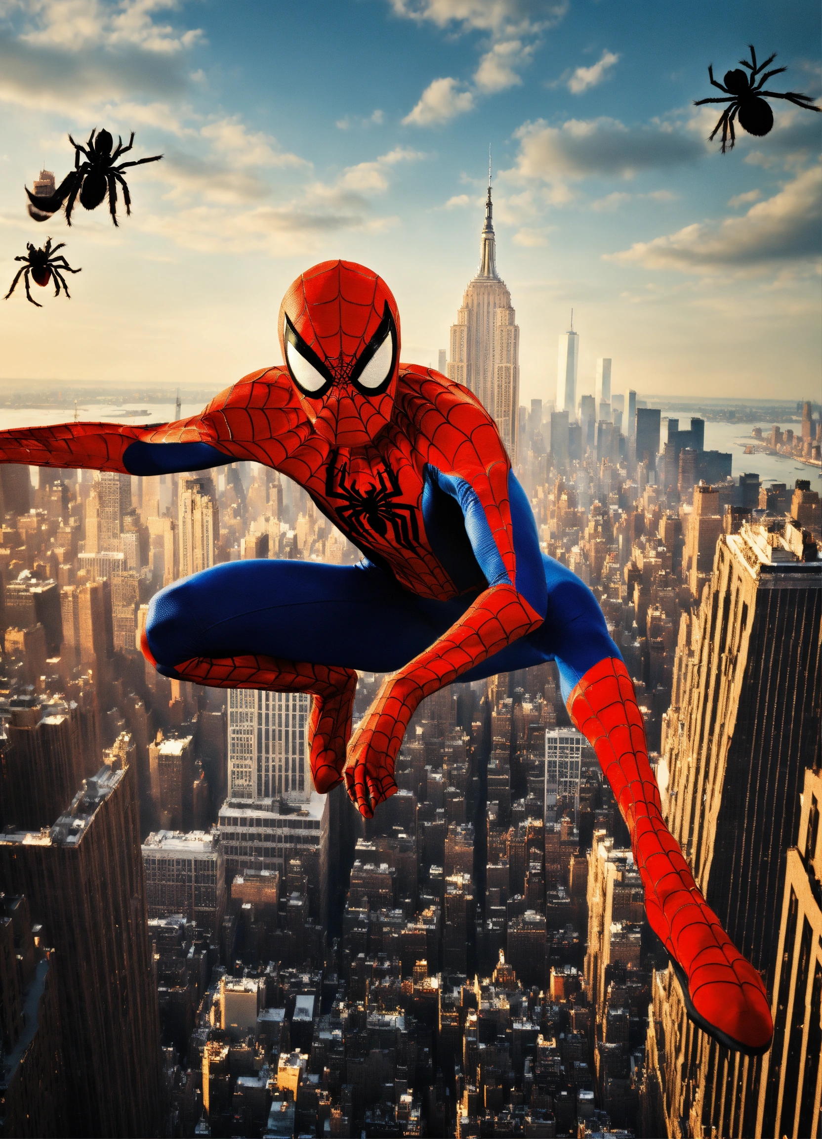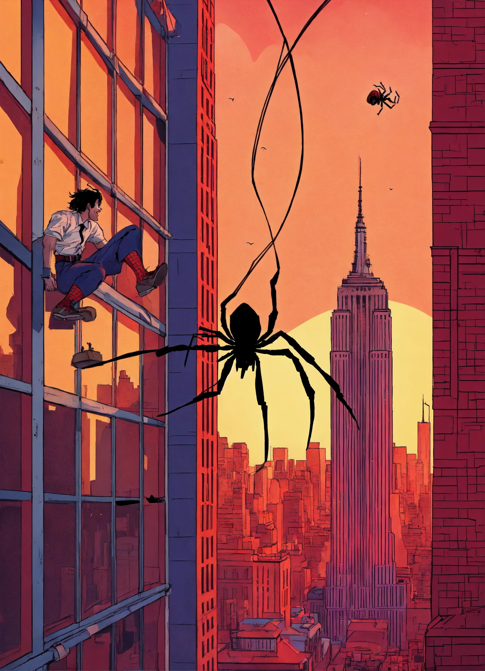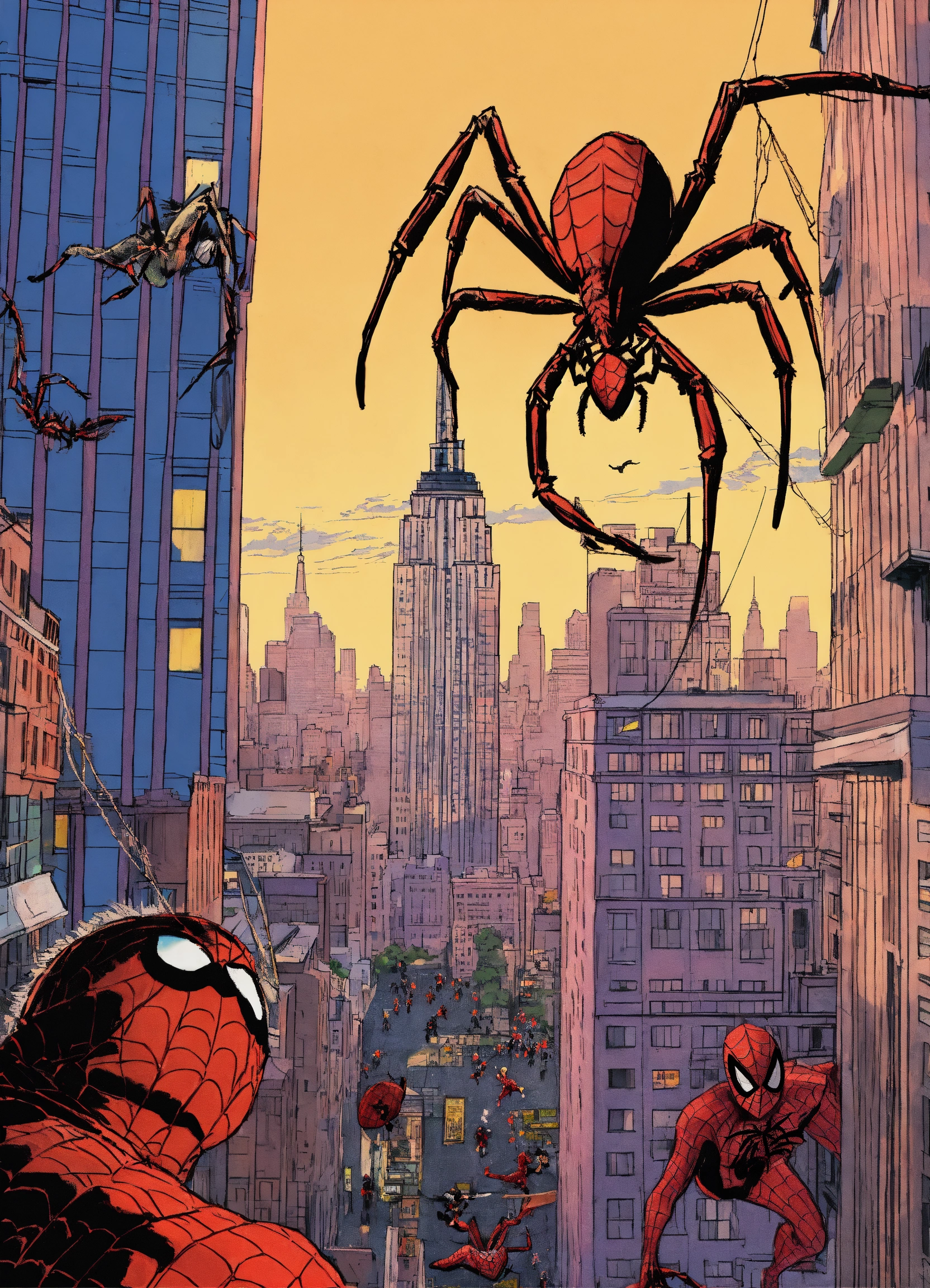 Giant spider fighting joker, red and hairy, crawling around, in new york city, empire state building, people running away from the spider, spiderman swinging past, holding onto the giant spider