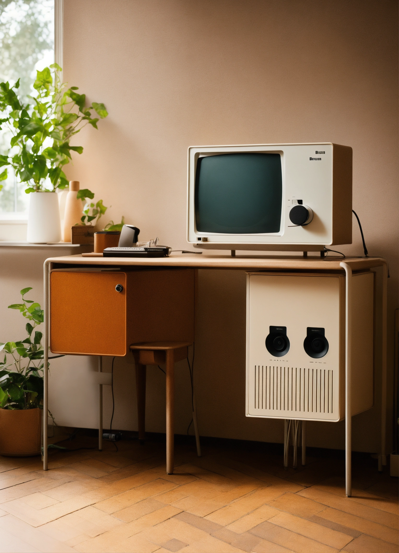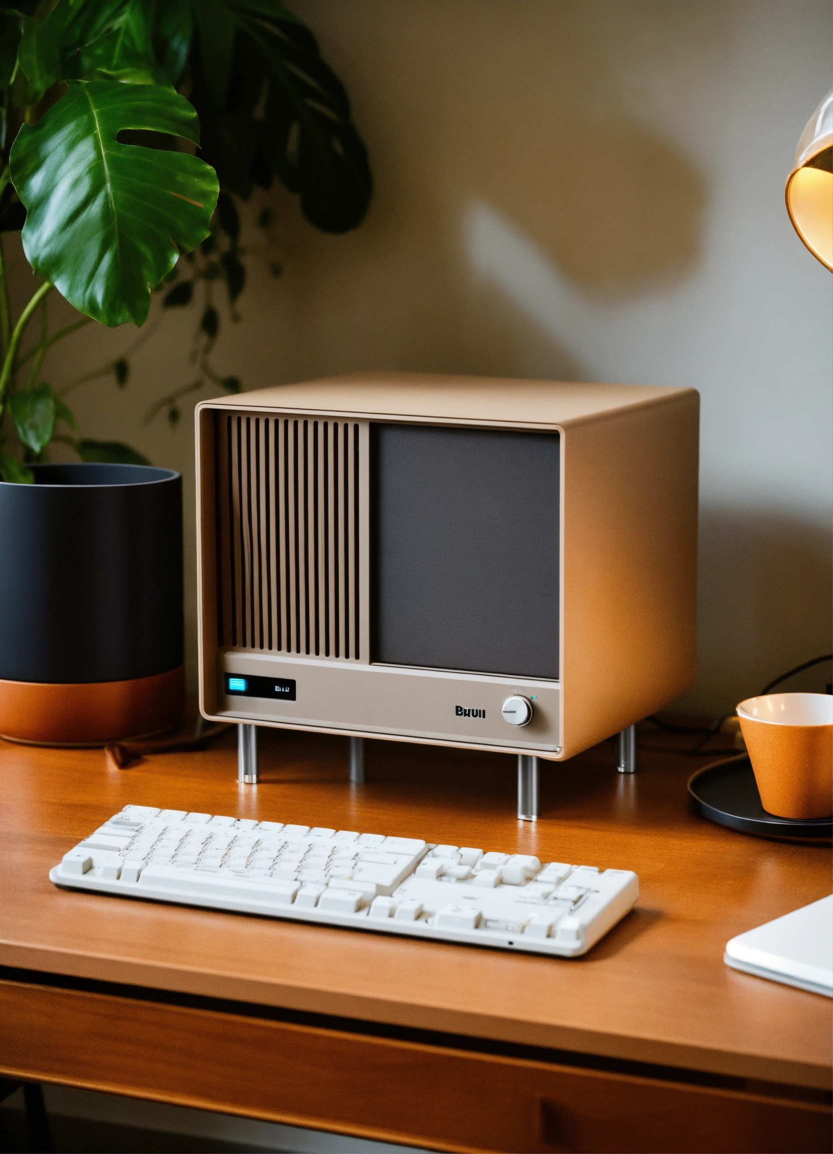 A stunning minimal pc case designed by dieter rams, braun. product ad retro. industrial design inspiration, warm retro natural lighting, on desk, natural scene in the home.