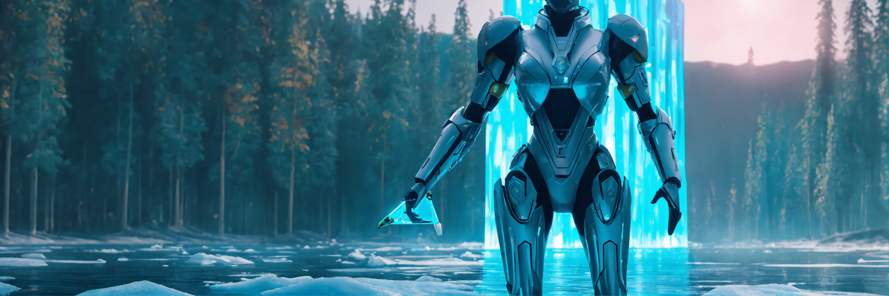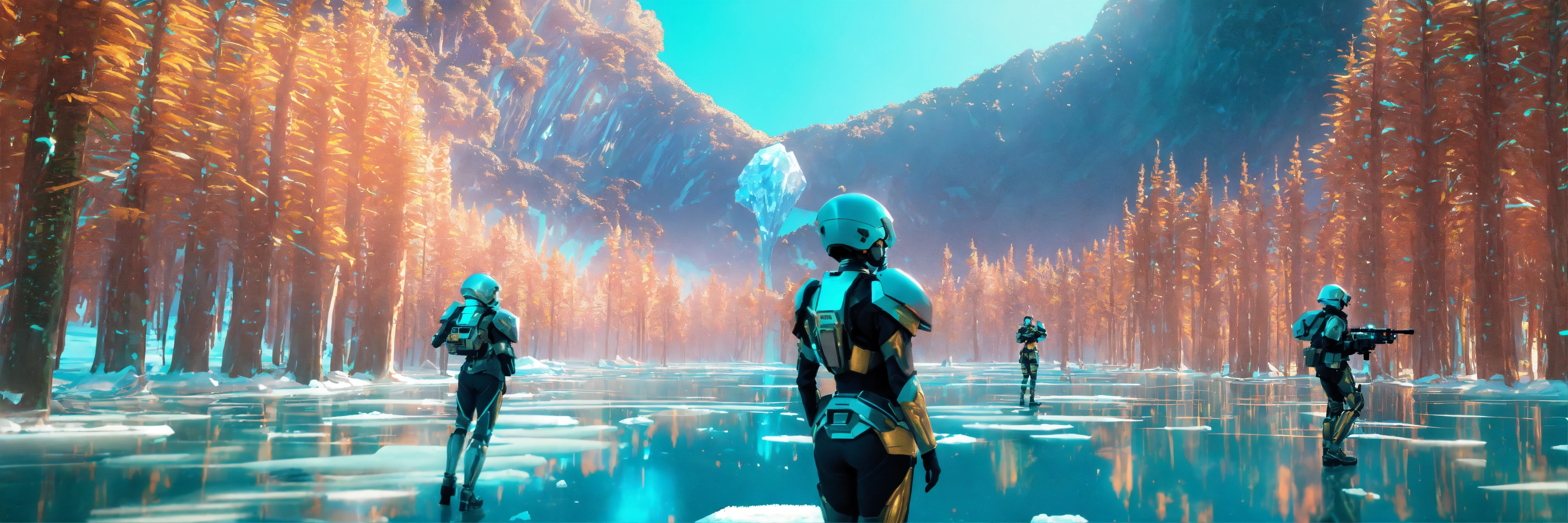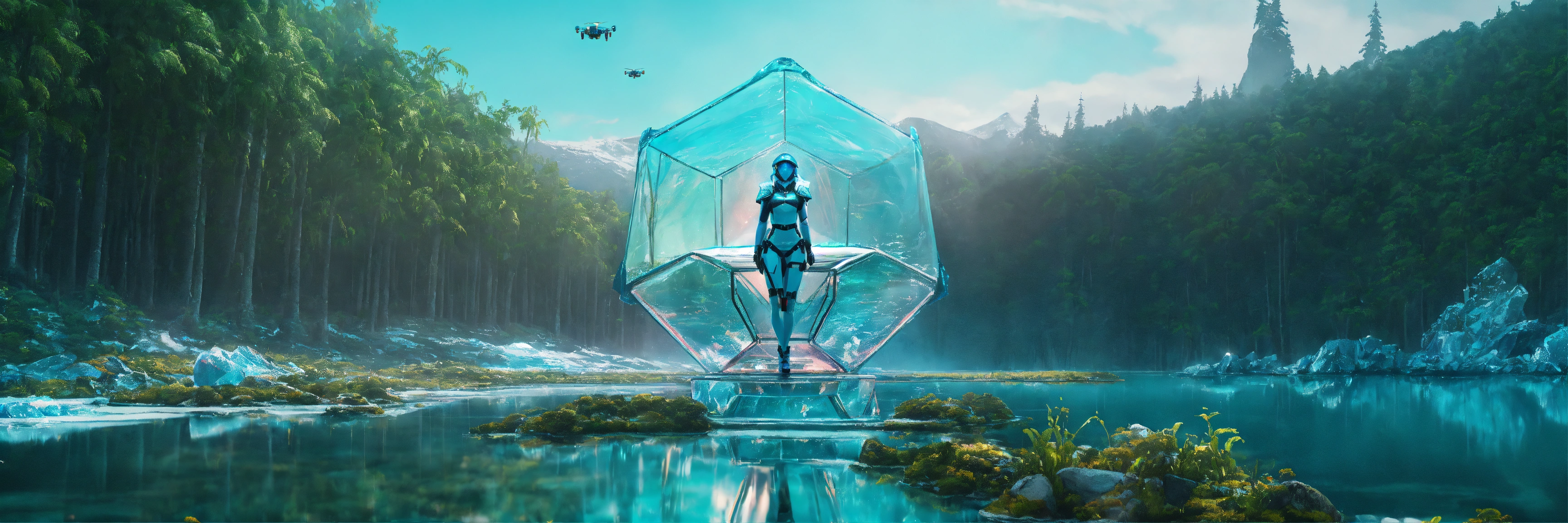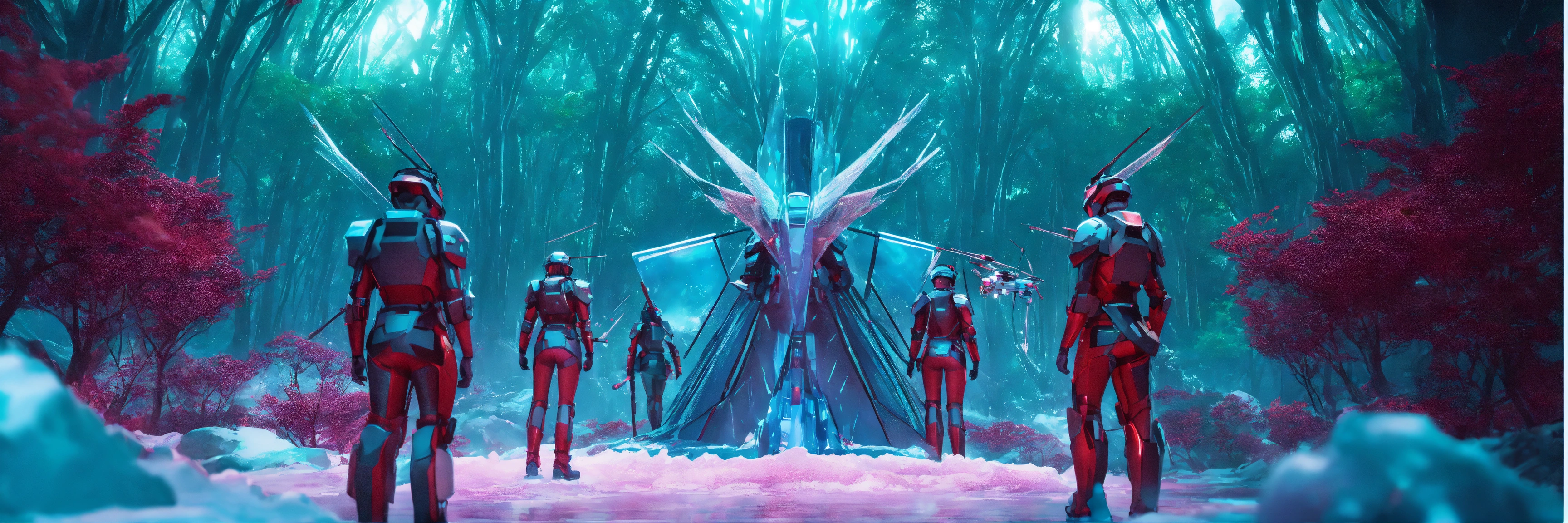 Full body upclpse.of a beautiful female queen and drone shot of an elite army of very detailed hd futuristic soldiers in a lush glass forest surrounded by ice lakes 8k, vray, super detailed, iridescent